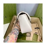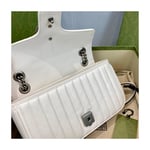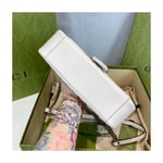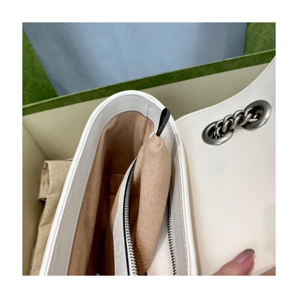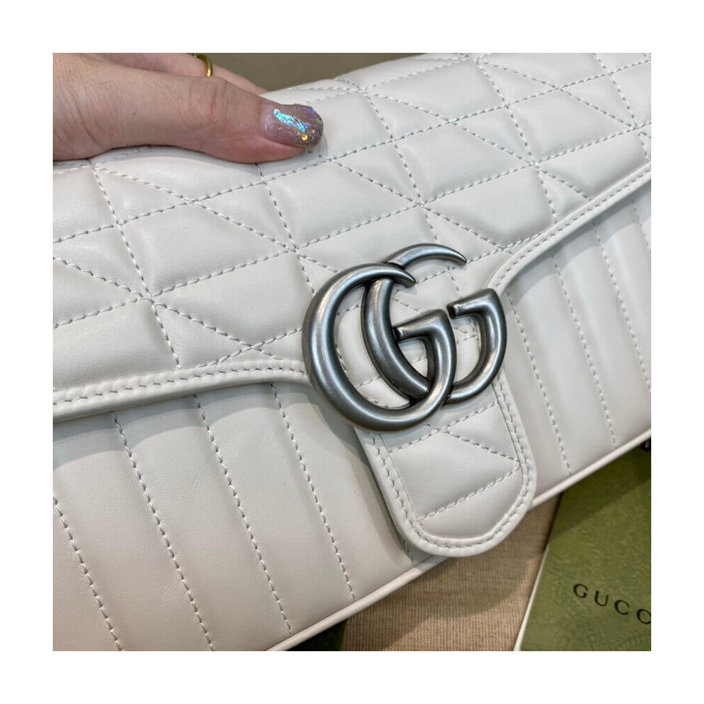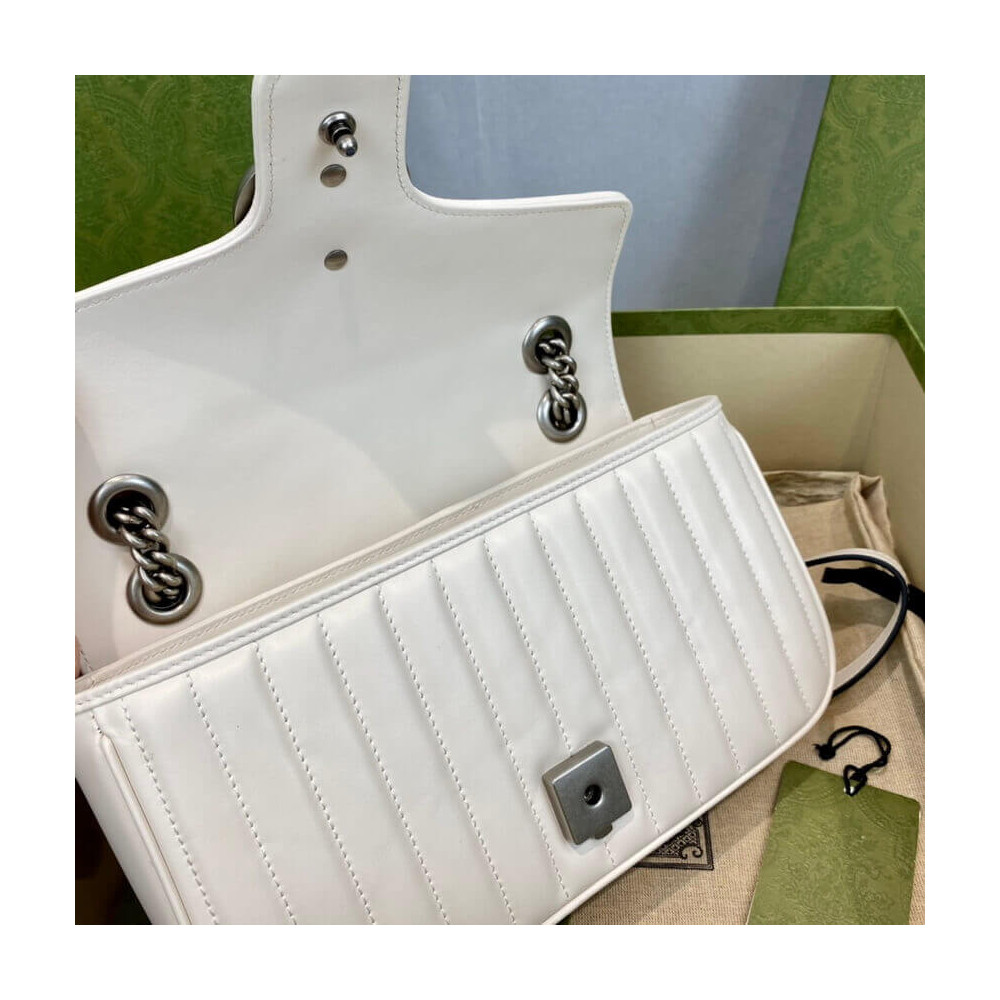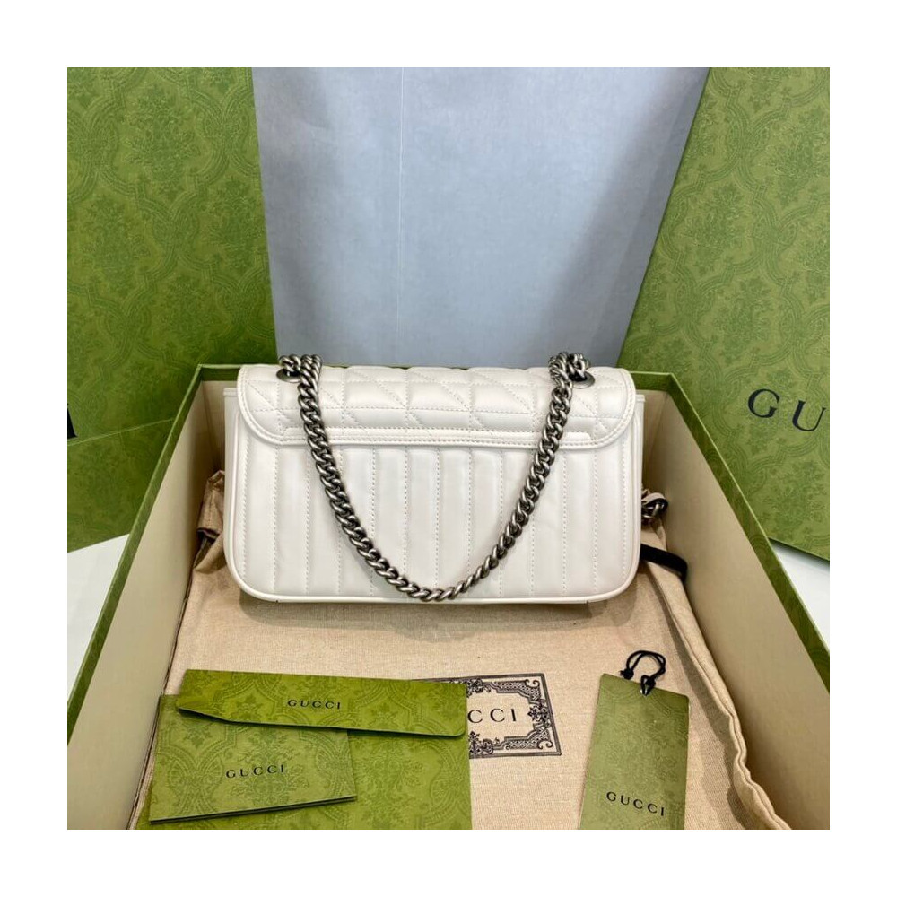 The Gucci Aria collection is an exploration of the House’s most emblematic codes and symbols. A member of the Beloved family, the GG Marmont is synonymous with its matelassé leather and monogram hardware. Here, the small shoulder bag is reimagined with a new geometric take on its signature finish that combines vertical and diagonal motifs.