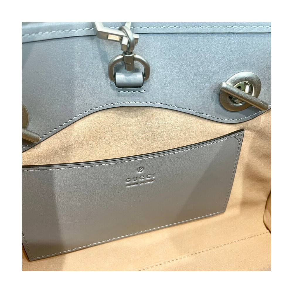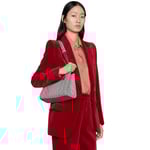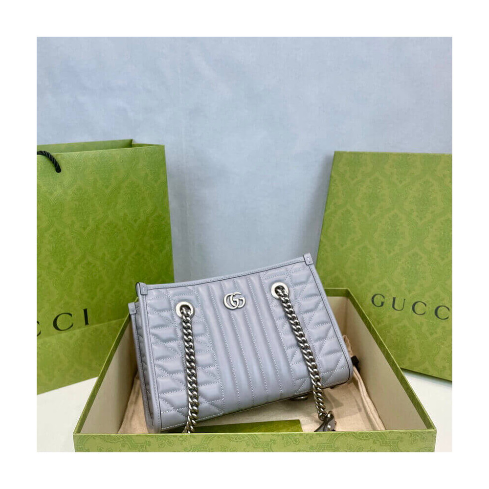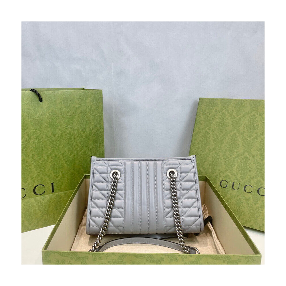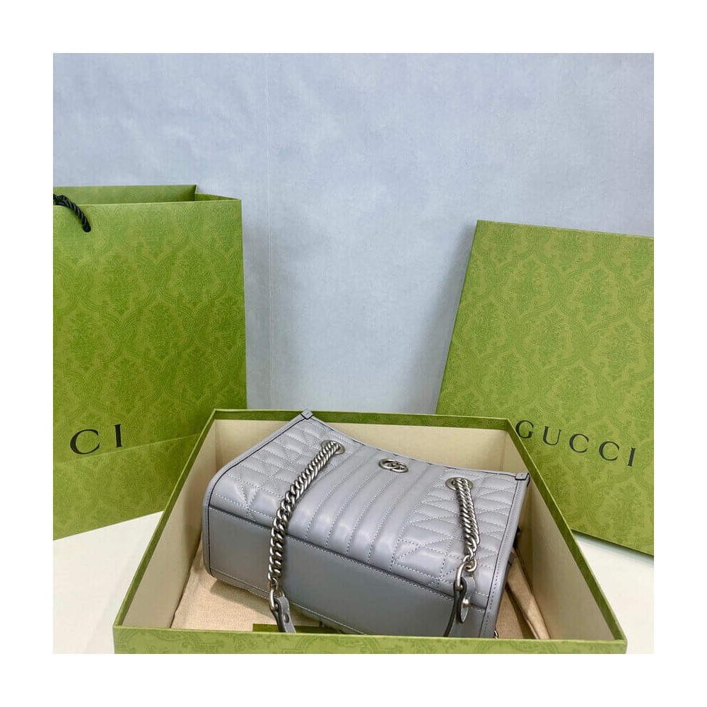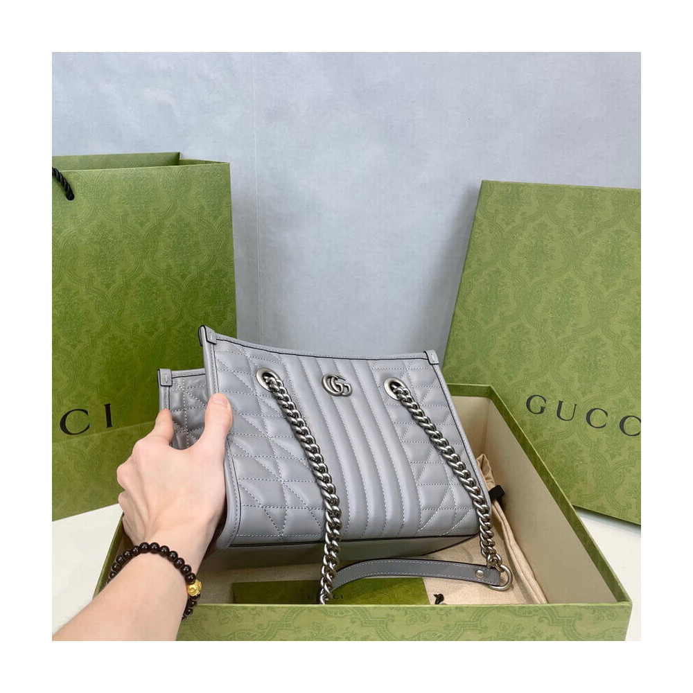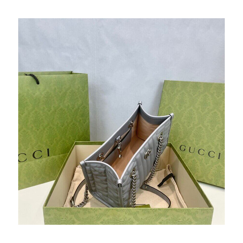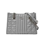The GG Marmont collection is defined by the emblematic Double G hardware—a contemporary take on a Gucci archival belt buckle from the ’70s that has become a hallmark of the House. Here, the design is reinterpreted as antiqued silver-toned hardware atop this small tote bag in soft white matelassé leather.