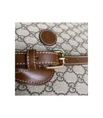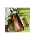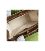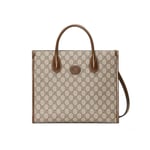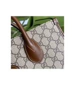 Designed with a structured silhouette, this small tote bag is crafted from beige/ebony GG Supreme canvas with brown leather trim. Featuring both top handles and a shoulder strap, it offers versatile carrying options. The interior includes two zip pockets for secure organization.