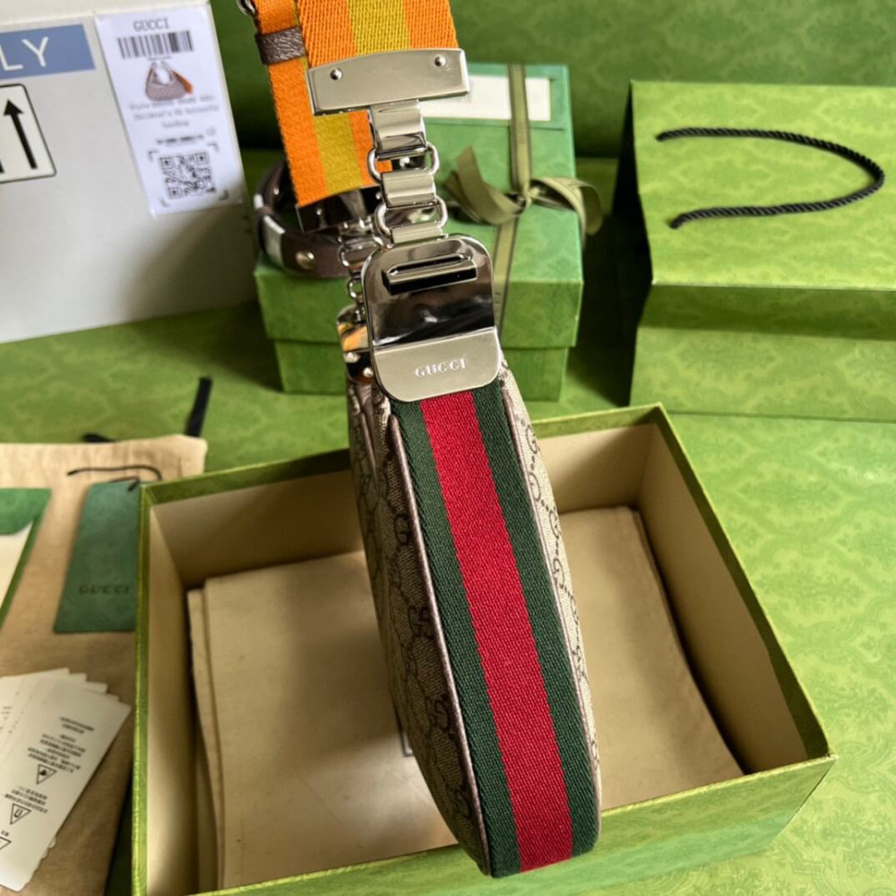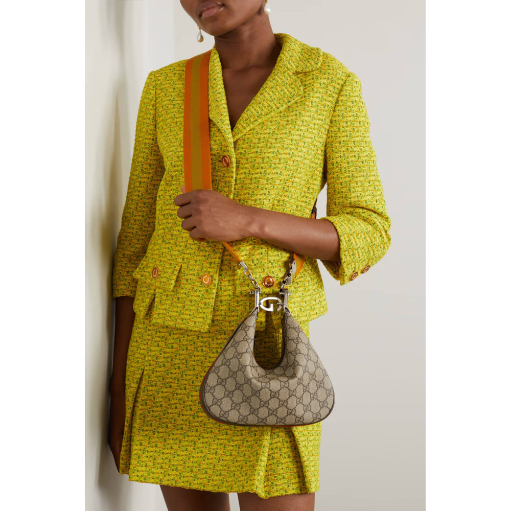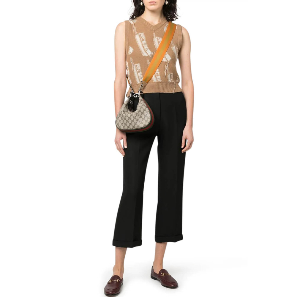 An ode to the timeless Hollywood glamour that shaped Gucci Love Parade, classic elements from the House’s archives are reintroduced. Distinguished by its crescent moon shape, the accessory is further defined by a G shaped hook closure. Paired with soft materials, the heritage hardware creates a refined design with vintage appeal. This small version is crafted in beige and ebony GG Supreme canvas with brown leather trim.