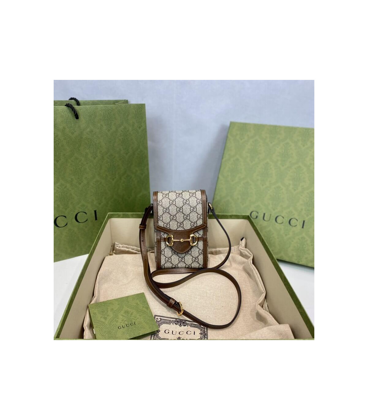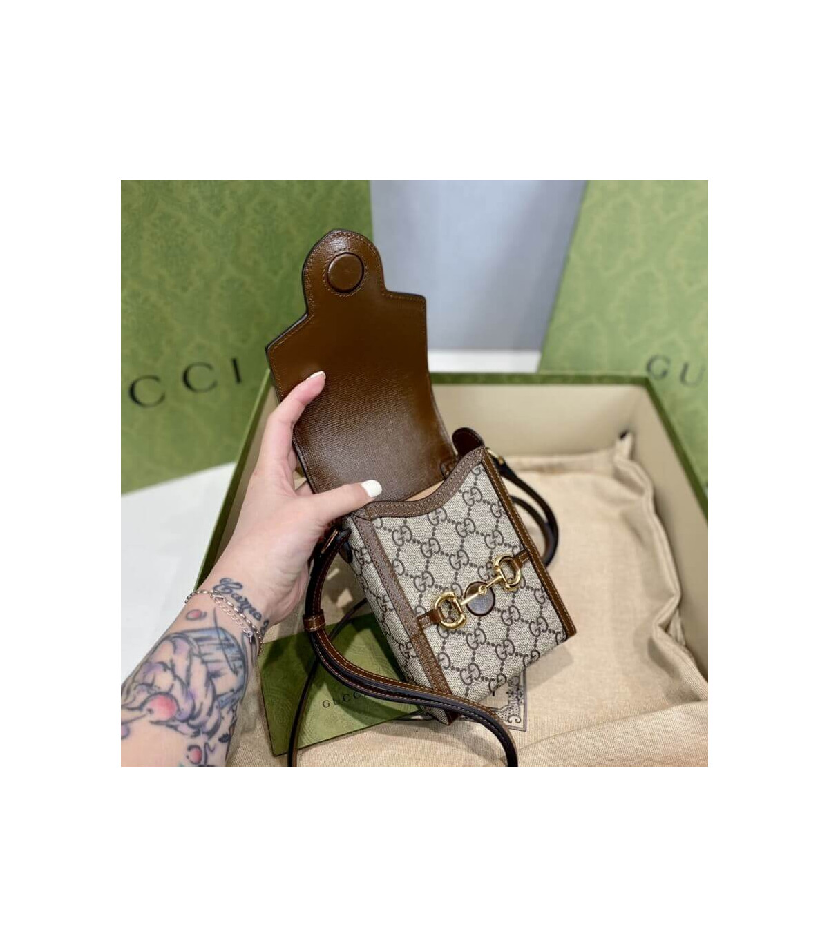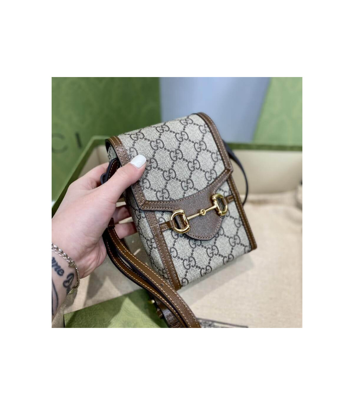 Presented in a petite rectangular shape, the Gucci Horsebit 1955 mini bag is introduced in the House’s monogram canvas. Inspired by archival designs, the accessory highlights the double ring and bar design that has been established as one of the most distinctive elements among the House symbols borrowed from the equestrian world. Pieces with versatile ways to wear and style embrace each person who is part of the House’s individual spirit.