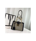 A structured shoulder bag crafted from beige/ebony GG Supreme canvas with black leather trim and shiny gold-toned hardware. Features a key lock closure inspired by archival designs, with a detachable leather key case. Two interior open pockets and a chain strap complete the look.