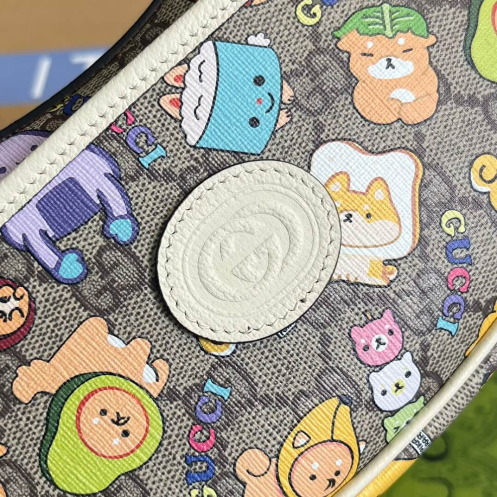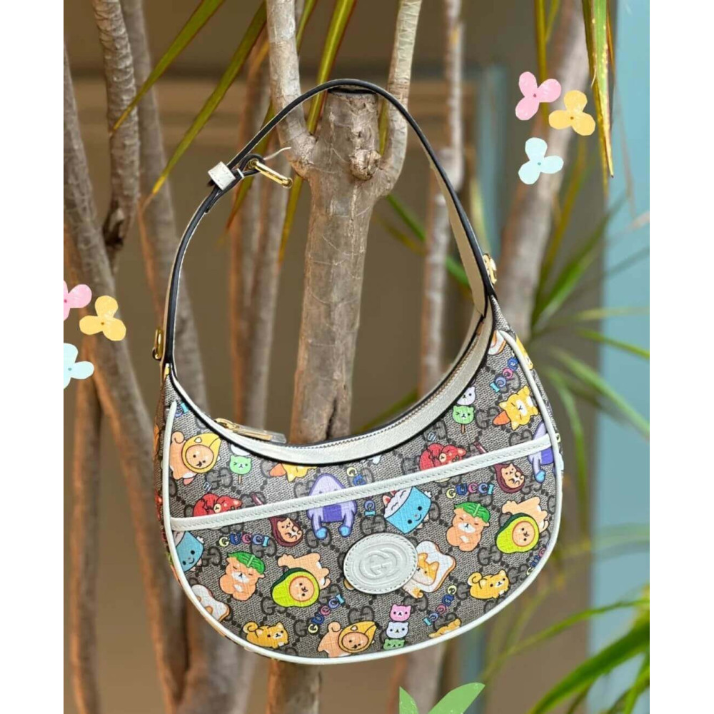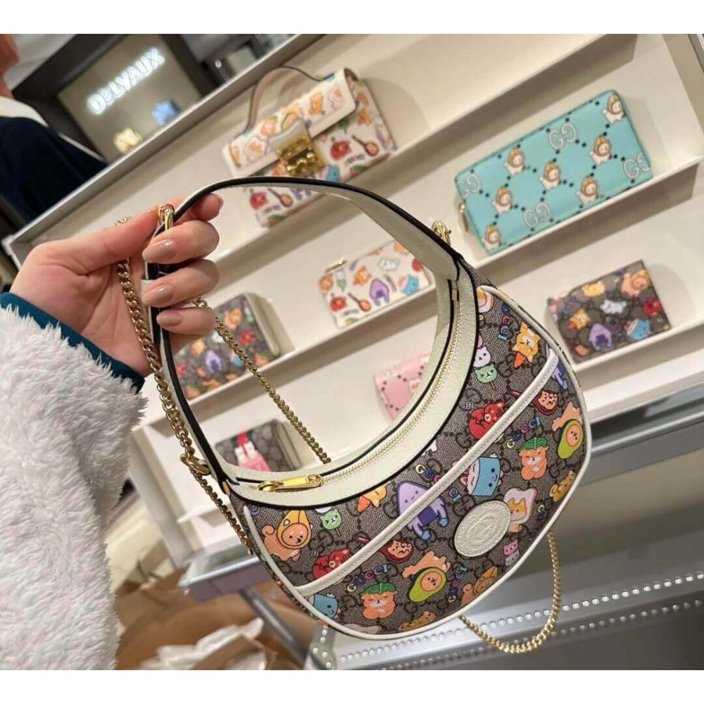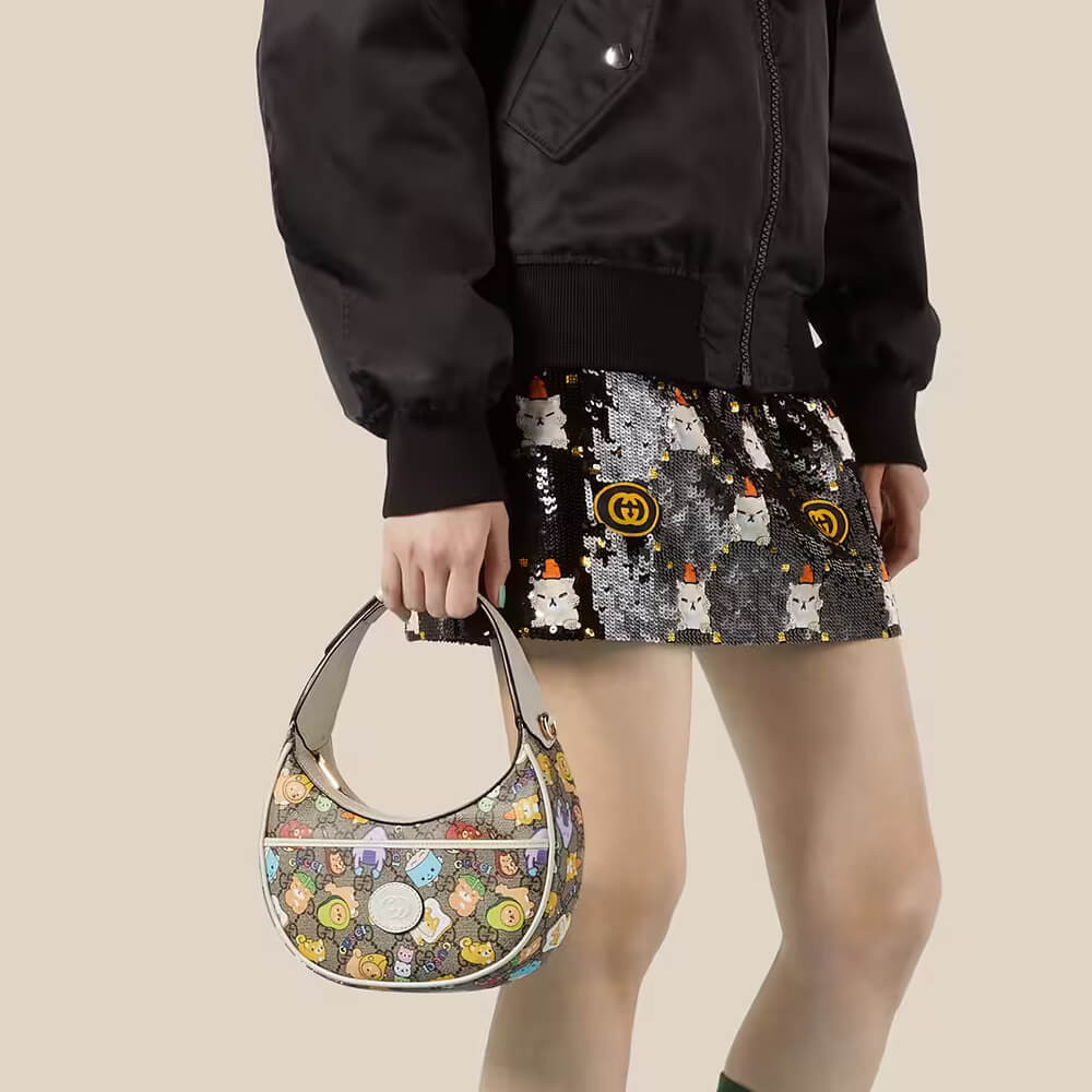 The artwork by America-based illustrator and designer, Angela Nguyen, also known as ‘Pikarar’, adds a playful touch to ready-to-wear pieces and accessories with vibrant prints or embroideries inspired by pop culture, anime, and animals. Here this mini bag is defined by a Gucci animal print.