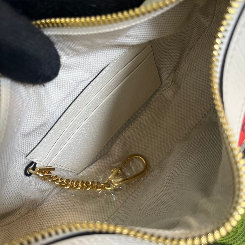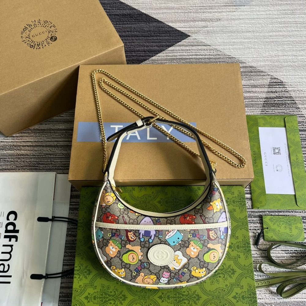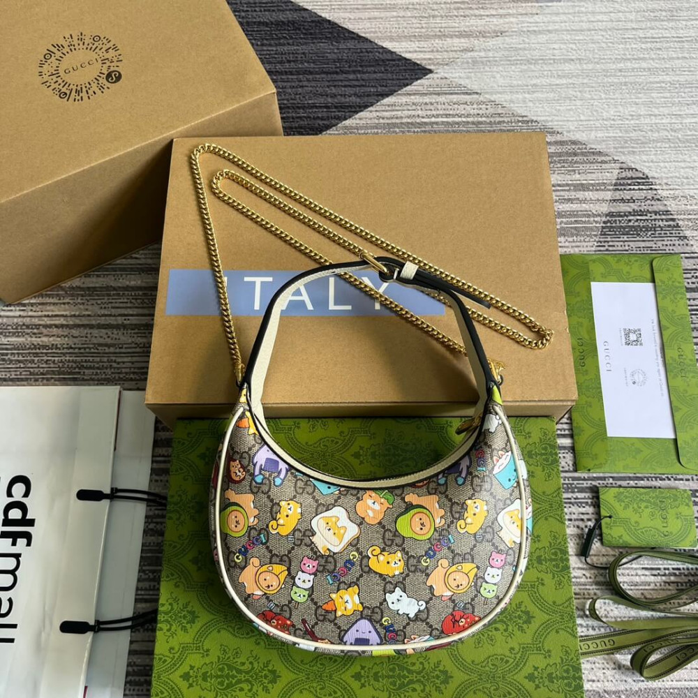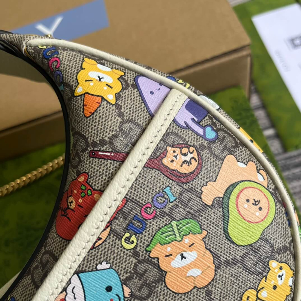 The artwork by America-based illustrator and designer, Angela Nguyen, also known as ‘Pikarar’, adds a playful touch to ready-to-wear pieces and accessories with vibrant prints or embroideries inspired by pop culture, anime, and animals. Here this mini bag is defined by a Gucci animal print.