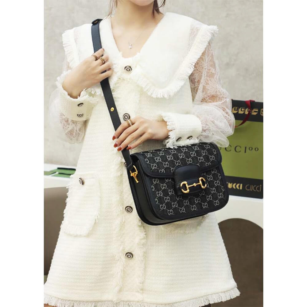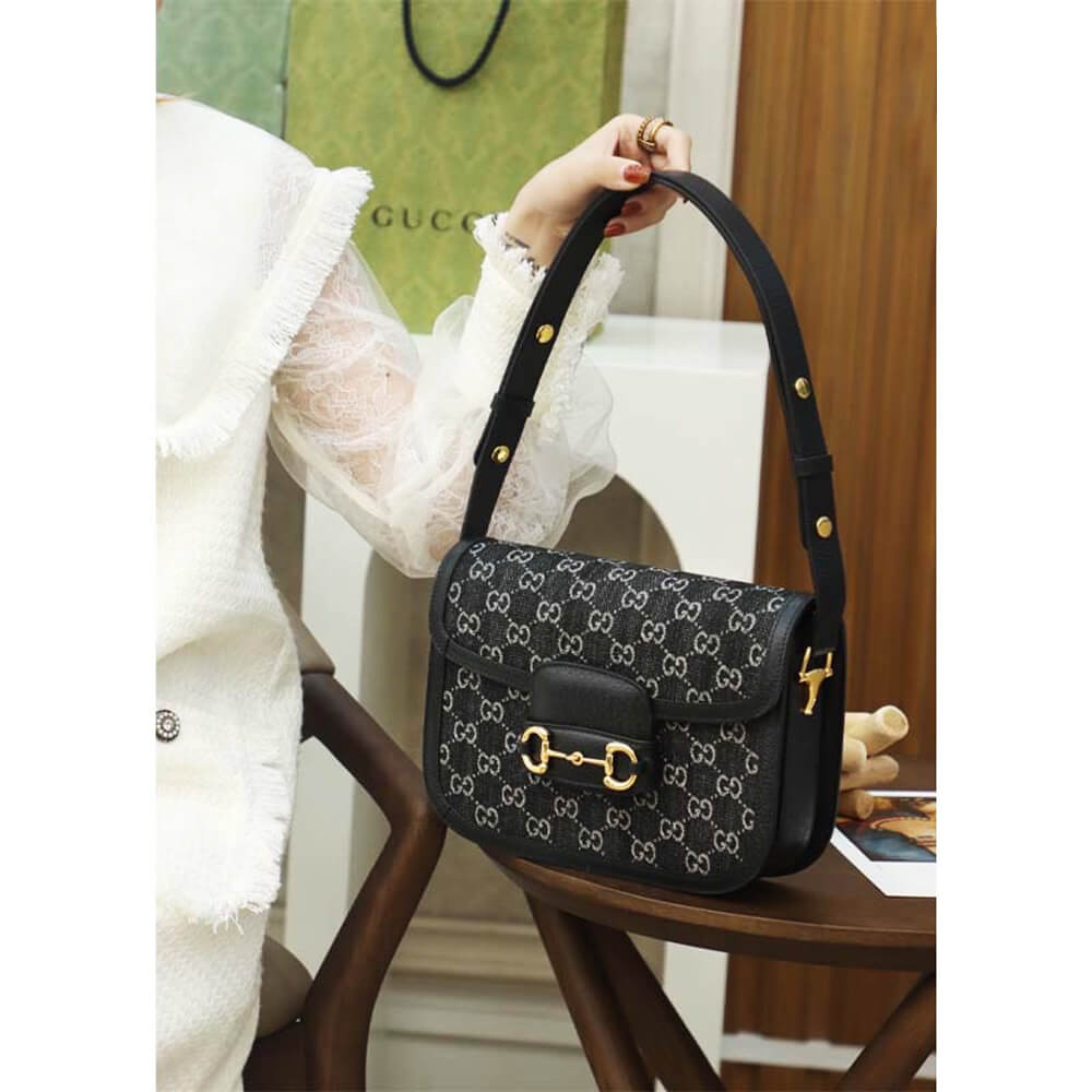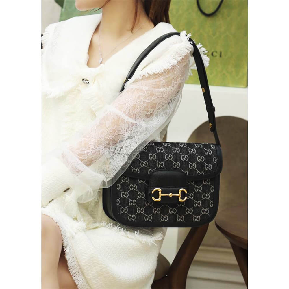 A historic design, the Gucci Horsebit 1955 shoulder bag is reimagined in denim. A message about leaving fashion’s old rules behind, the House’s designs convey the idea that pieces should be timeless–not just in fashion for one season. Speaking to this theme, the emblematic style is linked to the Gucci’s rich history by the recognizable Horsebit hardware and monogram motif.