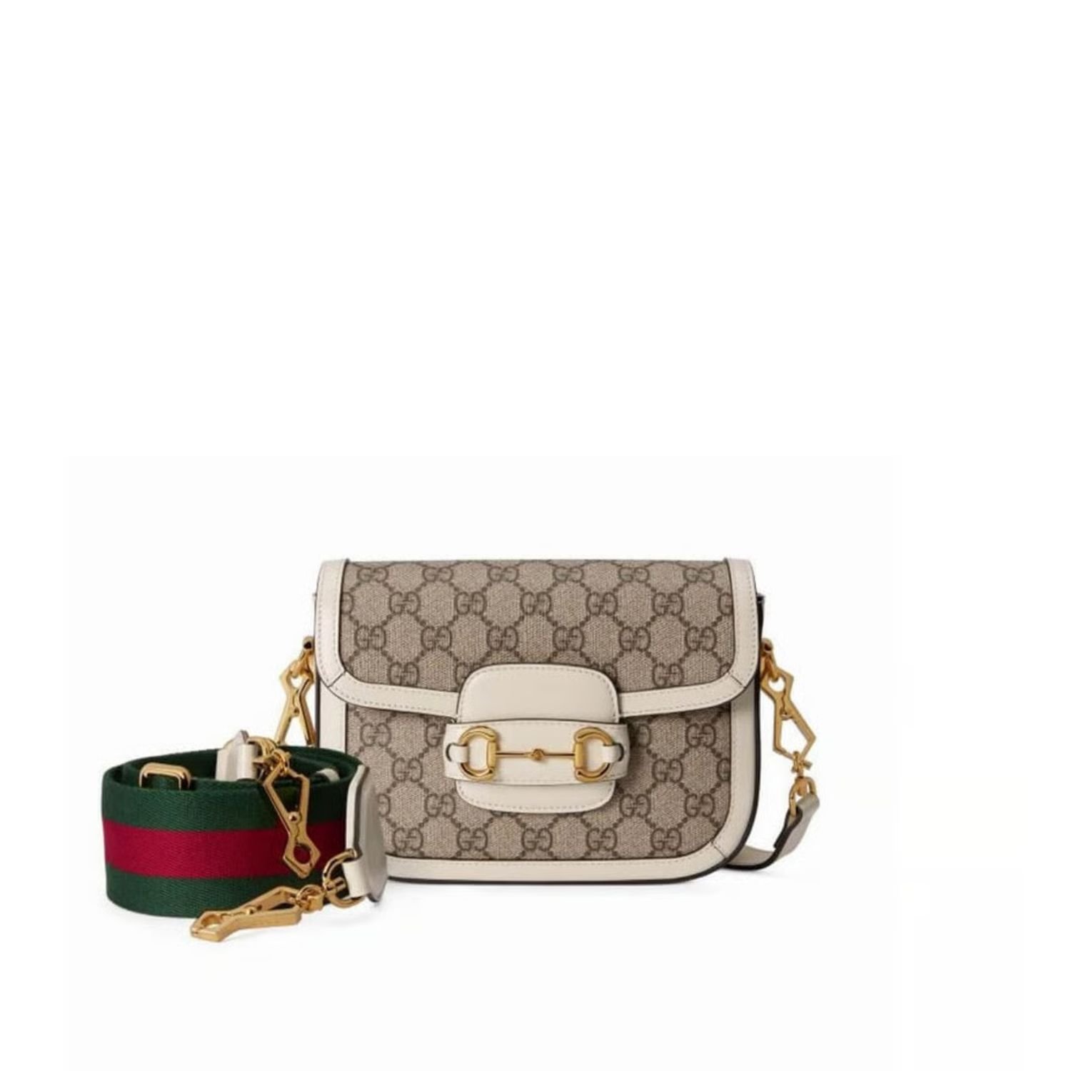 This petite version of the Horsebit 1955 reinterprets a vintage classic with modern versatility. Crafted from beige/ebony GG Supreme canvas with white leather trim, the bag comes with two detachable straps—one tonal leather for elegant wear, and one green-red Web for a bold, logo-driven look. Finished with gold-toned hardware and the signature Horsebit detail.