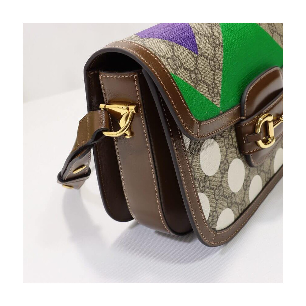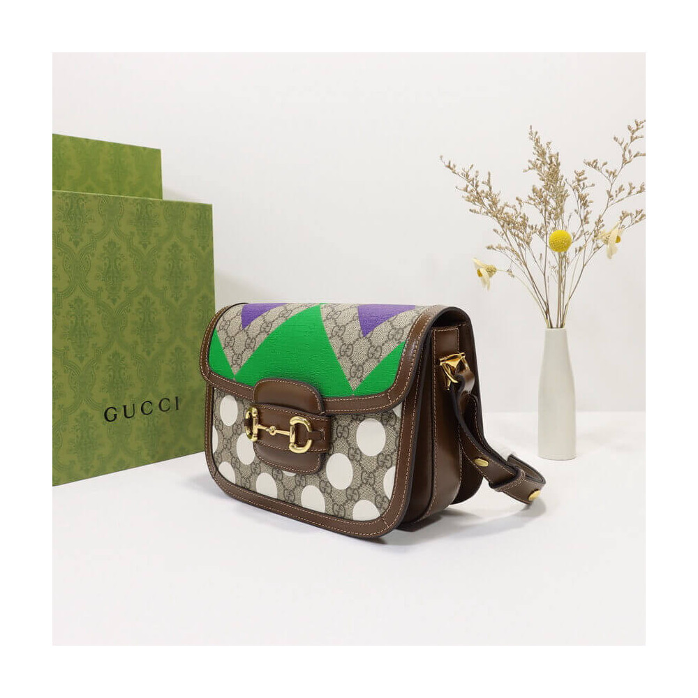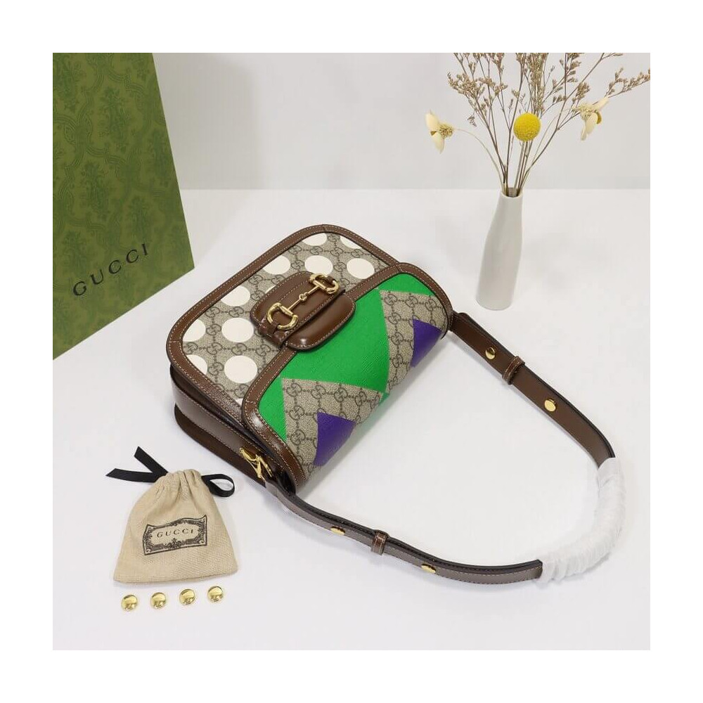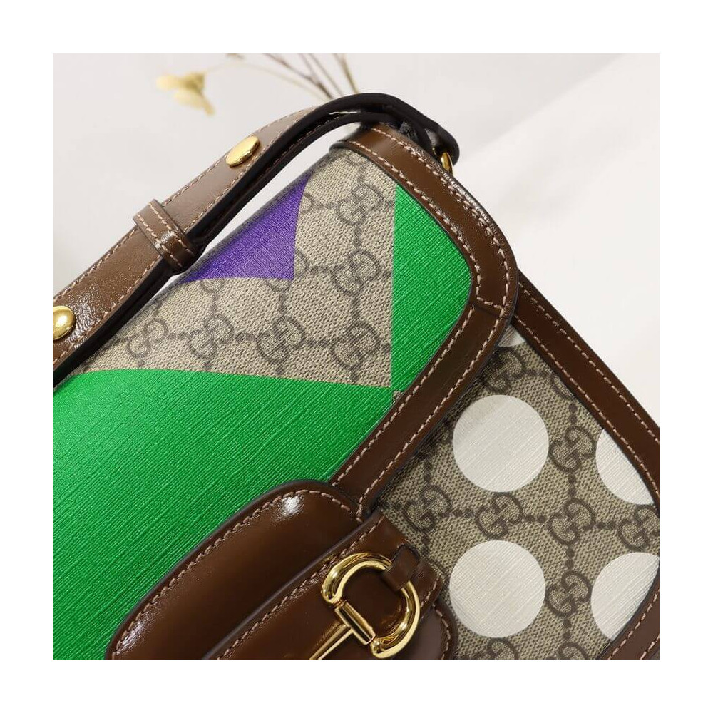 This item features bright and colorful geometric motifs that recall the uniforms worn by horse riding jockeys. The collection is inspired by the Parade Ring, or paddock, where horses walk around as a warm-up before the race and to help racegoers pick a winner. Here the print appears on this Gucci Horsebit 1955 shoulder bag.