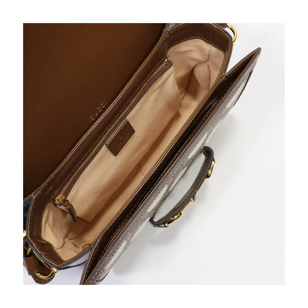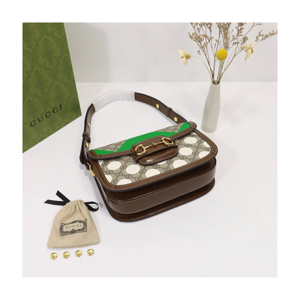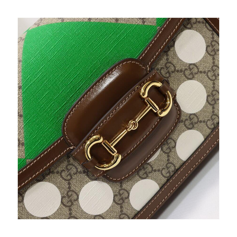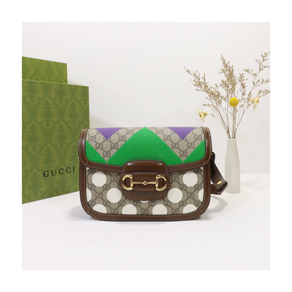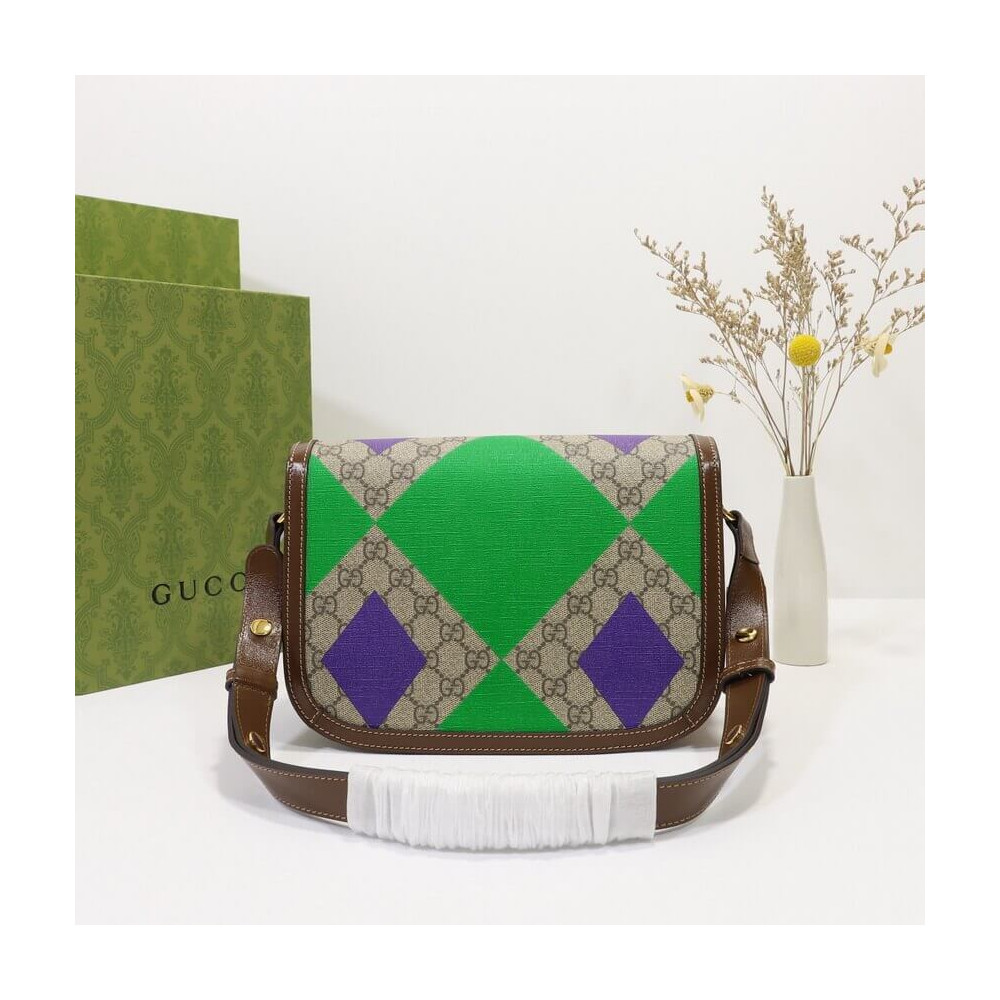 This item features bright and colorful geometric motifs that recall the uniforms worn by horse riding jockeys. The collection is inspired by the Parade Ring, or paddock, where horses walk around as a warm-up before the race and to help racegoers pick a winner. Here the print appears on this Gucci Horsebit 1955 shoulder bag.
