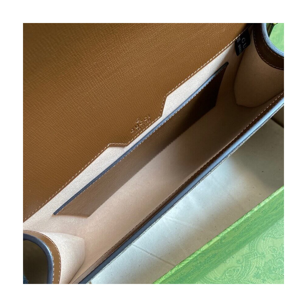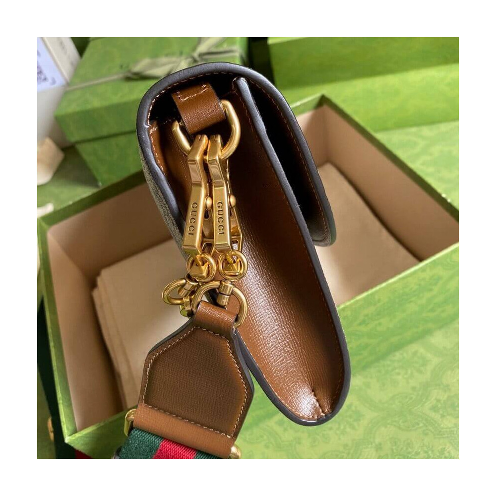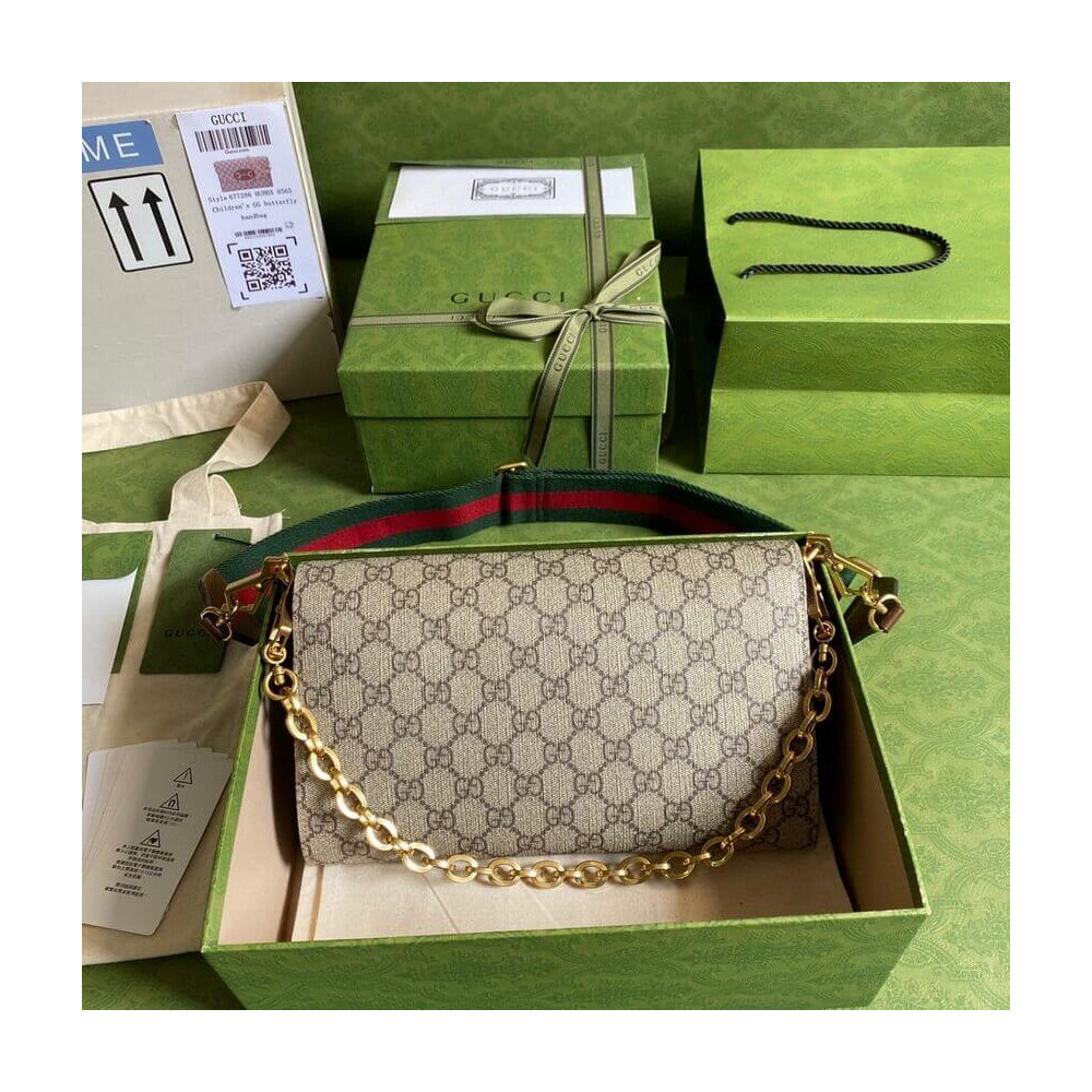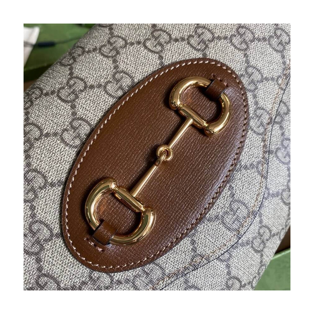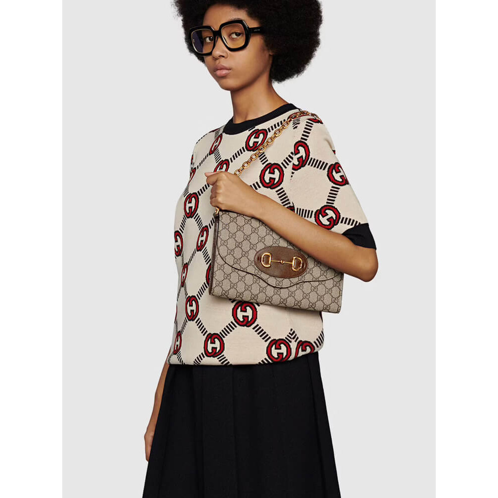 Embodying the notion of the versatility, the Gucci Horsebit 1955 is enriched with two detachable shoulder straps, one is crafted in emblematic green and red Web the other is in Gucci’s recognizable gold-toned chain design. The style is crafted from GG Supreme canvas and defined by the line’s signature Horsebit hardware.