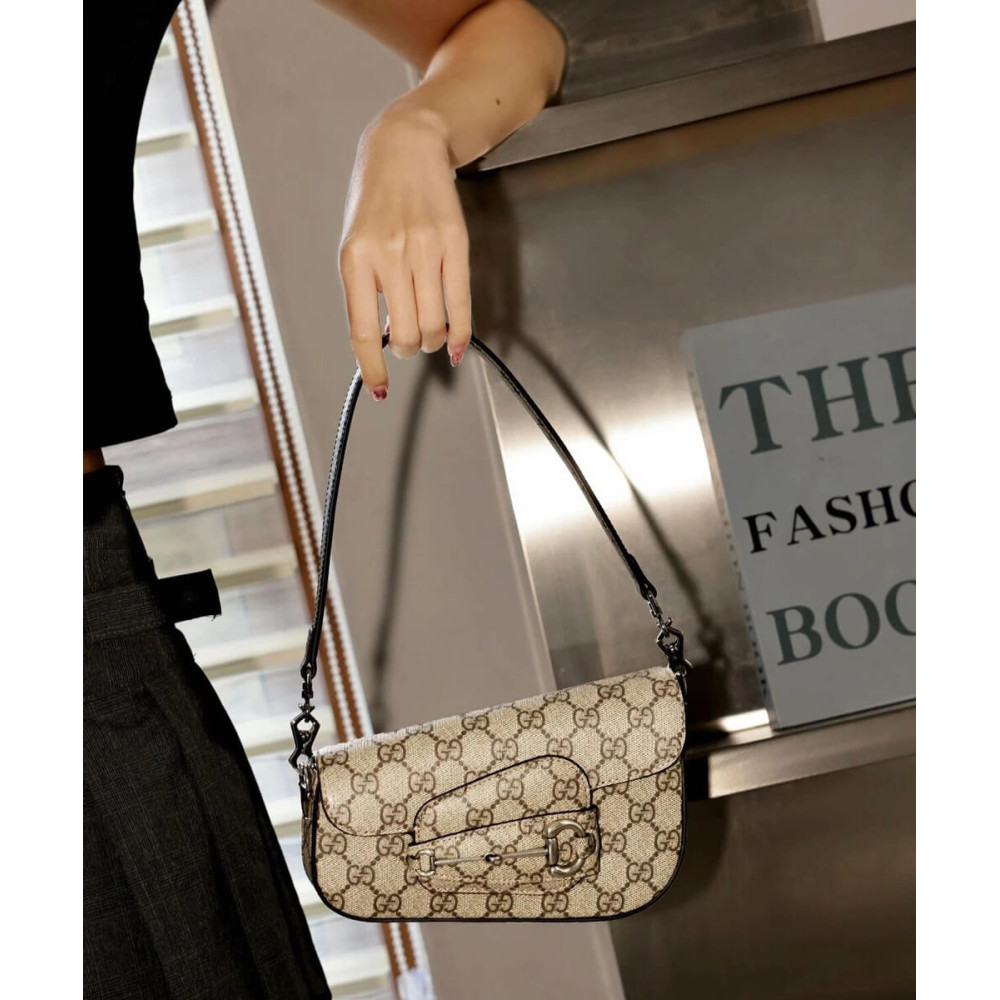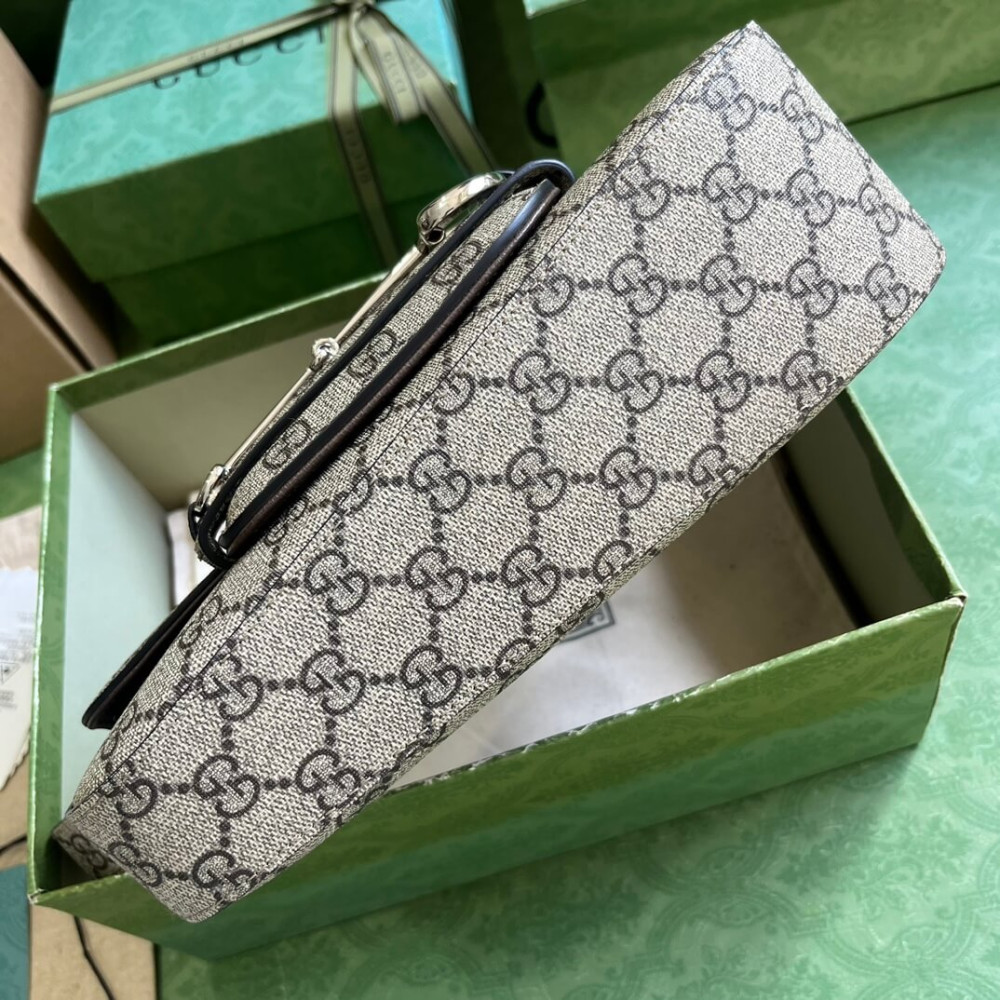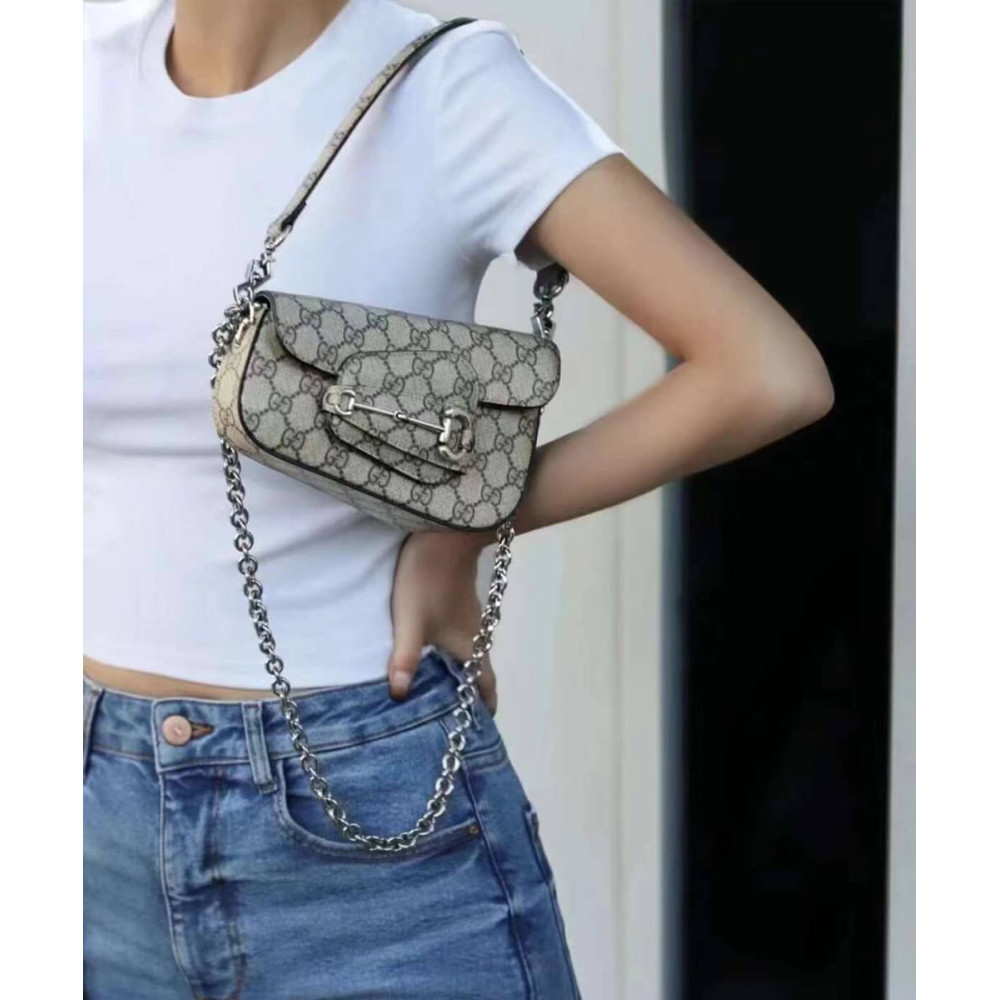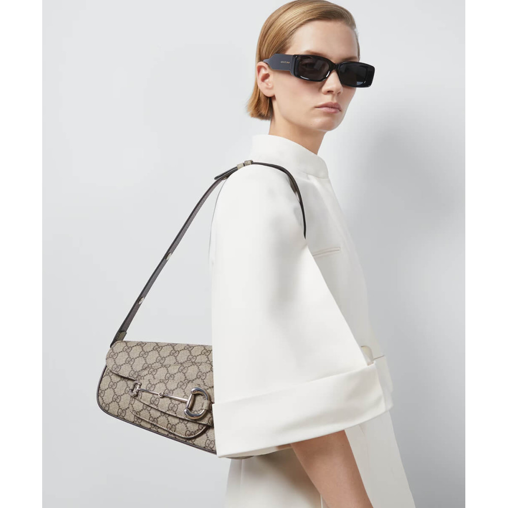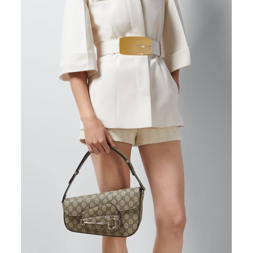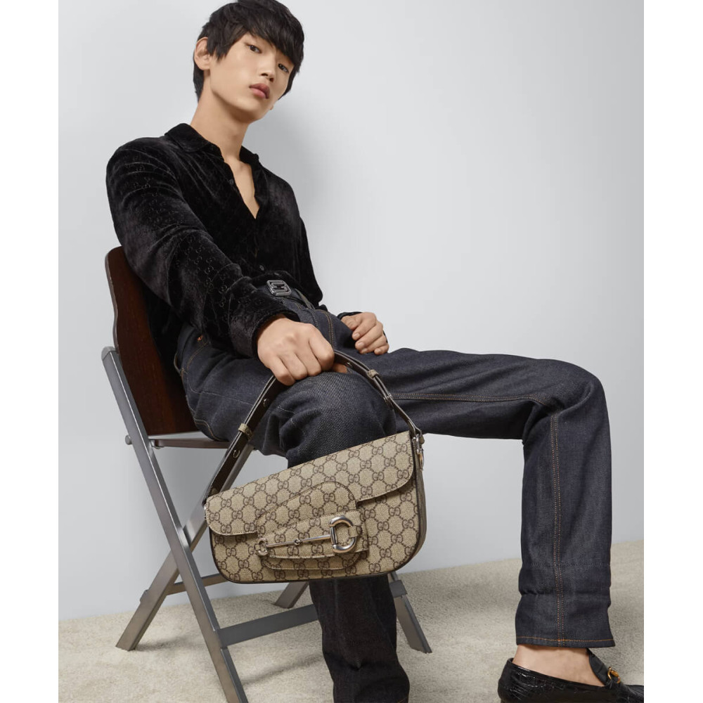 As the historic Horsebit hardware celebrates its 70th anniversary, the House looks at new ways of combining archival features with contemporary silhouettes. Introduced as part of the latest Cruise 2024 collection, this Supreme canvas Gucci Horsebit 1955 handbag is defined by an asymmetrical shape that lends a modern feel to the renowned line.