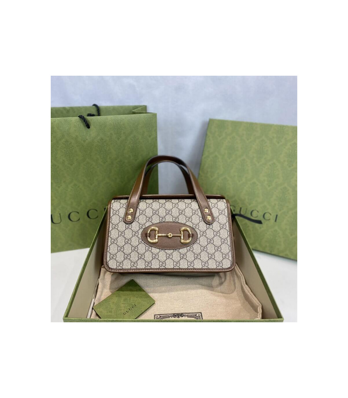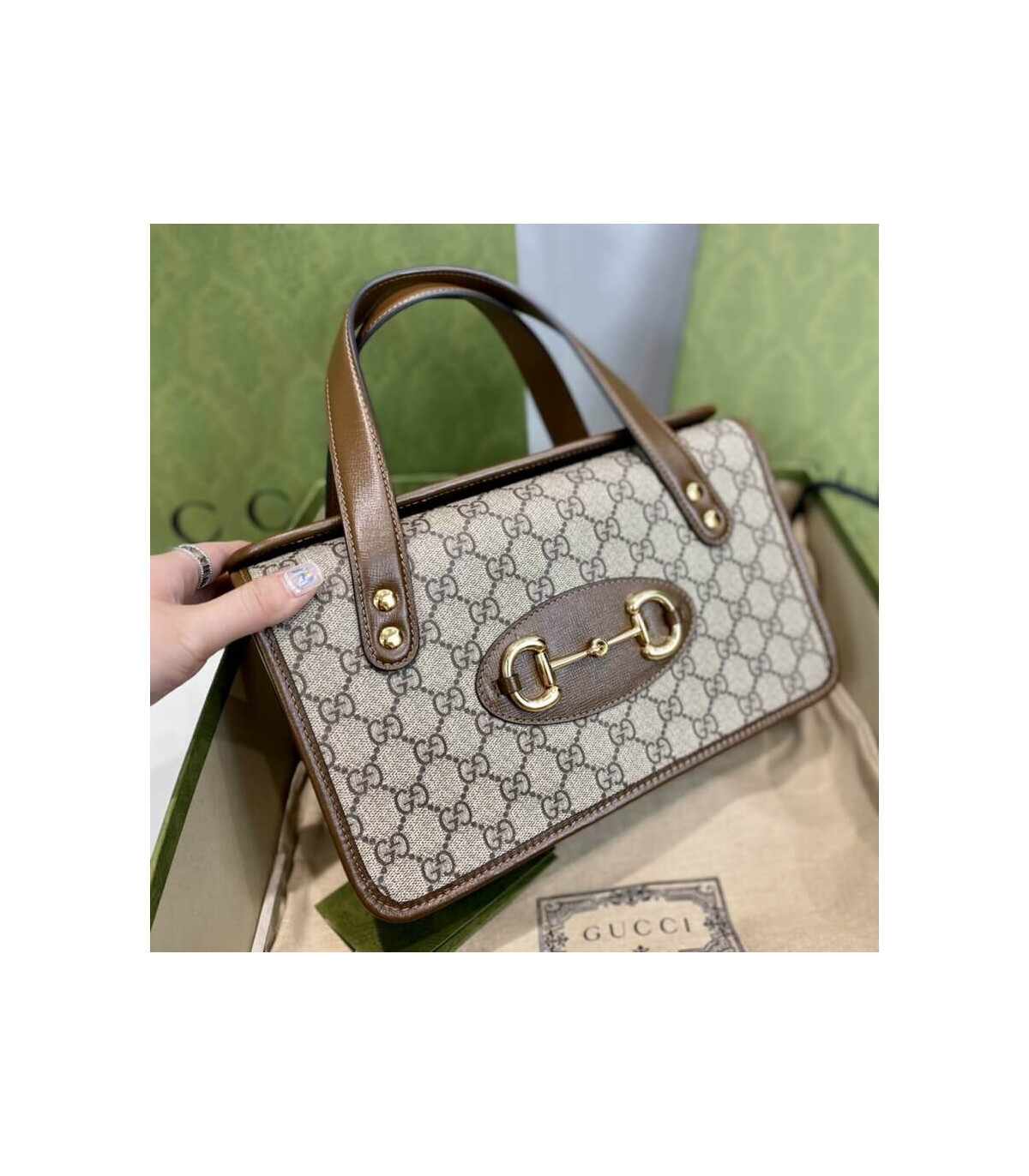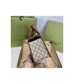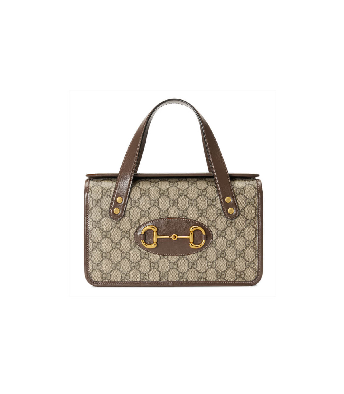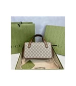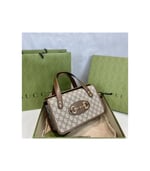 The top handle Boston bag is introduced within the Gucci Horsebit 1955 collection for Pre-Fall 2020 in the House’s GG monogram trimmed with brown leather. Inspired by archival designs, the line unifies the original details first introduced over six decades ago with a modern spirit, highlighting the Horsebit. Part of Gucci’s genetic code, the double ring and bar design has been established as one of the most distinctive elements among the House symbols borrowed from the equestrian world.