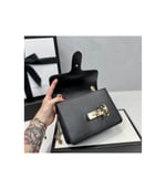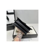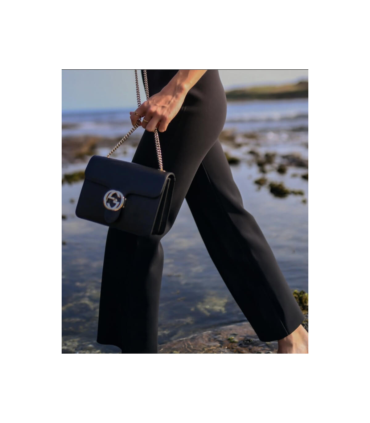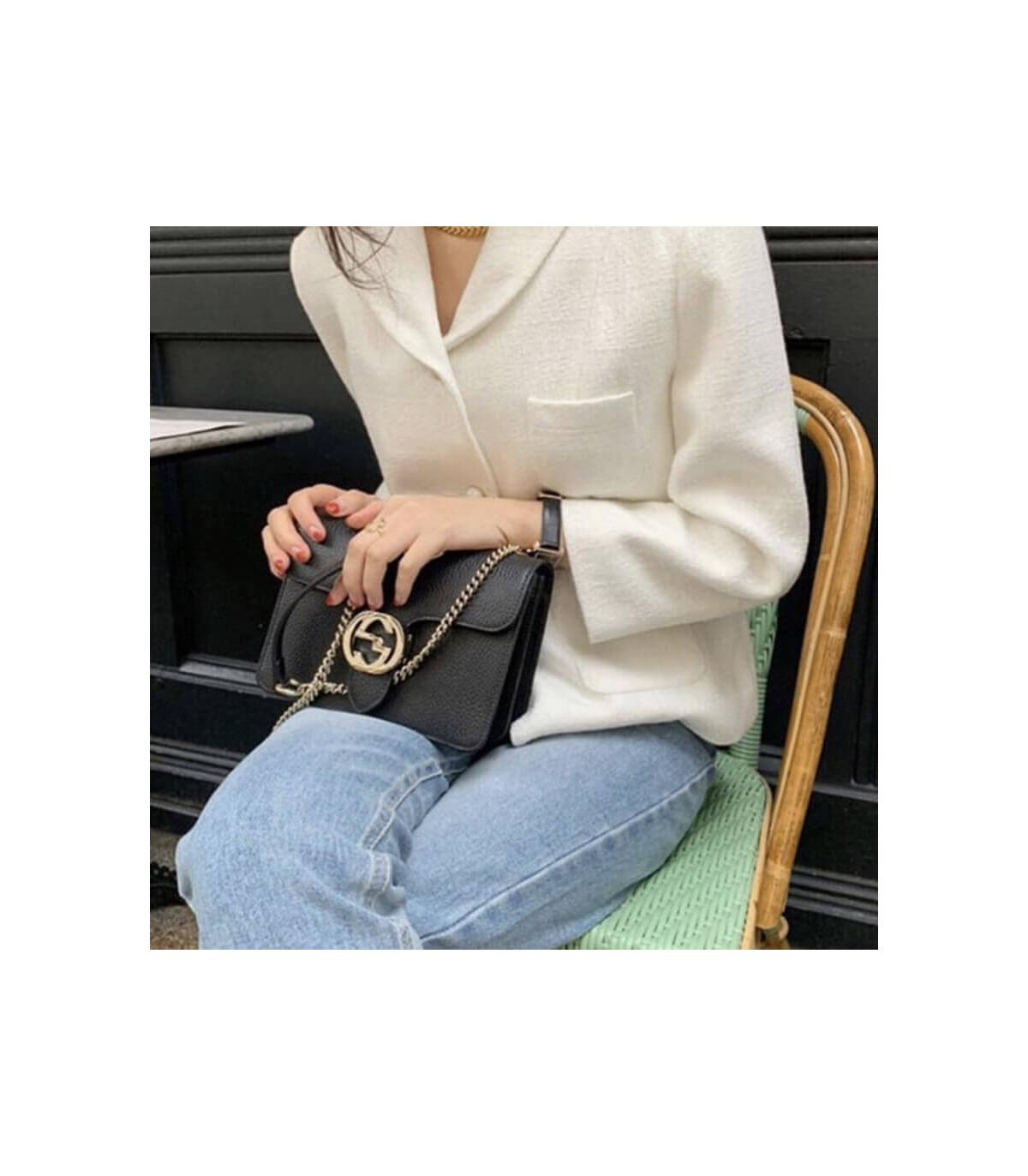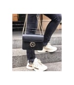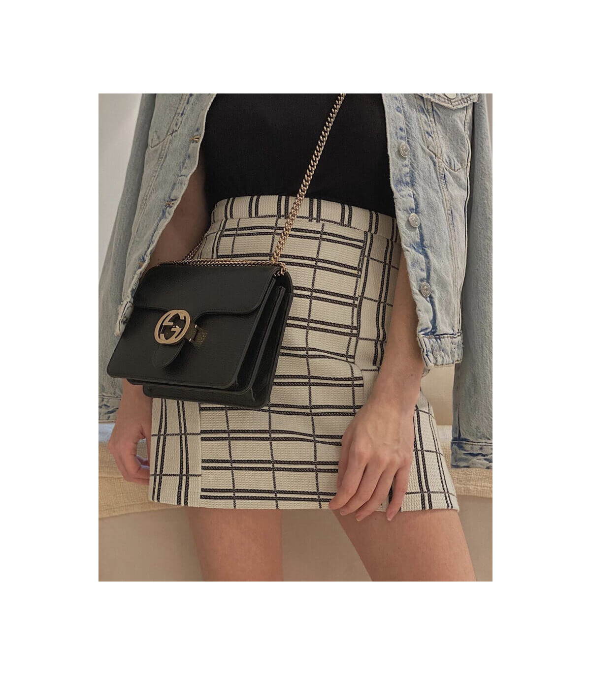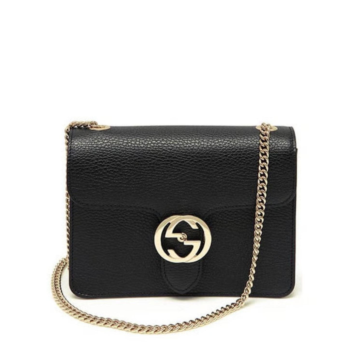 Crafted in smooth black leather, this elegant crossbody features a front flap with the iconic Interlocking G closure in light gold (champagne-toned) hardware. The structured interior includes two compartments and a slip pocket, while the chain shoulder strap offers effortless, hands-free style.