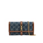 Crafted from eco-washed GG jacquard denim with brown leather trim, this Jackie 1961 chain wallet features gold-toned hardware and the iconic piston closure. Designed with a removable chain strap, it transitions easily from wallet to mini bag. Sustainably made with eco-conscious materials.