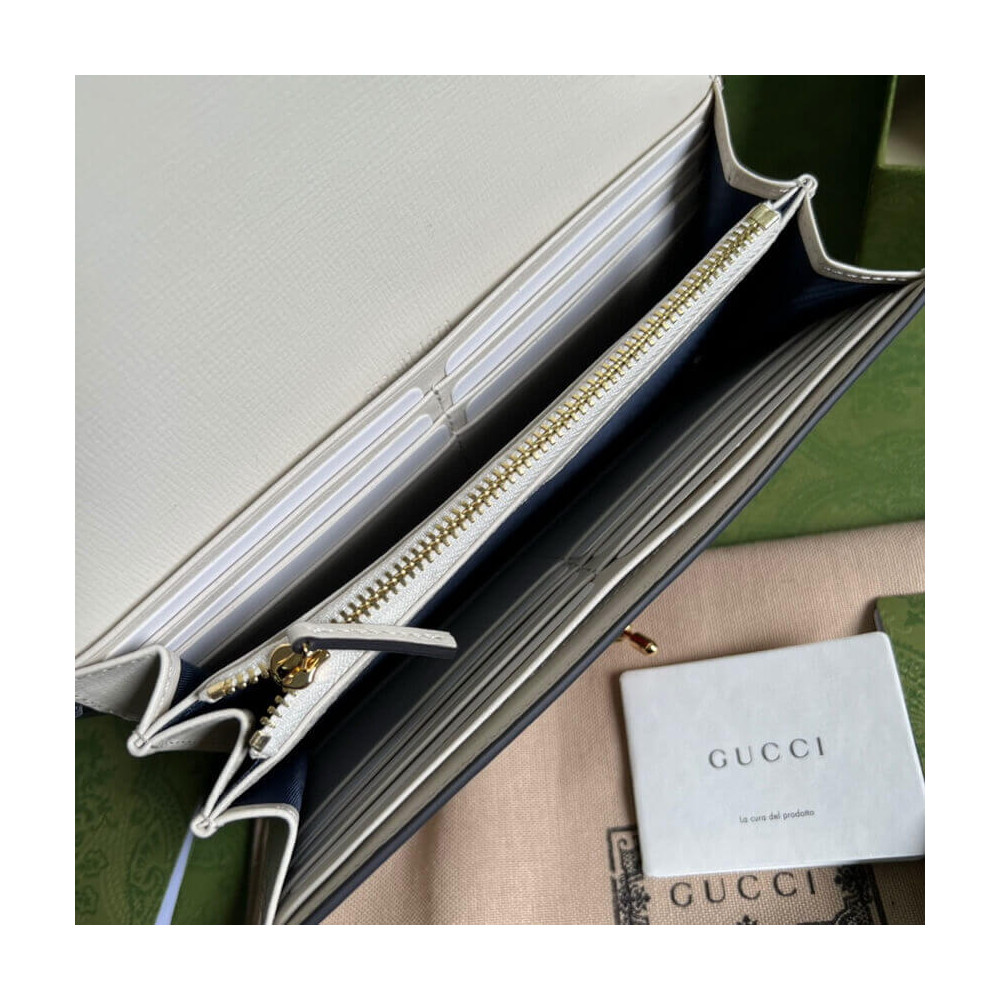 A modern reinterpretation of a classic, this Jackie 1961 chain wallet features a slim silhouette in GG Supreme canvas with striking white leather trim. The gold-toned piston closure and blue-red Web stripe honor Gucci heritage, while the chain strap allows it to double as a stylish mini bag.