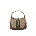 A timeless icon reimagined, the Jackie 1961 mini shoulder bag is crafted from beige/ebony GG Supreme canvas with brown leather trim and green-red Web detail. Featuring a signature gold-toned piston closure and detachable shoulder strap, this compact piece offers multiple ways to wear—from top handle to crossbody.