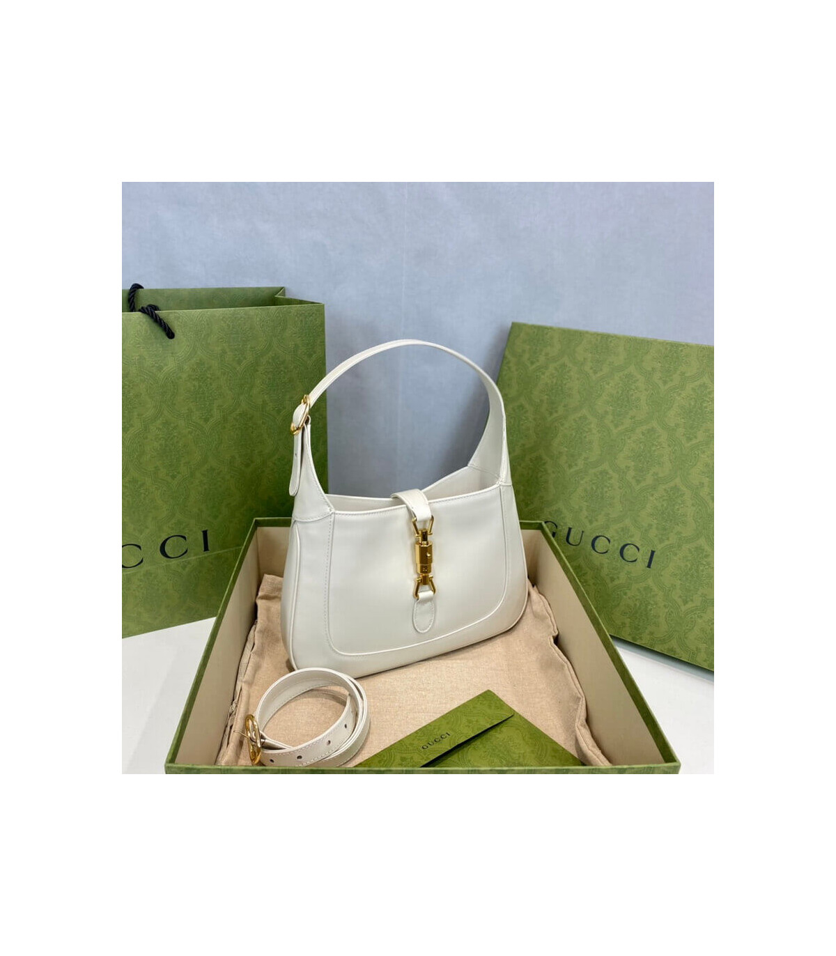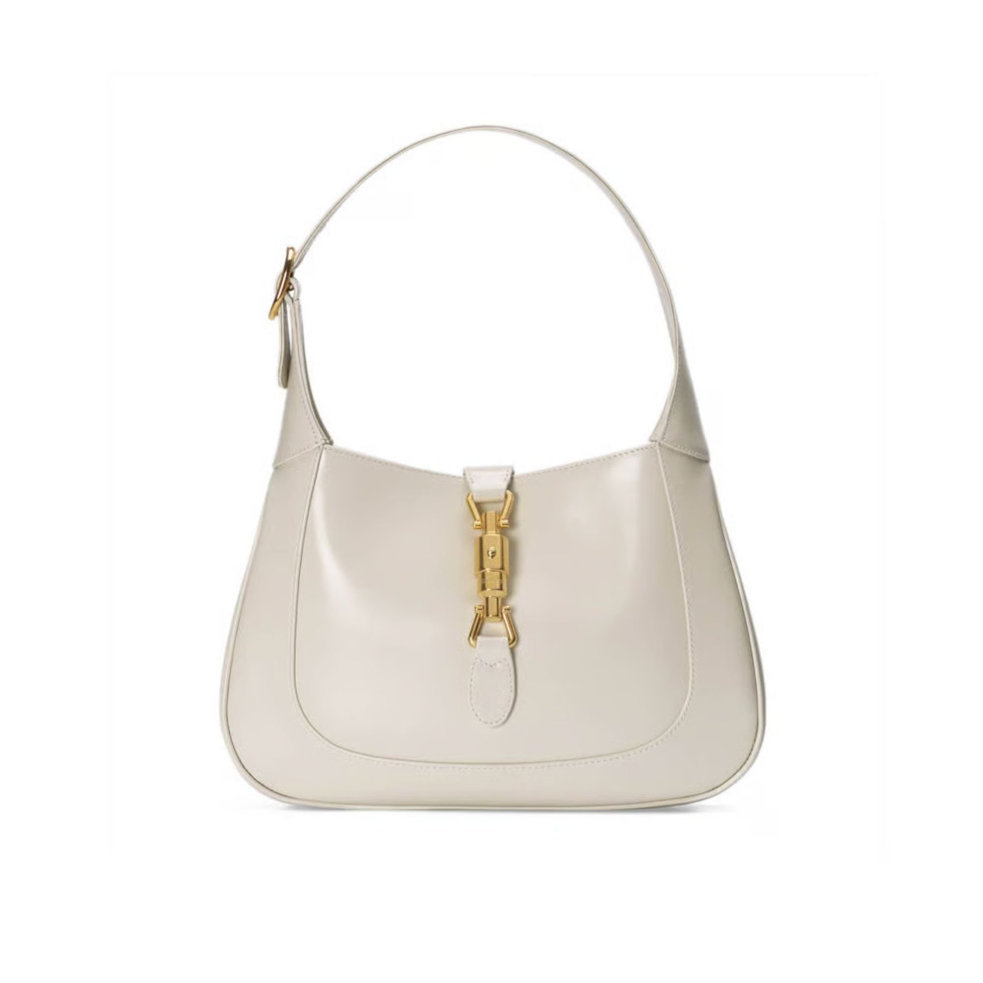 A modern revival of a Gucci icon, the Jackie 1961 Small Hobo is crafted in smooth white leather with gold-toned hardware and the signature piston closure. Includes an additional detachable shoulder strap for versatile styling—top handle, shoulder, or crossbody.