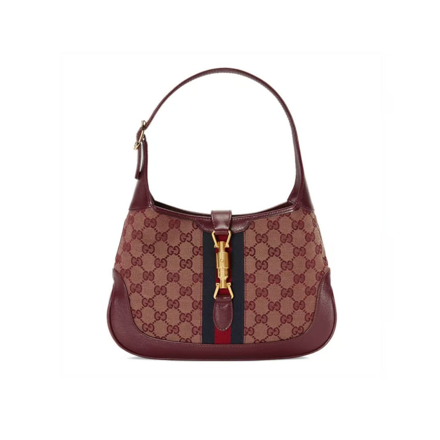 Part of the Beloved collection, this Jackie 1961 small shoulder bag is crafted from beige and burgundy Original GG canvas with burgundy leather trim. Featuring gold-toned piston closure and a detachable shoulder strap, the design is elevated by a bold blue-red Web detail.