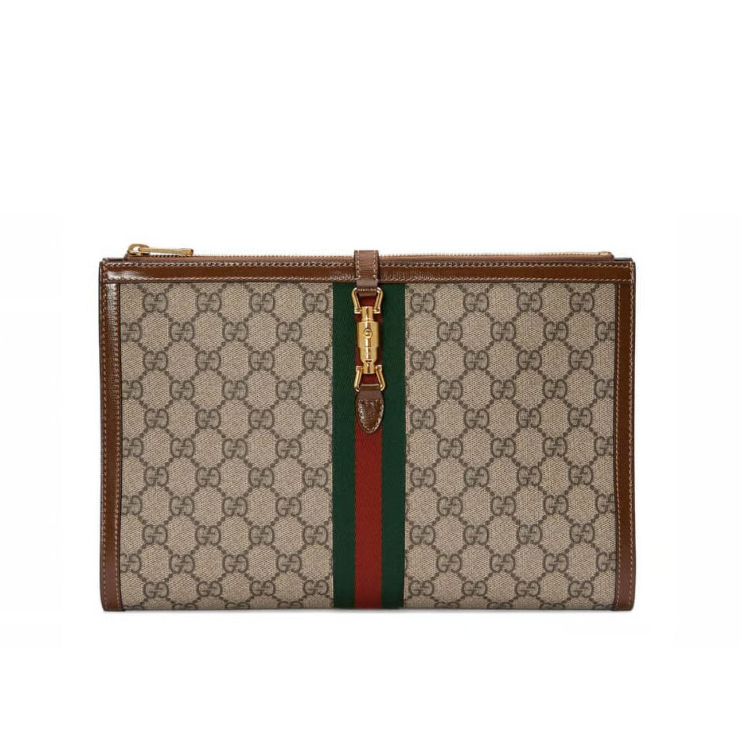 A sleek evolution of the iconic Jackie line, this pouch features the classic GG Supreme canvas with brown leather trim and green-red Web stripe. The gold-toned piston detail nods to the original 1961 design, while the slim shape offers refined everyday function.