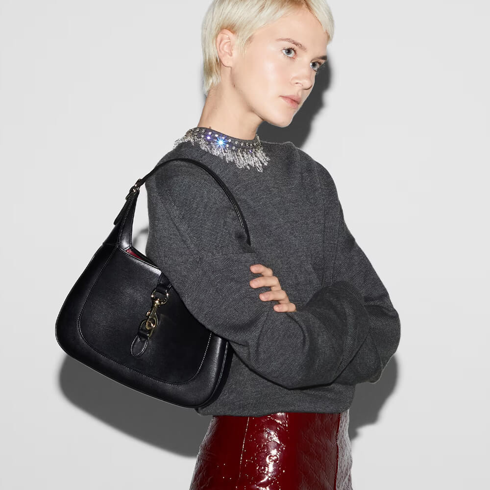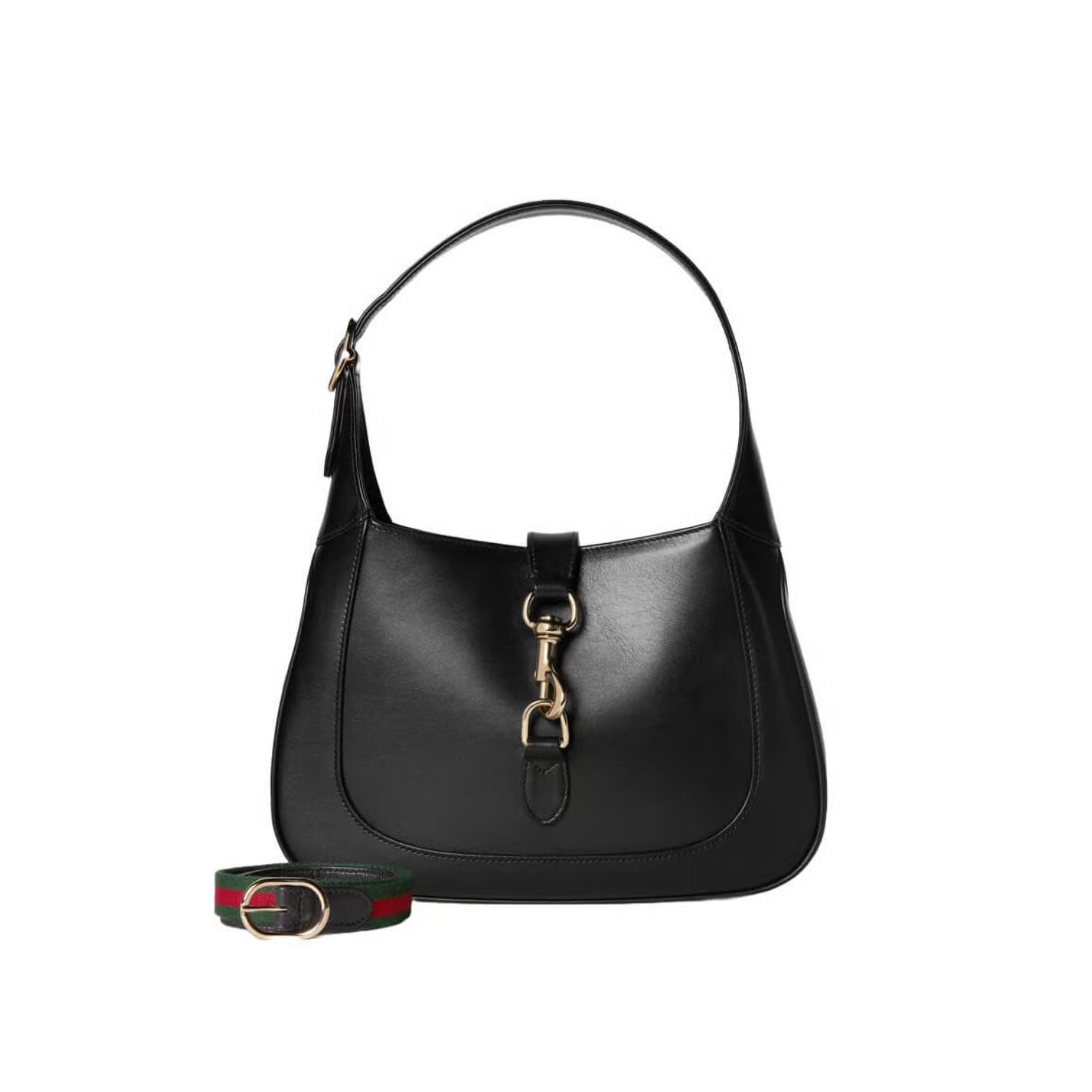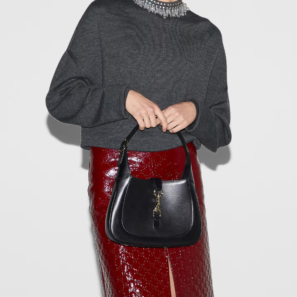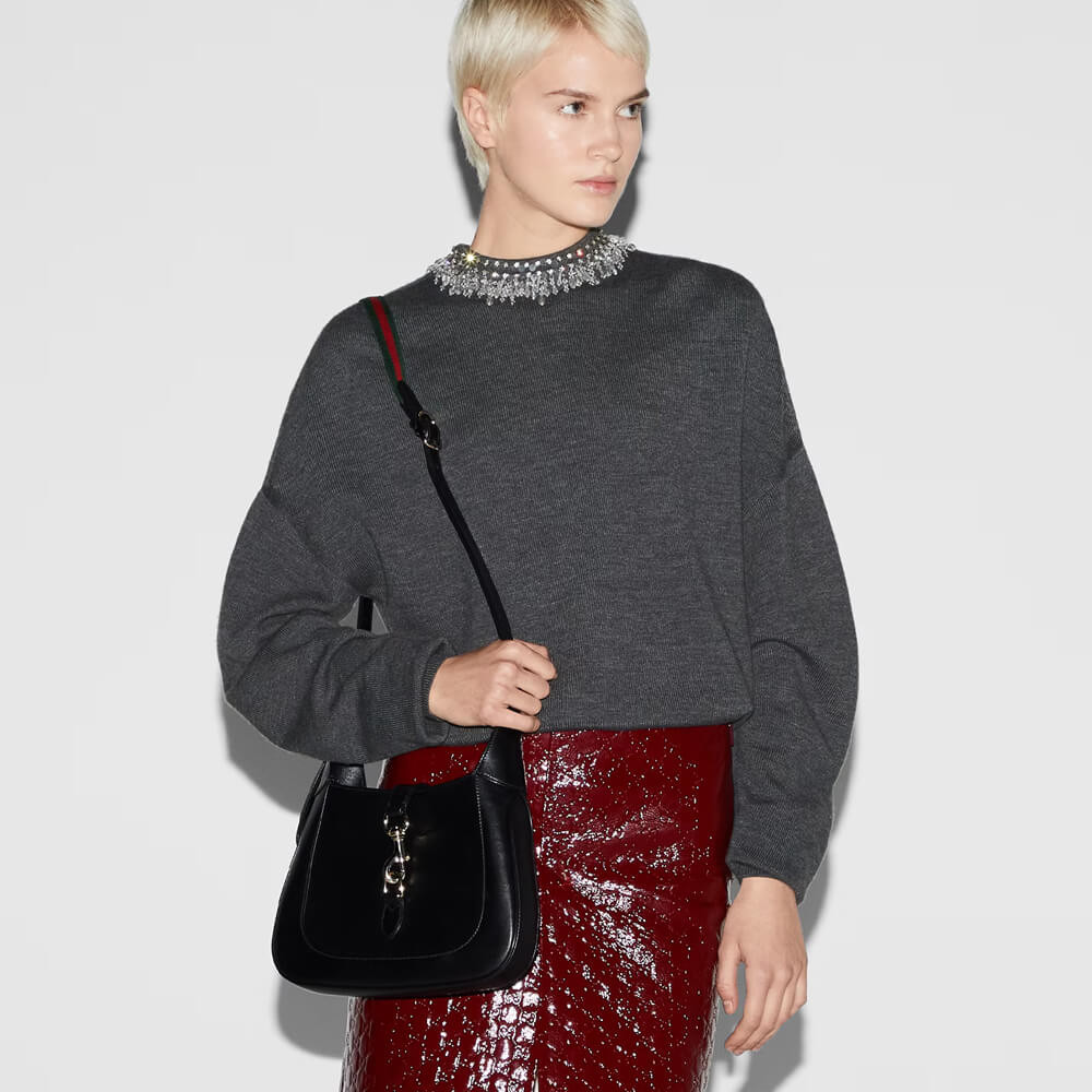 Crafted from premium smooth leather, this Jackie 1961 small shoulder bag in light grey showcases Gucci’s signature crescent silhouette with refined craftsmanship. Light gold-toned hardware and a detachable Web strap provide elegant and versatile styling options.
