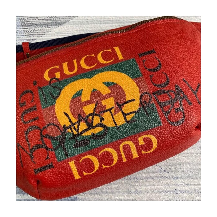 For Fall Winter 2017, artist Coco Capitán collaborated with Gucci on a special range of accessories and ready-to-wear that feature her signature phrases. The ironic and witty handwritten aphorisms appear over the Gucci vintage logo and bring together Coco Capitán’s offbeat sense of humour with the eclectic House aesthetic. This leather belt bag is printed with the phrase “What are we going to do with all this future?”