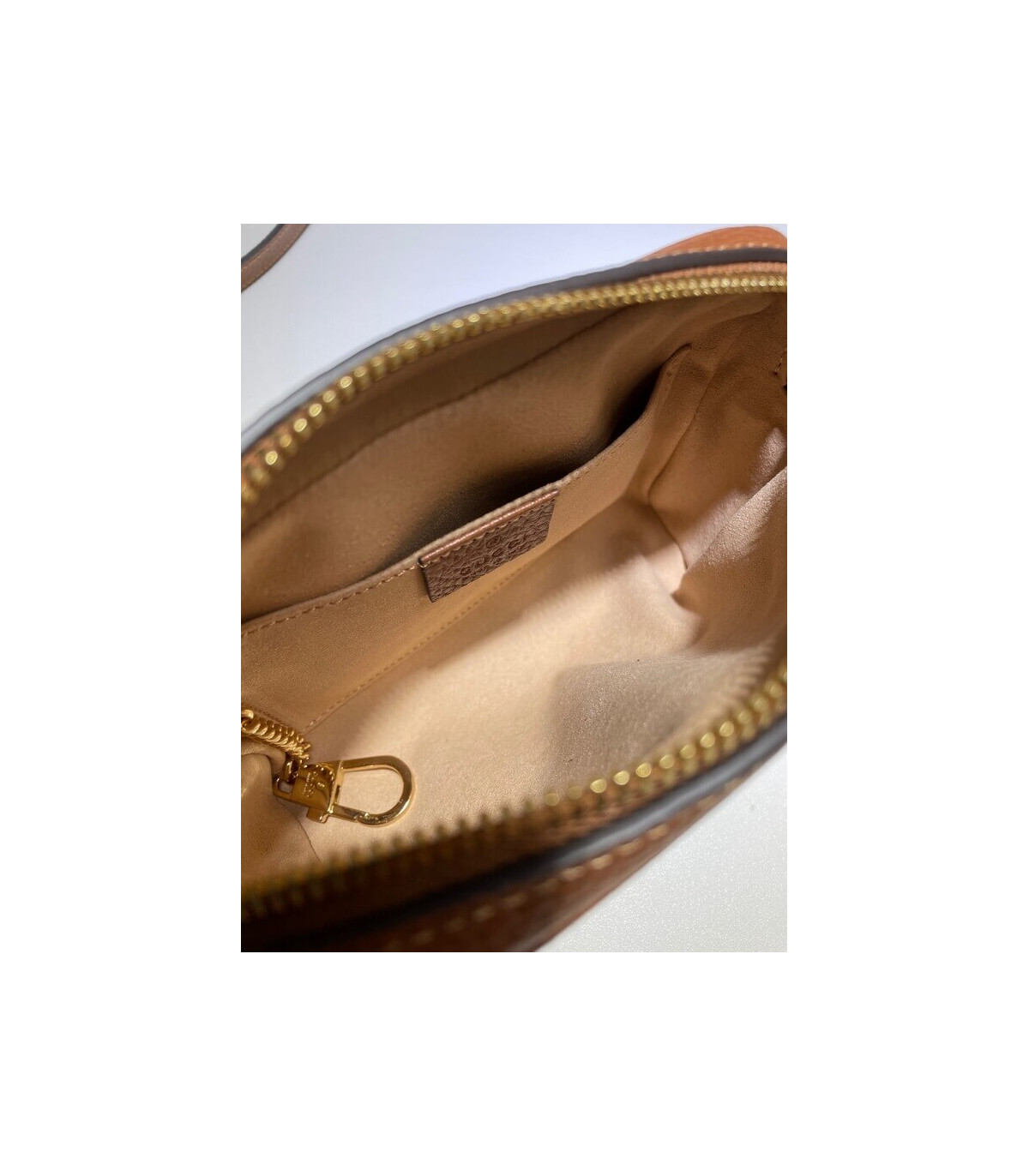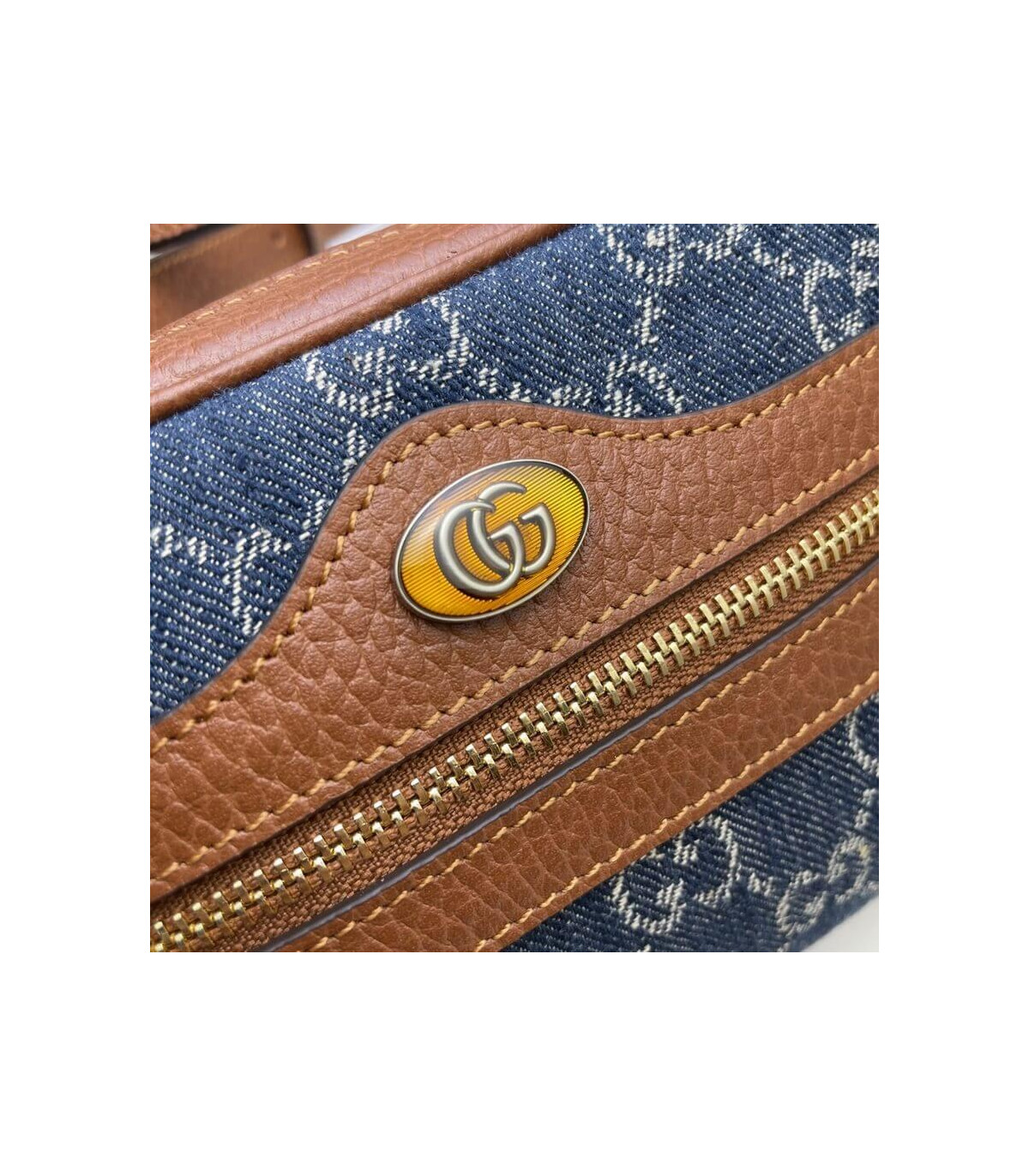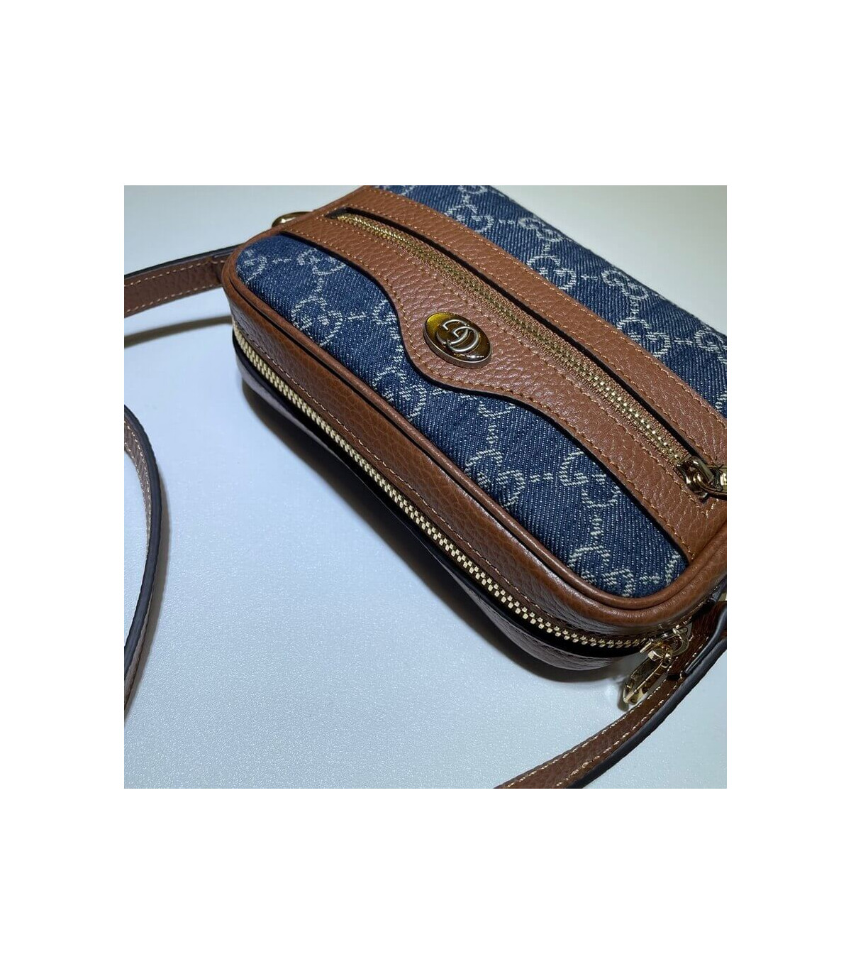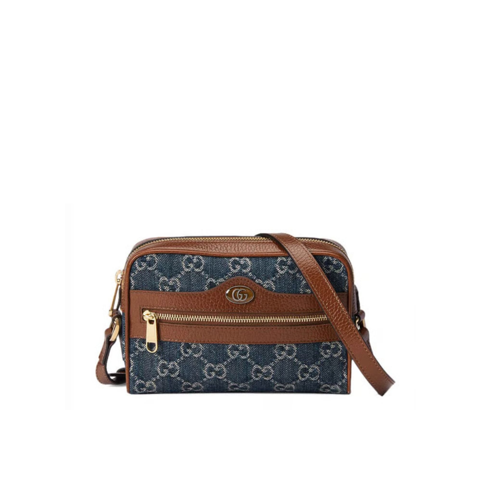 A vintage-inspired silhouette reimagined in eco washed GG jacquard denim, this mini Ophidia bag features brown leather trim and an enameled Double G detail. Compact yet functional, it includes a front zip pocket, interior slot, and an adjustable shoulder strap for hands-free wear.