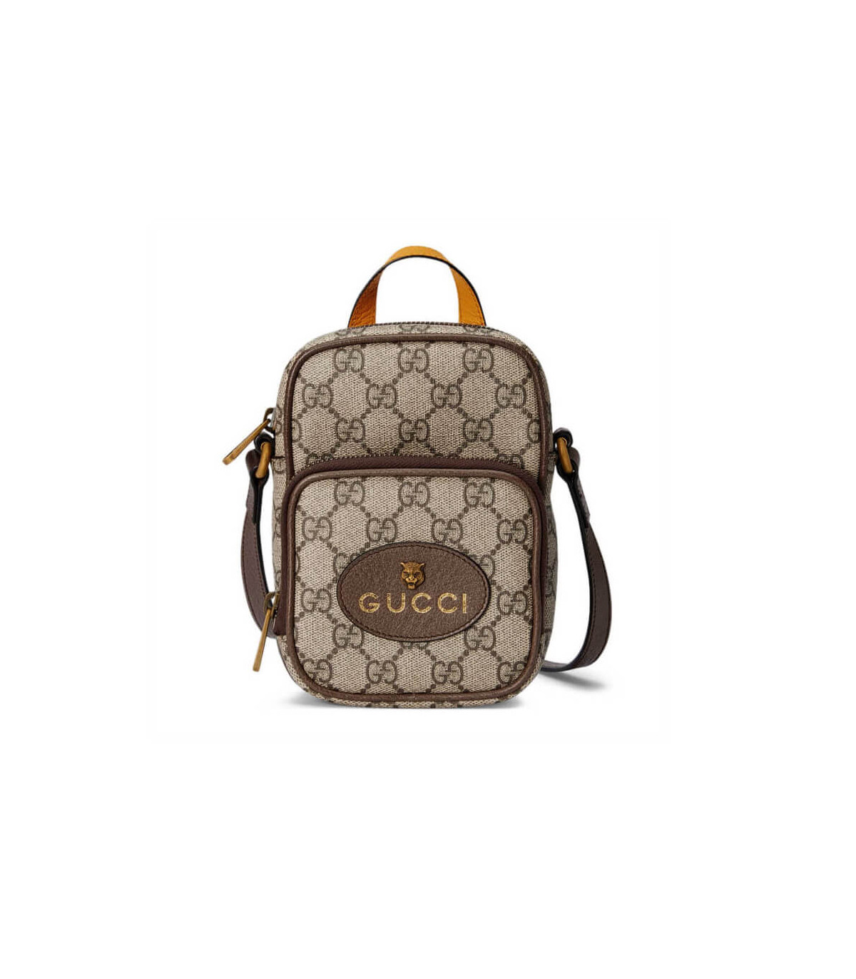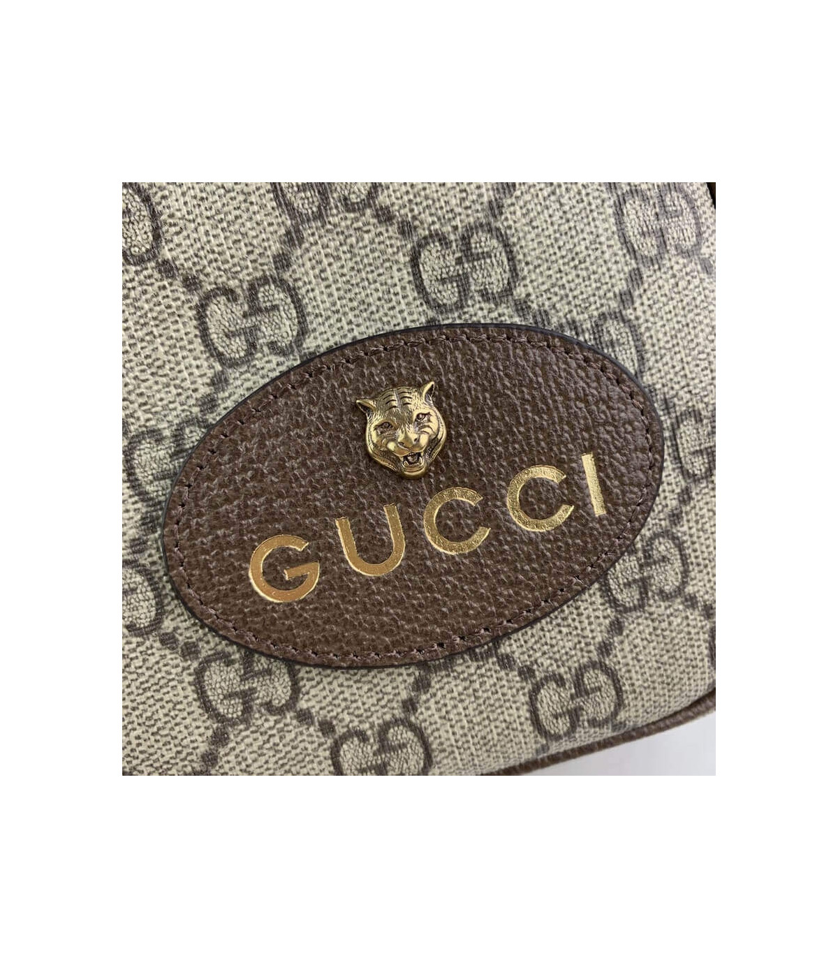 – Oval Gucci leather tag with feline head