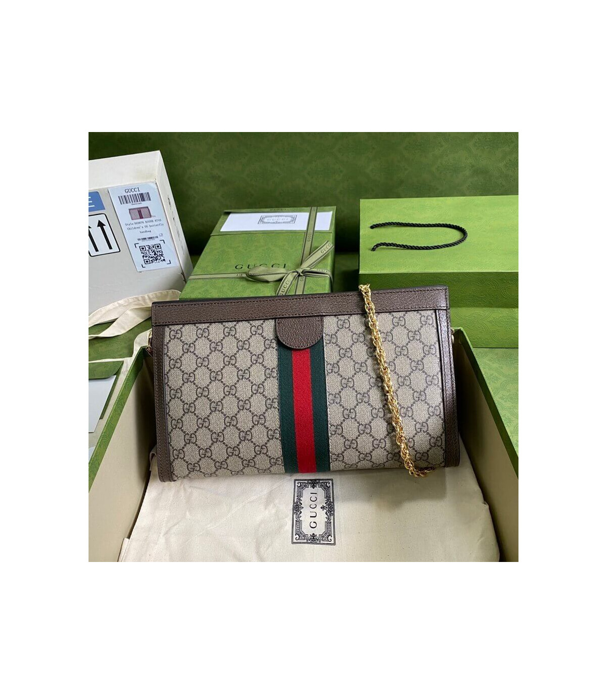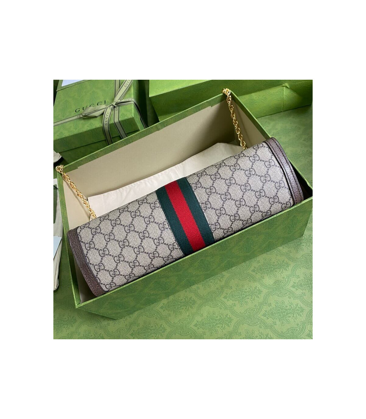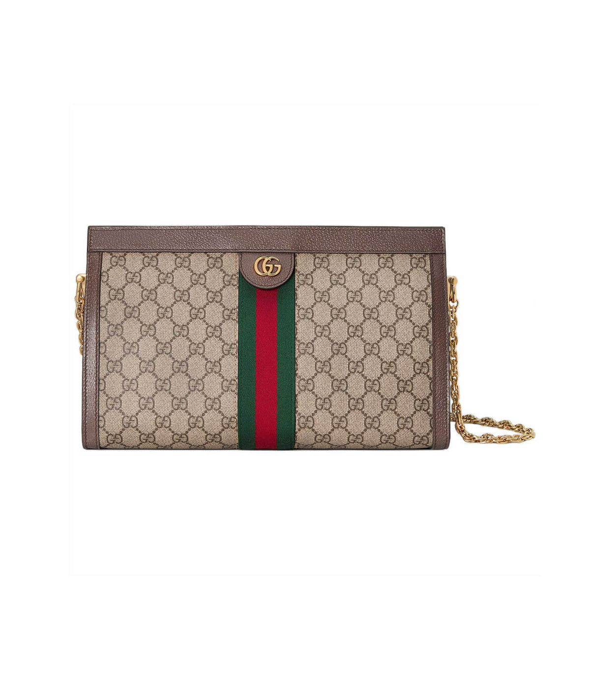 Crafted in GG Supreme canvas with inlaid Web stripe detail, the chain strap shoulder bag boasts a vintage inspired design. The structured shape secures with a magnetic closure, trimmed with leather and Double G hardware—an archival detail.