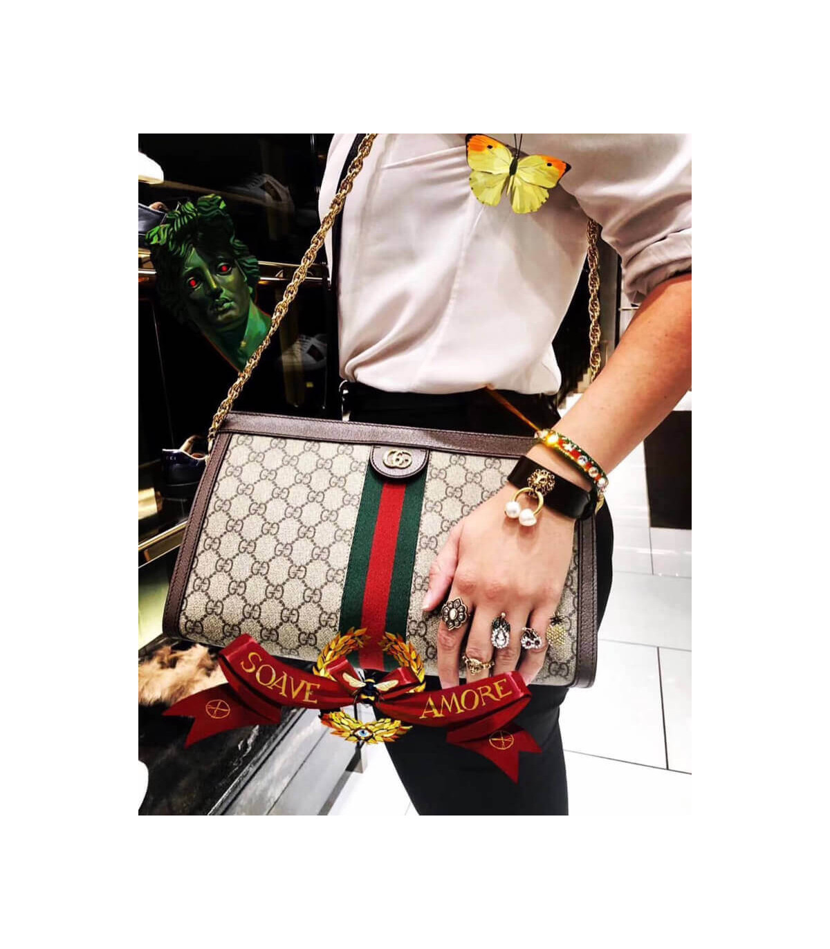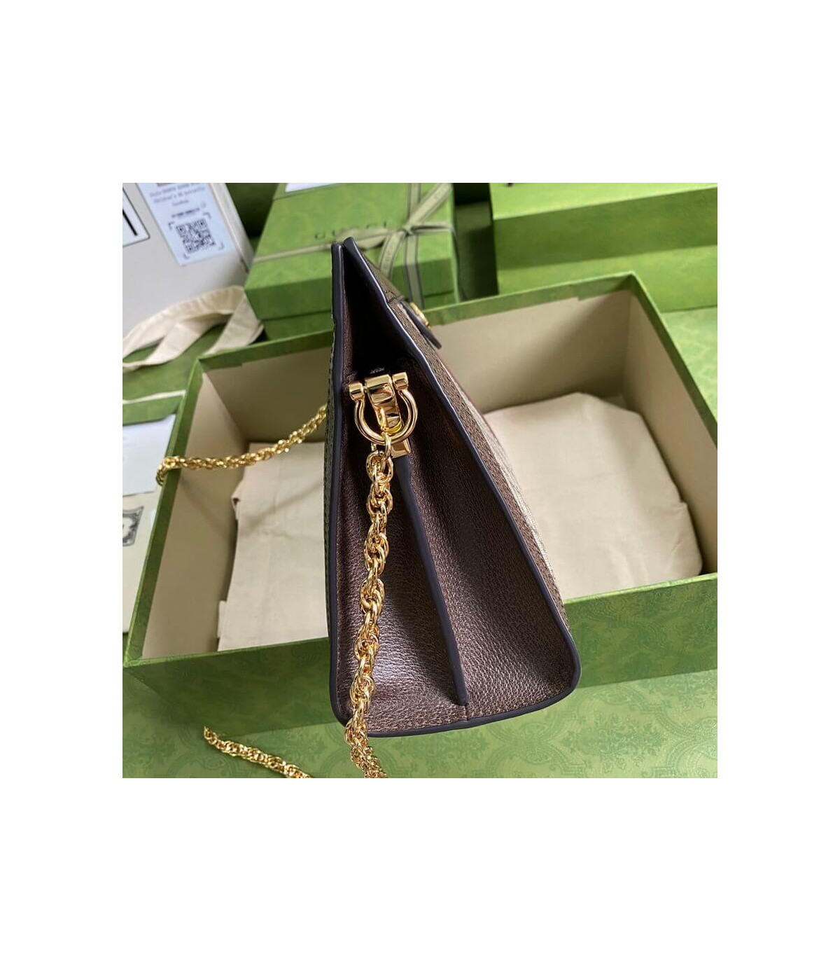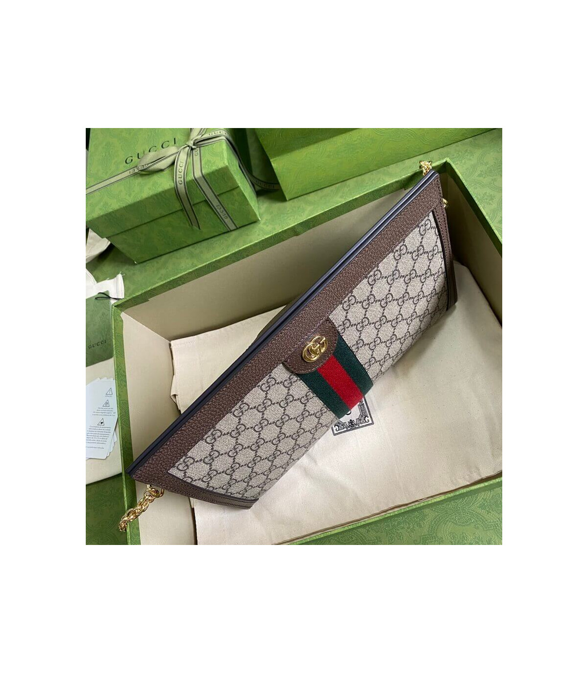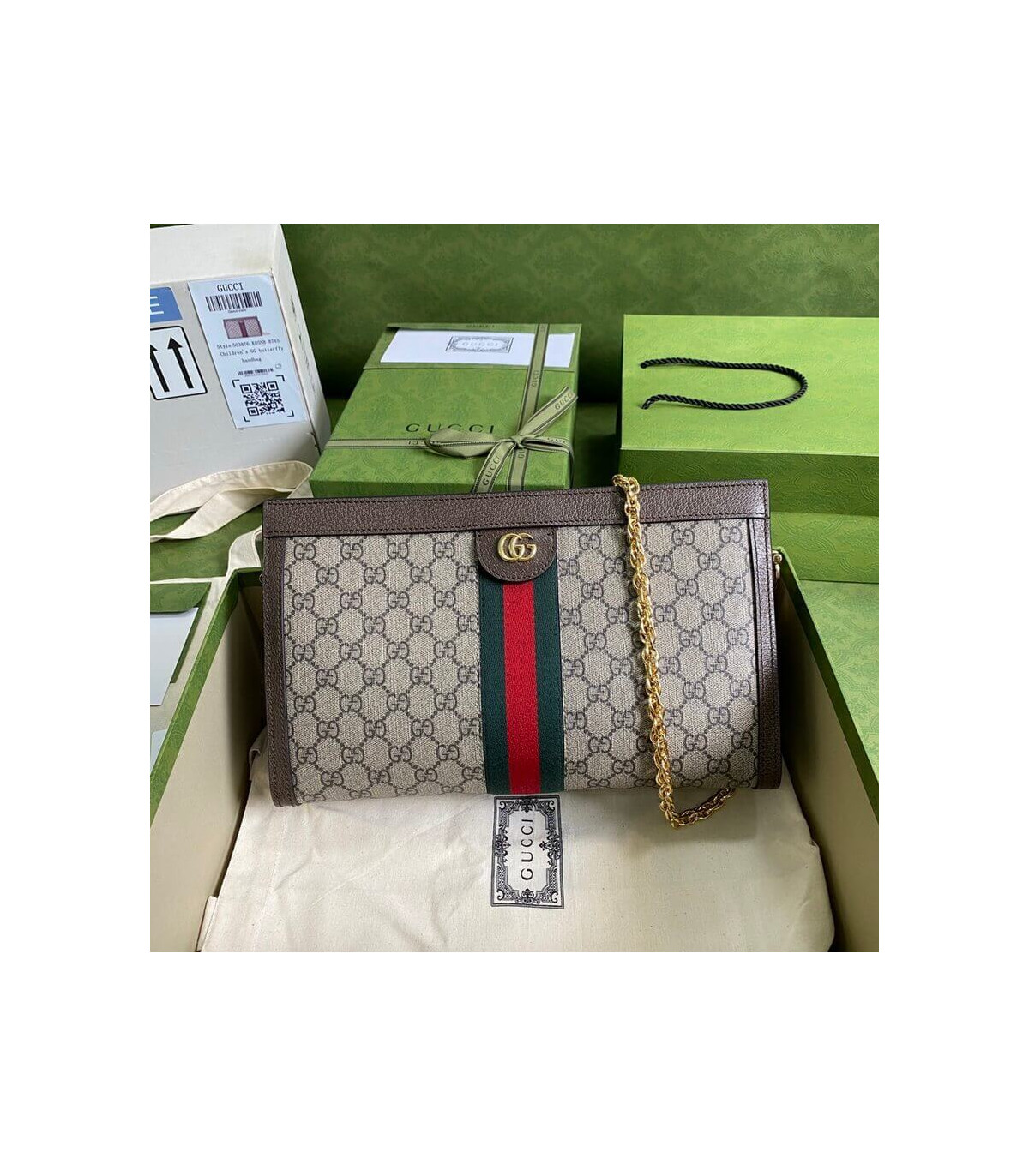 Crafted in GG Supreme canvas with inlaid Web stripe detail, the chain strap shoulder bag boasts a vintage inspired design. The structured shape secures with a magnetic closure, trimmed with leather and Double G hardware—an archival detail.