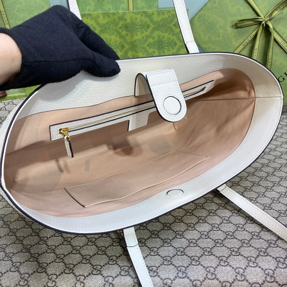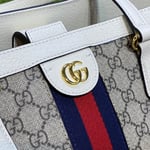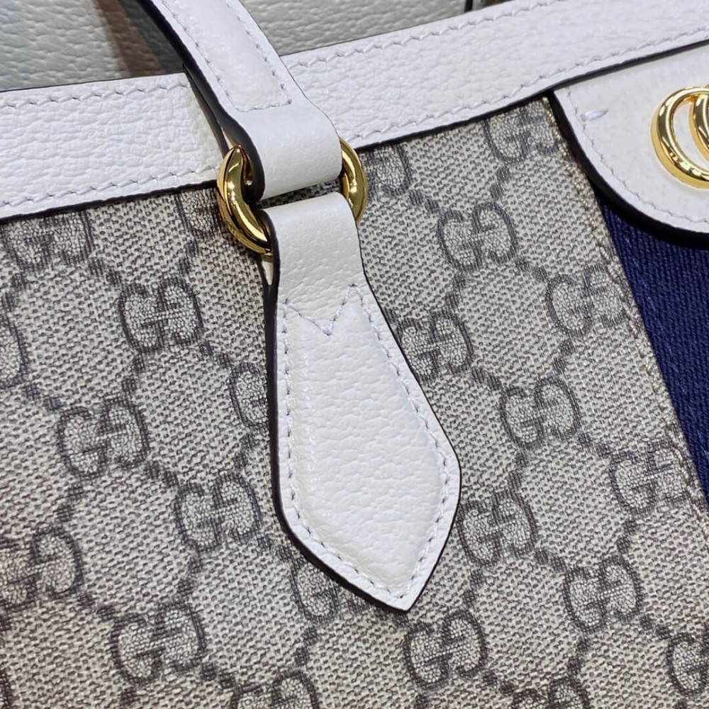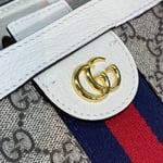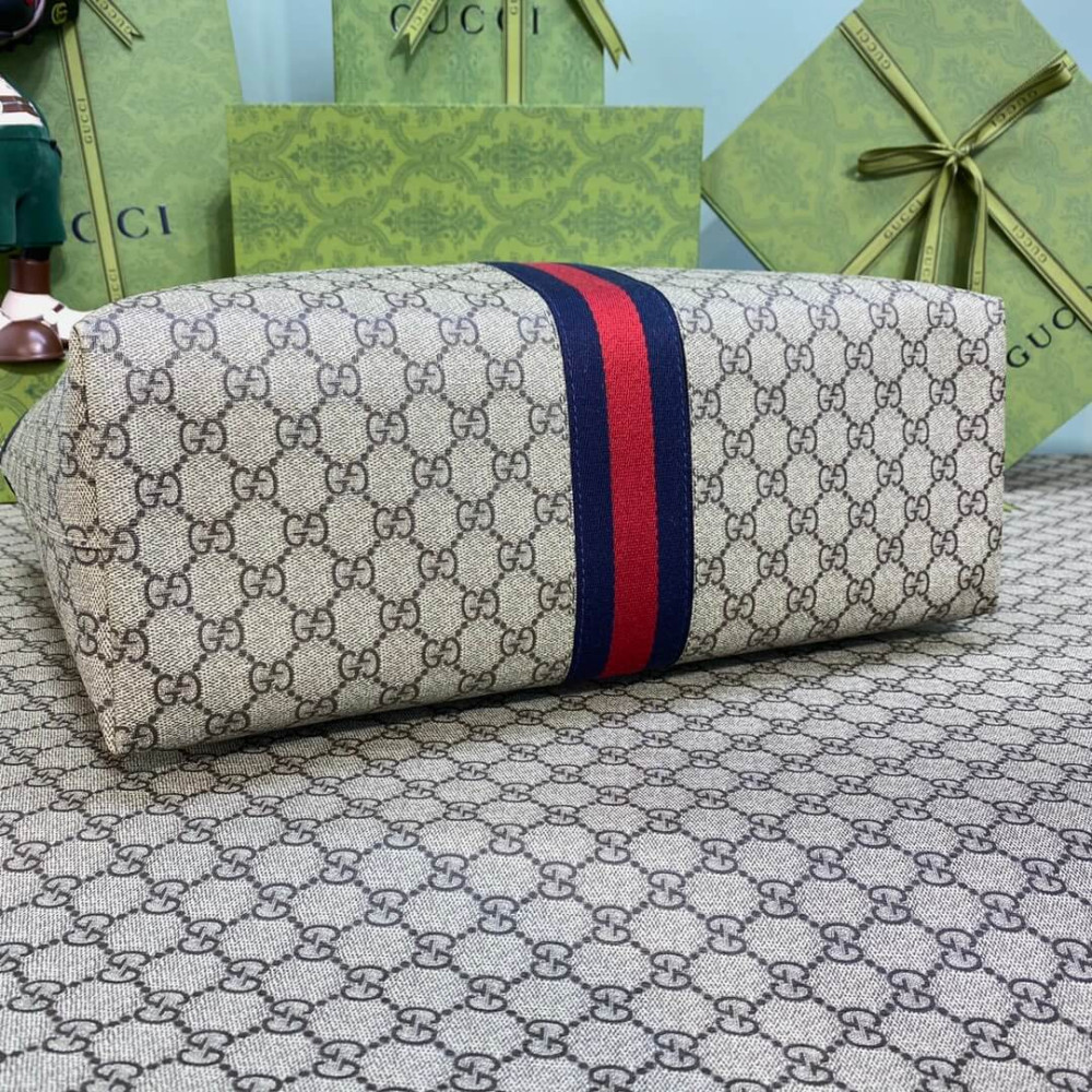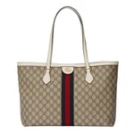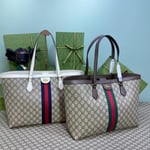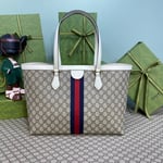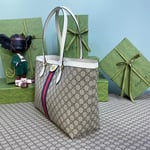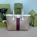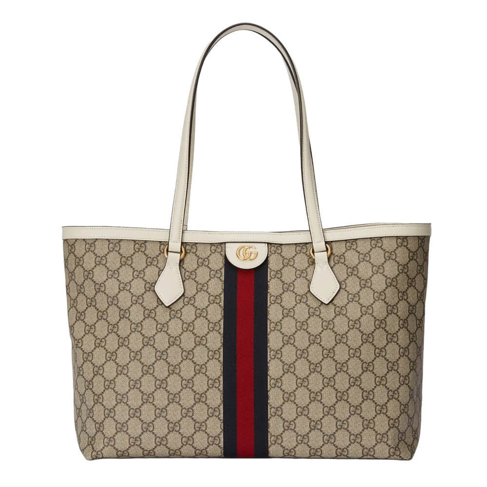 A classic combination of the House’s most defining codes—the GG motif and Web stripe—the world of Ophidia continues to evolve, incorporating new shapes and silhouettes each season. With recognizable design elements in a practical new shape, this new medium sized tote is trimmed with textured leather and topped with Double G hardware. Thanks to its long leather handles, the style can also be carried as a shoulder bag.