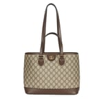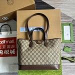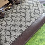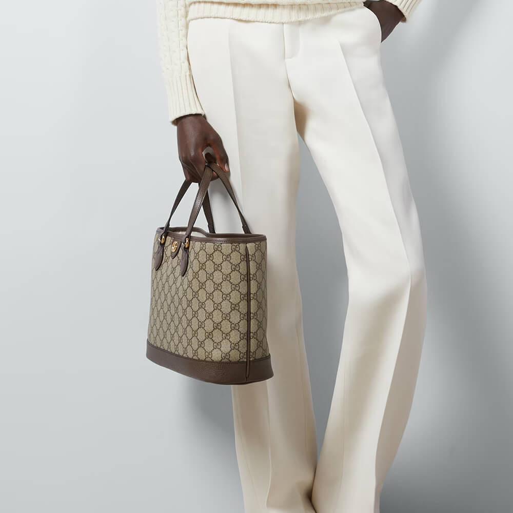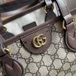 The Ophidia line is further elevated through new sizes and styles including variations with top handles as well as shoulder straps, allowing for versatile wear. The signature Double G hardware completes this beige and ebony GG Supreme design.