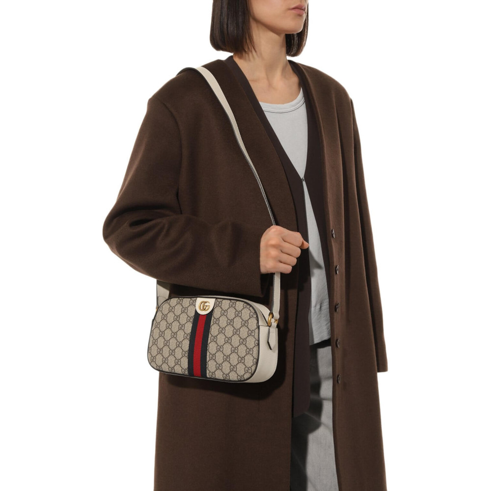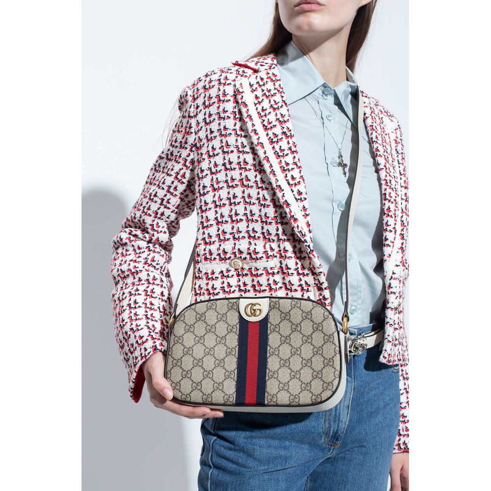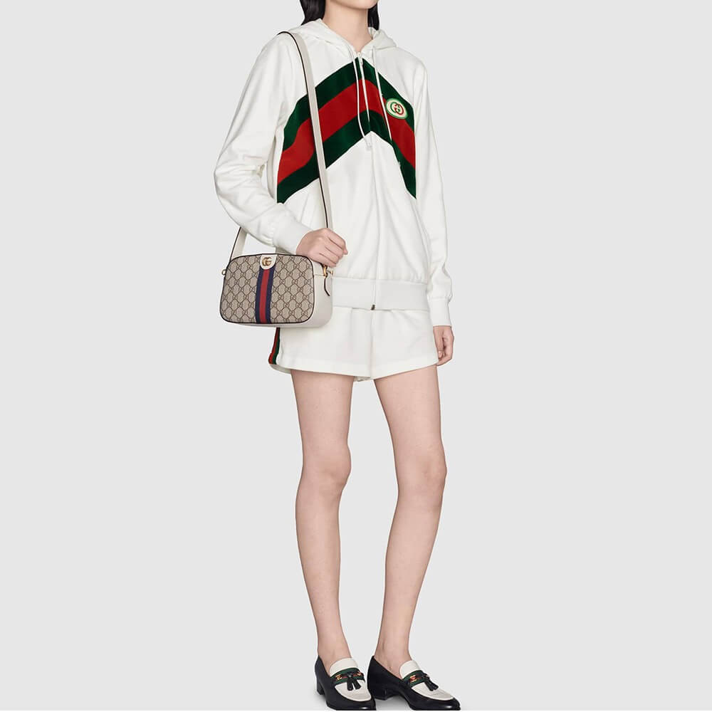 Mirroring the material’s historic origins, GG Supreme is introduced in a timeless mix of blue and beige for Gucci Love Parade. The canvas has come to the front of each collection decade after decade to become a hallmark of the House. Here, the classic palette defines this Ophidia camera bag.