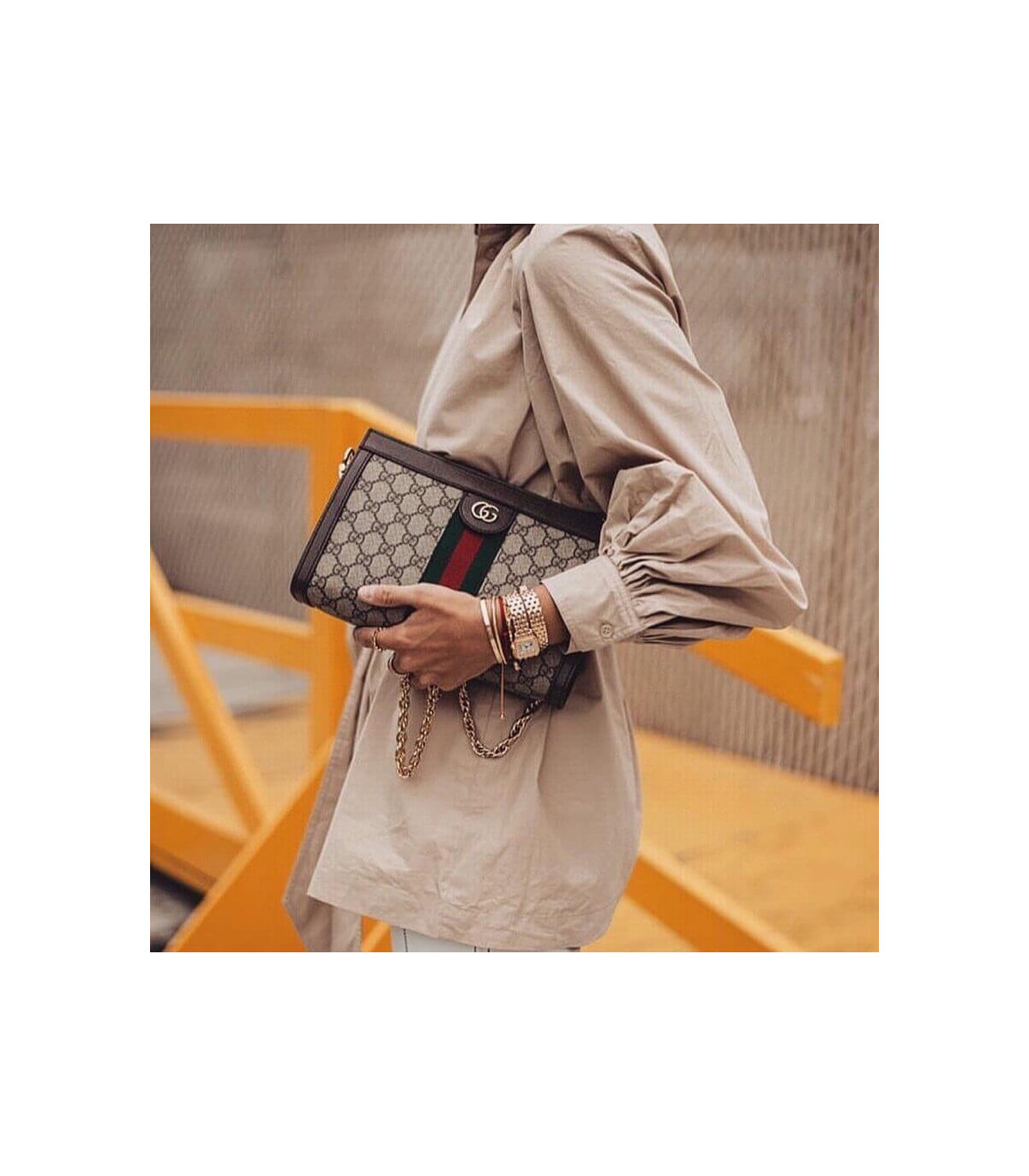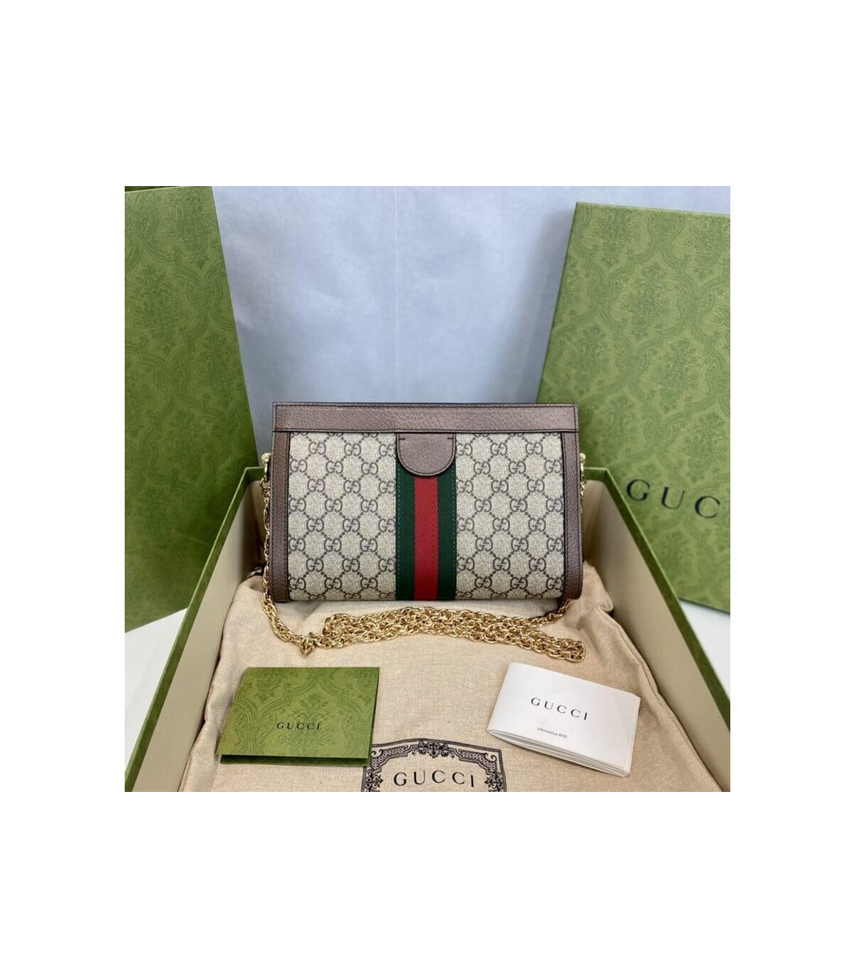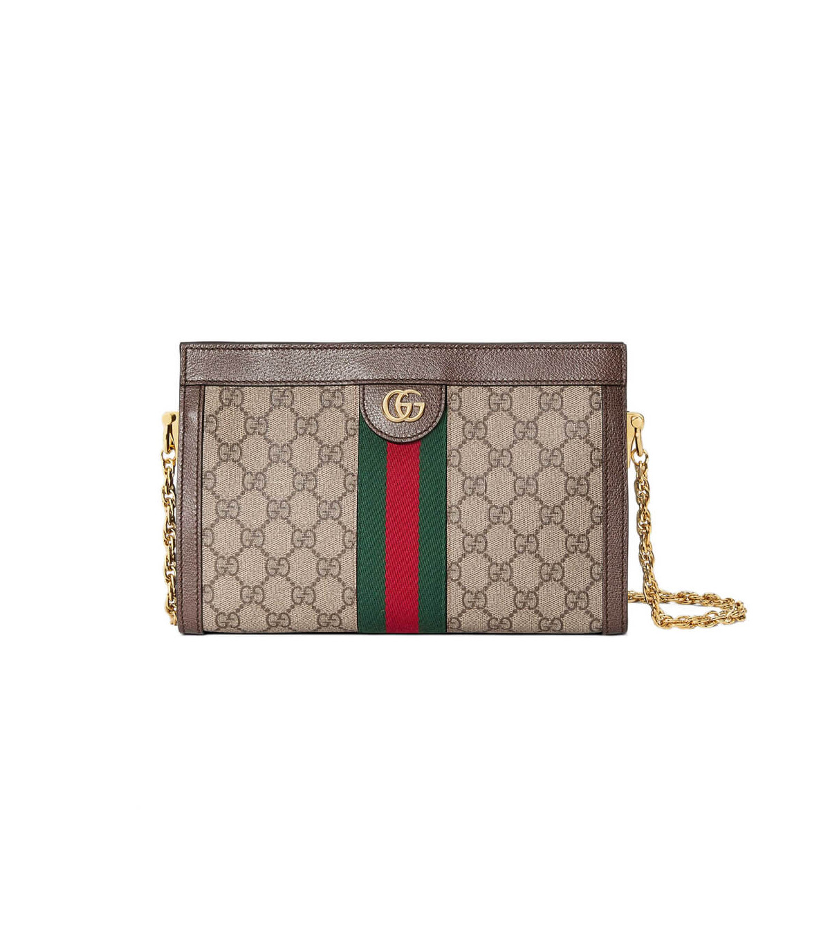 Crafted in GG Supreme canvas with inlaid Web stripe detail, the chain strap shoulder bag boasts a vintage inspired design. The structured shape secures with a magnetic closure, trimmed with leather and Double G hardware—an archival detail.