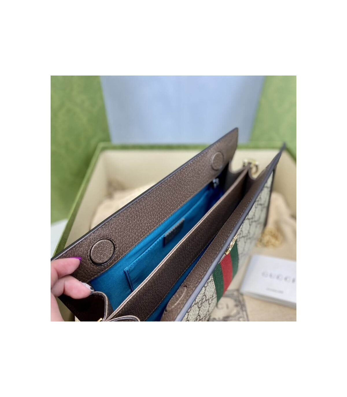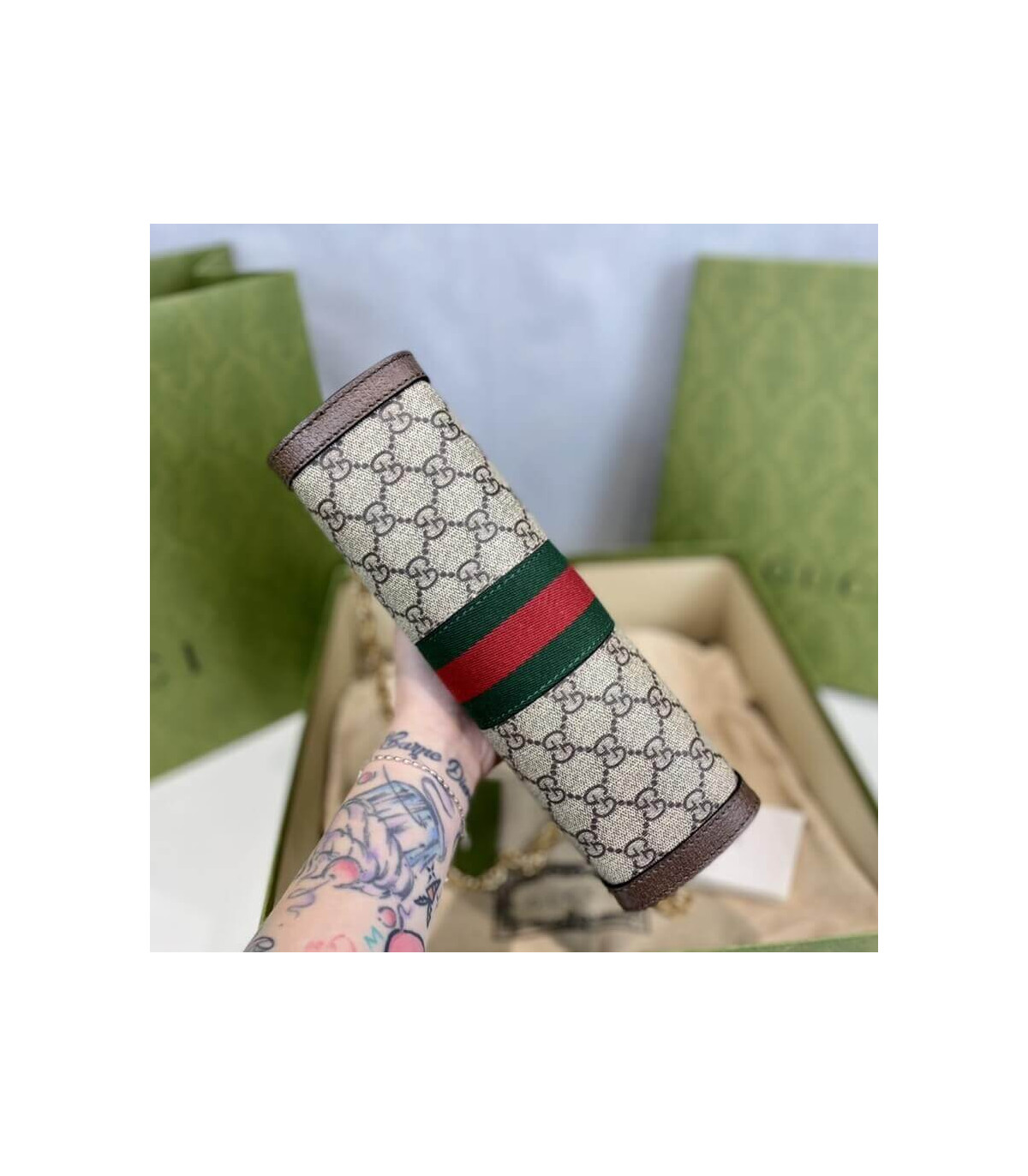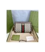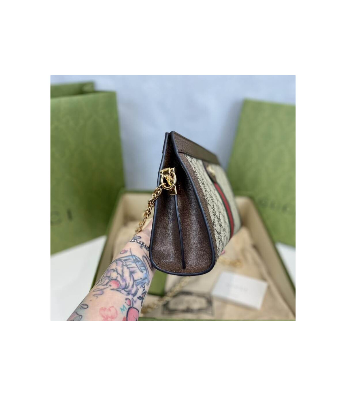 Crafted in GG Supreme canvas with inlaid Web stripe detail, the chain strap shoulder bag boasts a vintage inspired design. The structured shape secures with a magnetic closure, trimmed with leather and Double G hardware—an archival detail.