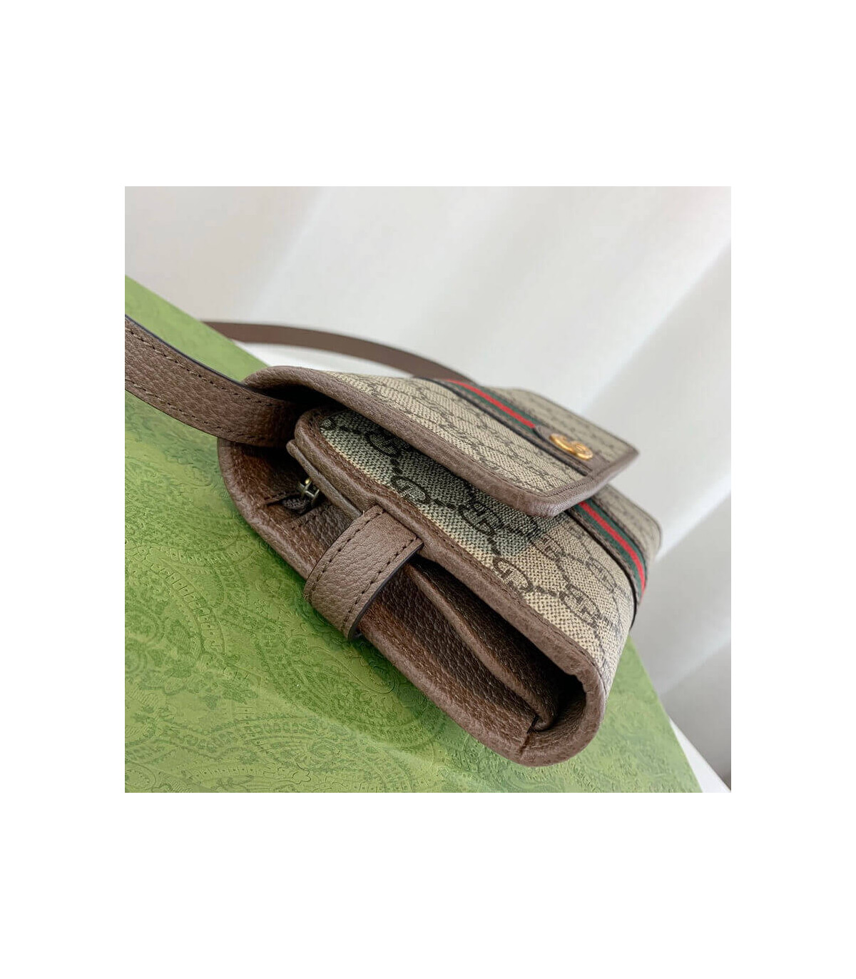 The world of Ophidia evolves with the introduction of a mini bag crafted in the House’s signature monogram canvas with inlaid green and red Web stripe. The accessory is enhanced by the Double G, an archival Gucci code from the ’70s