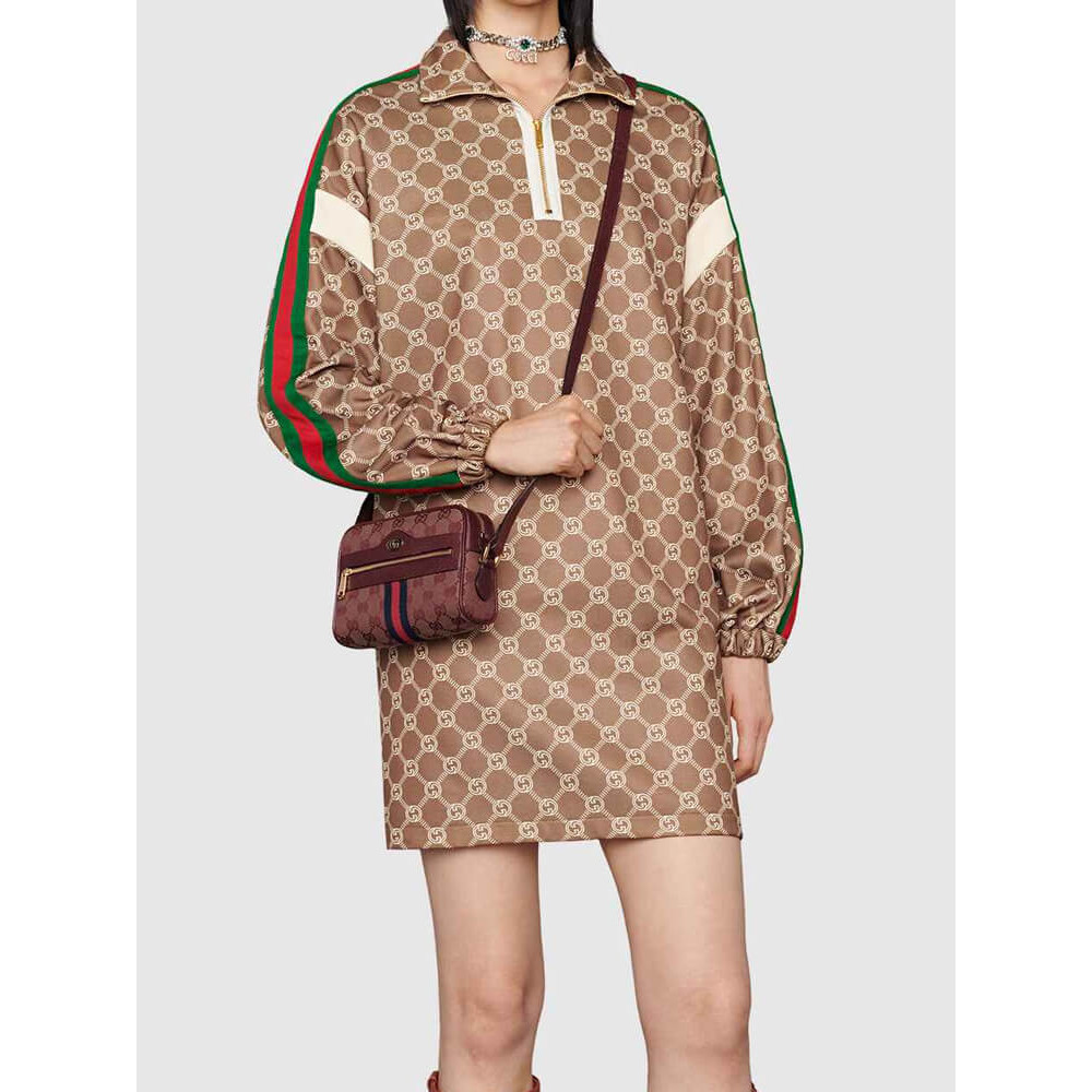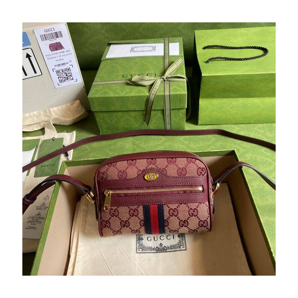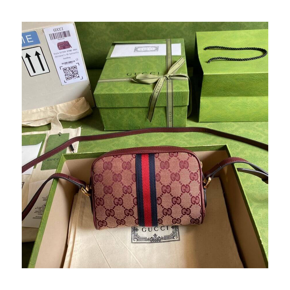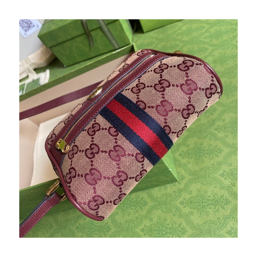 The mini Ophidia shoulder bag is introduced in a new iteration as a part of the Aria collection, crafted from Original GG canvas with inlaid blue and red Web stripe. The coveted style is defined by small Double G details at the front tab and zipper pulls—a contemporary take on a Gucci archival belt buckle from the ’70s, repurposed into a precious petite variation.