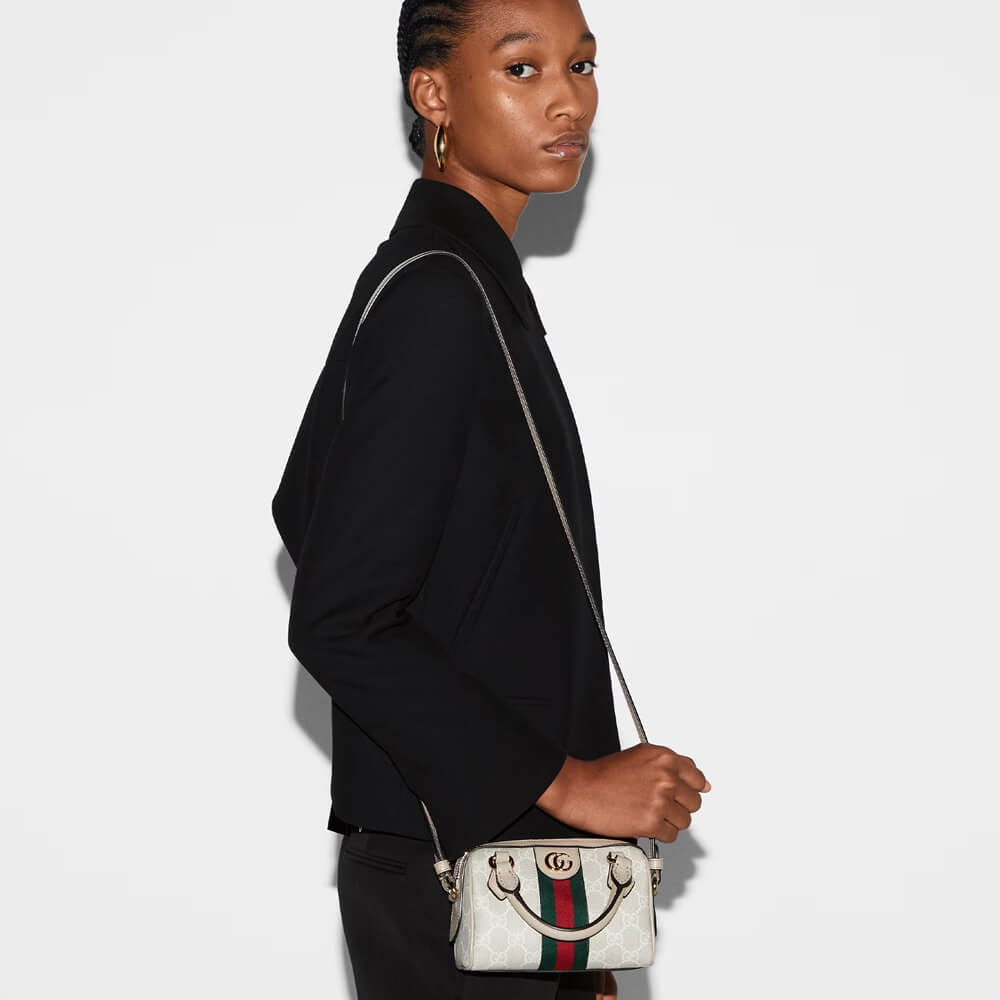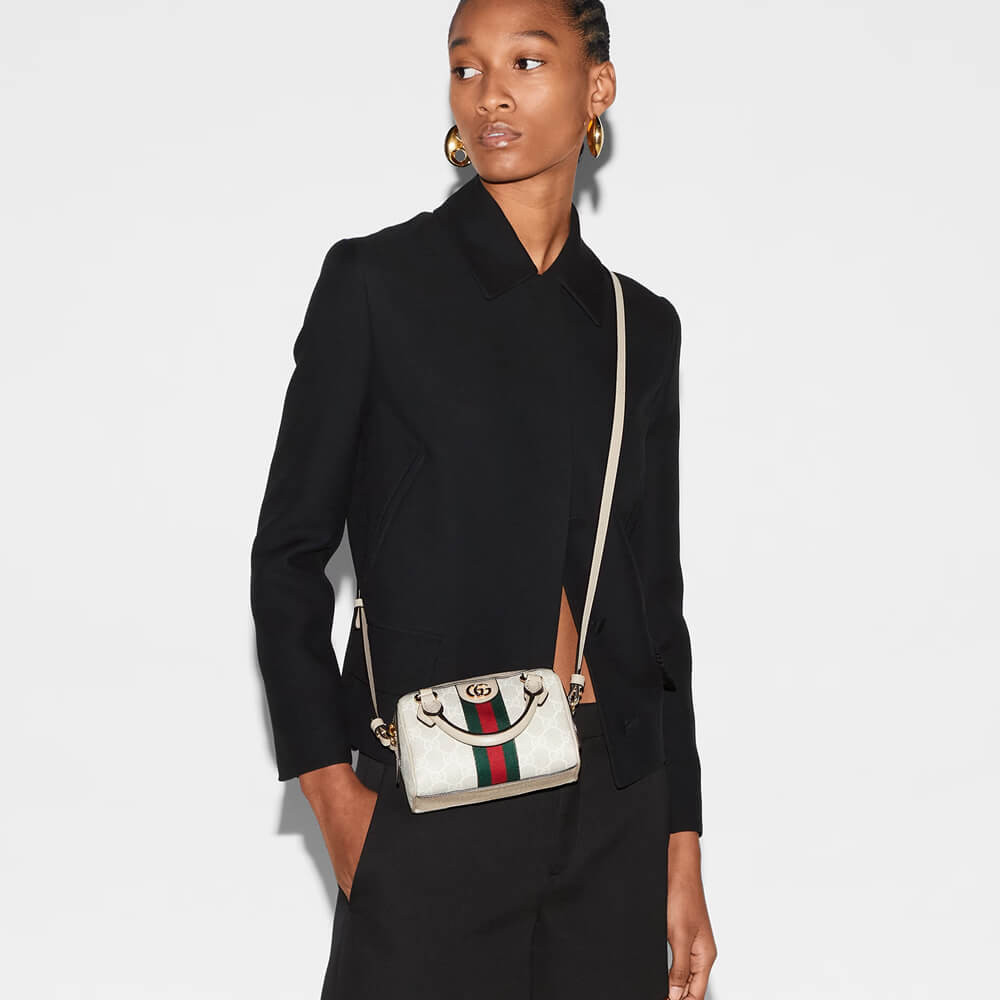 A timeless blend of heritage and modern charm, this mini Boston bag from the Ophidia line is crafted from beige and ebony GG Supreme canvas. Featuring the iconic green and red Web stripe and Double G hardware, the structured silhouette is completed with brown leather trim and gold-toned accents. A detachable shoulder strap offers versatile carrying options.