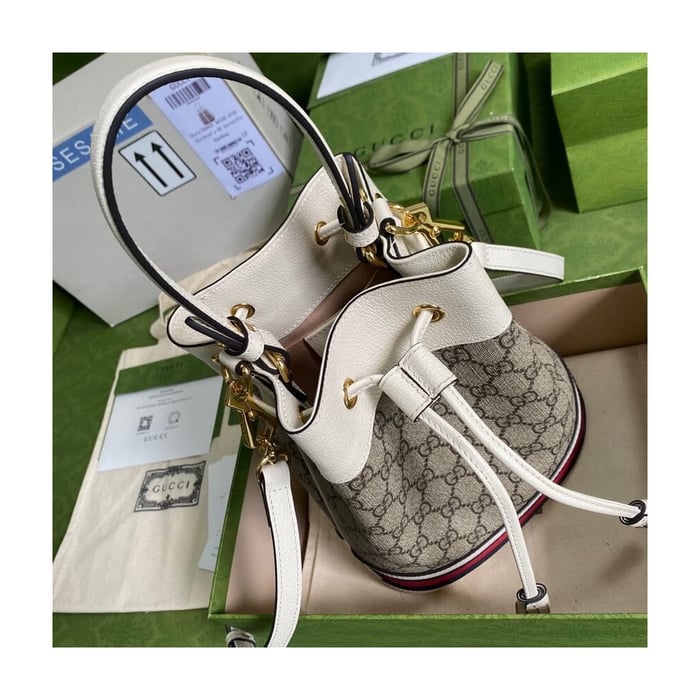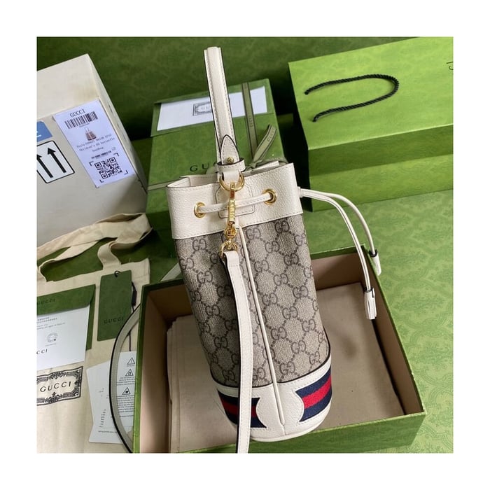 The world of Ophidia evolves with the introduction of a new bucket bag shape. Crafted in GG Supreme canvas with inlaid green and red Web stripe along the bottom. The accessory is completed with a single top handle and detachable shoulder strap for two different ways to wear it.