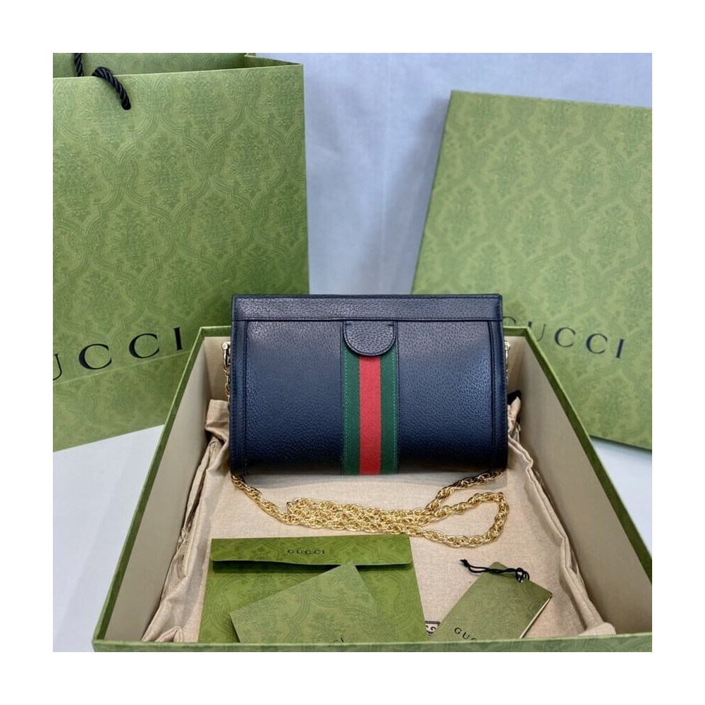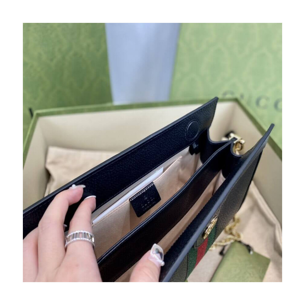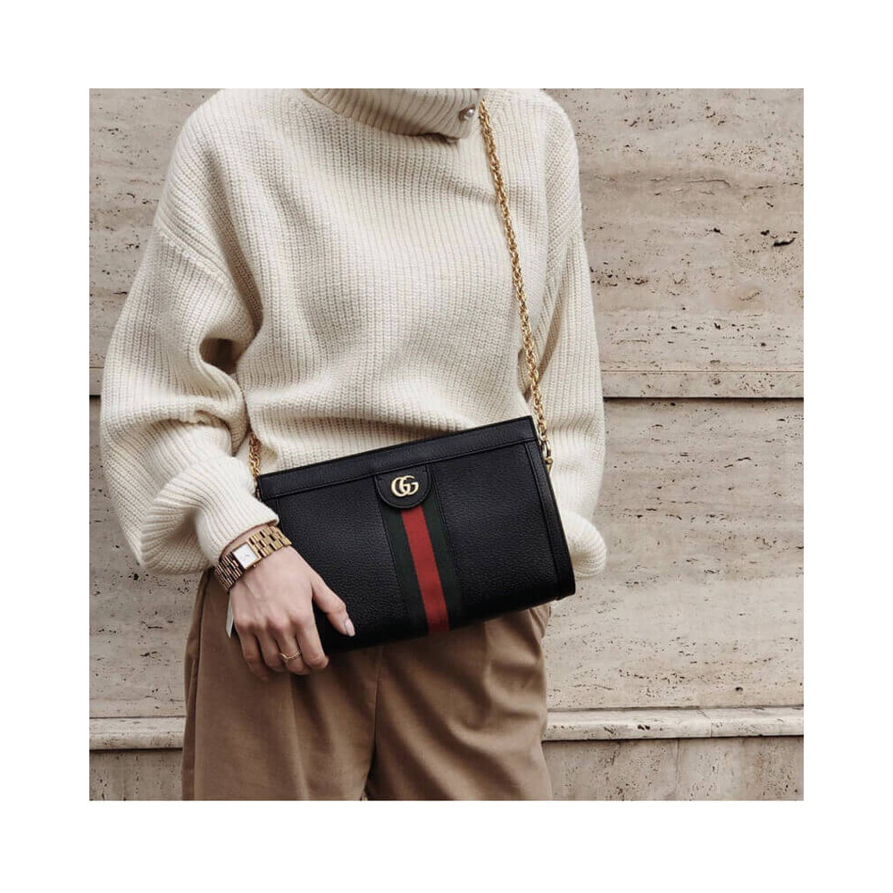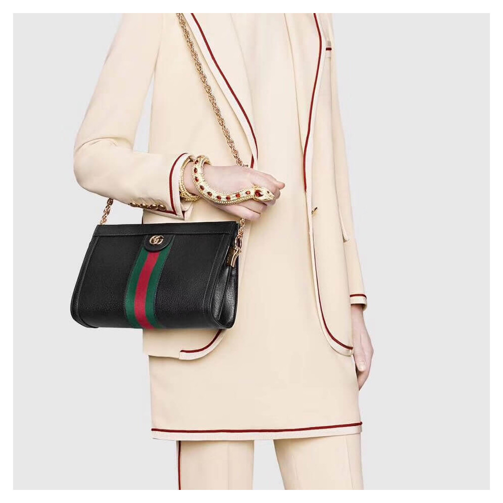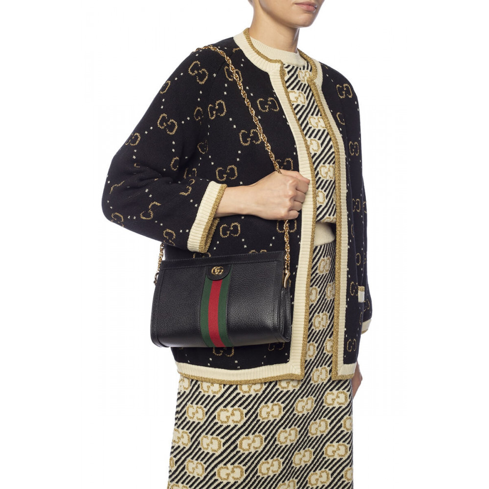 The small chain Ophidia shoulder bag is introduced in a new iteration for Pre-Fall 2019, crafted from black leather with inlaid green and red Web stripe. The coveted style is defined by small Double G details at the front tab—a contemporary take on a Gucci archival belt buckle from the ’70s, repurposed into a precious petite variation.