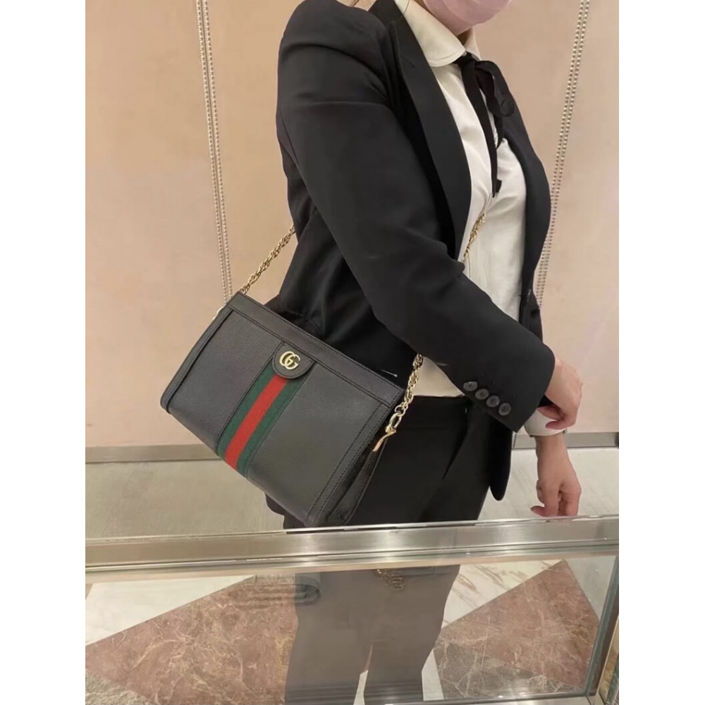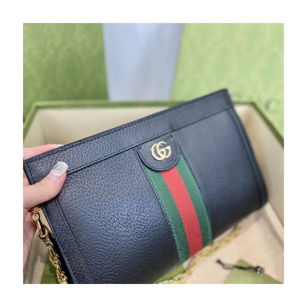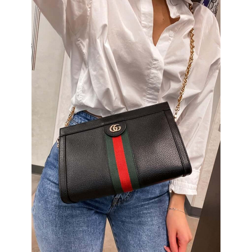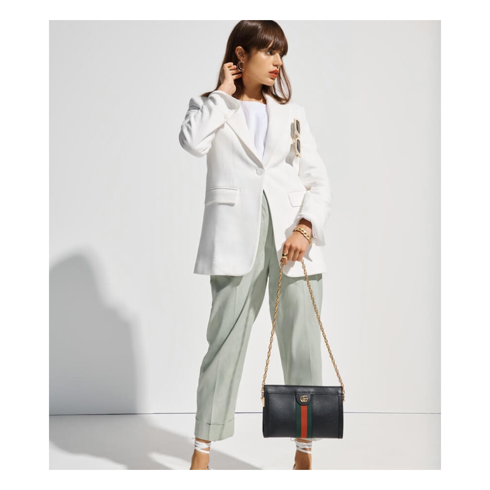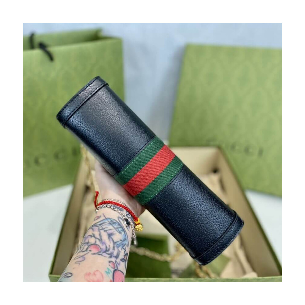 The small chain Ophidia shoulder bag is introduced in a new iteration for Pre-Fall 2019, crafted from black leather with inlaid green and red Web stripe. The coveted style is defined by small Double G details at the front tab—a contemporary take on a Gucci archival belt buckle from the ’70s, repurposed into a precious petite variation.
