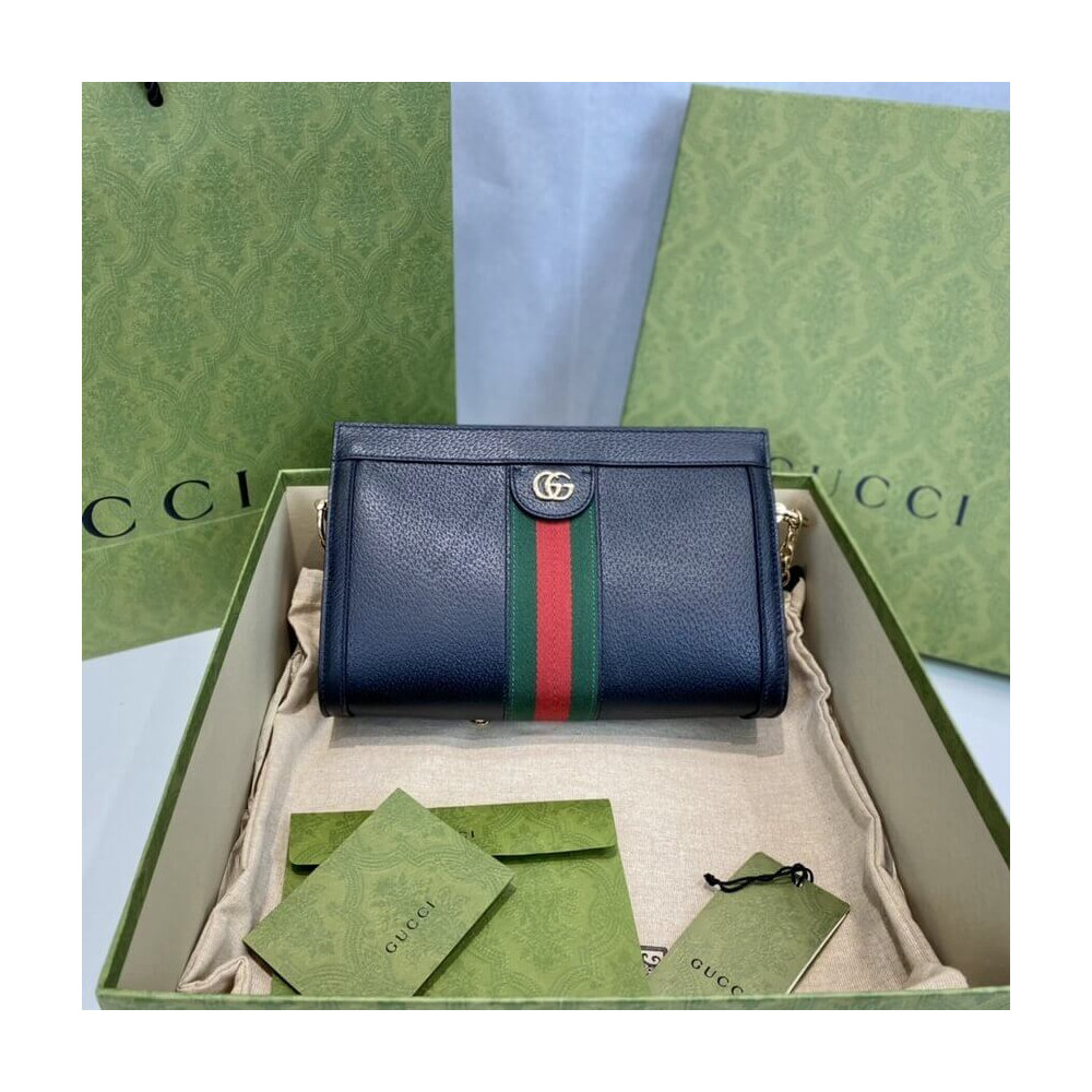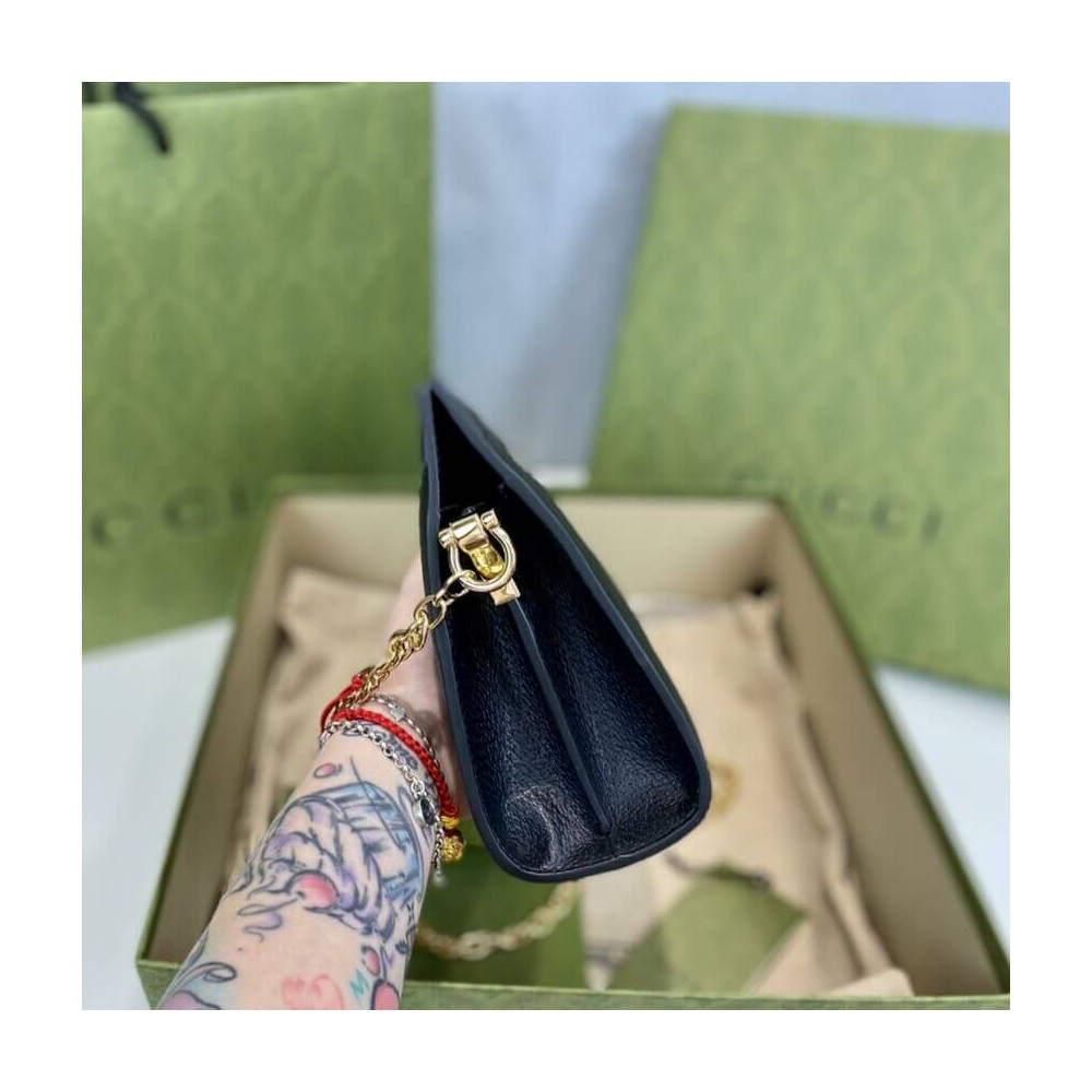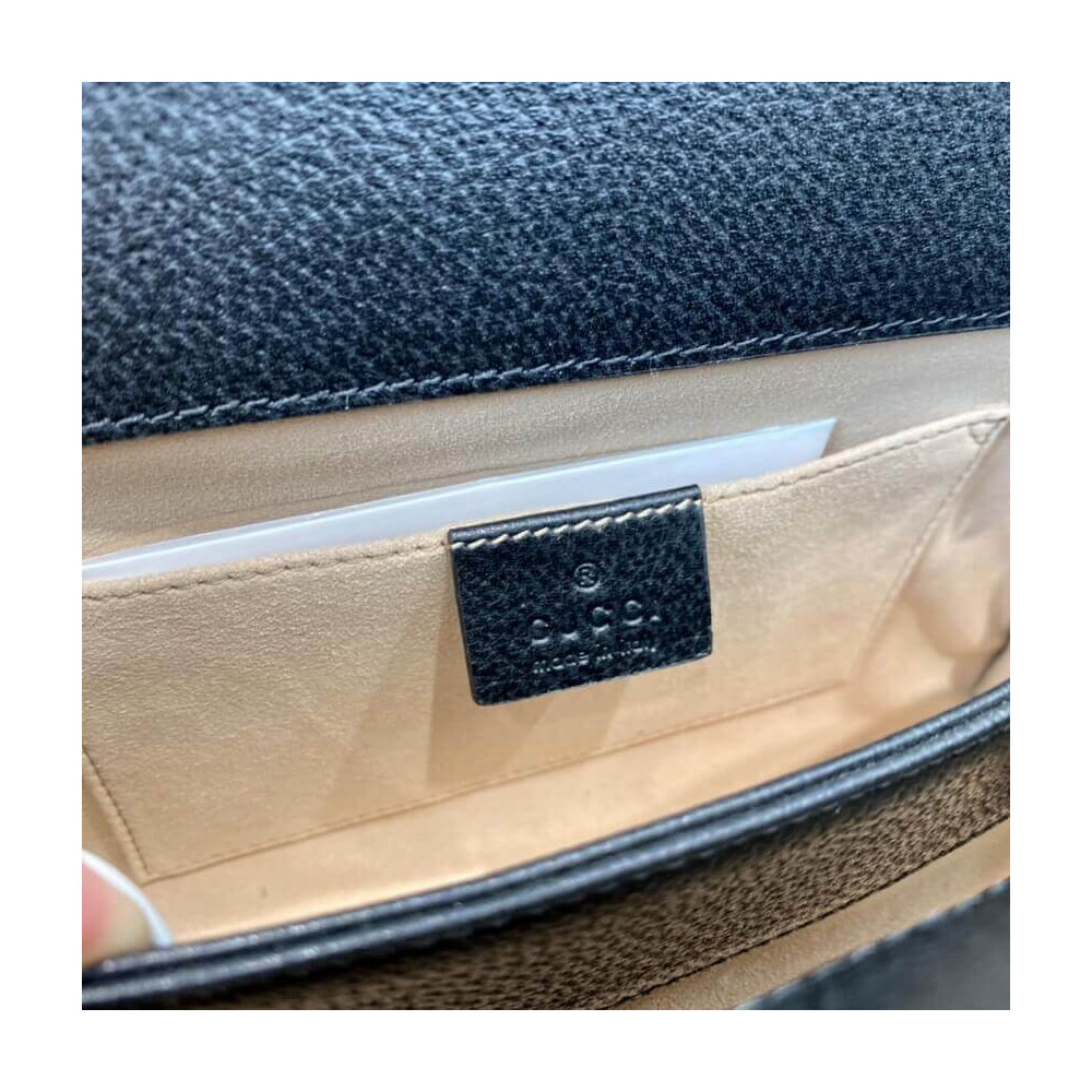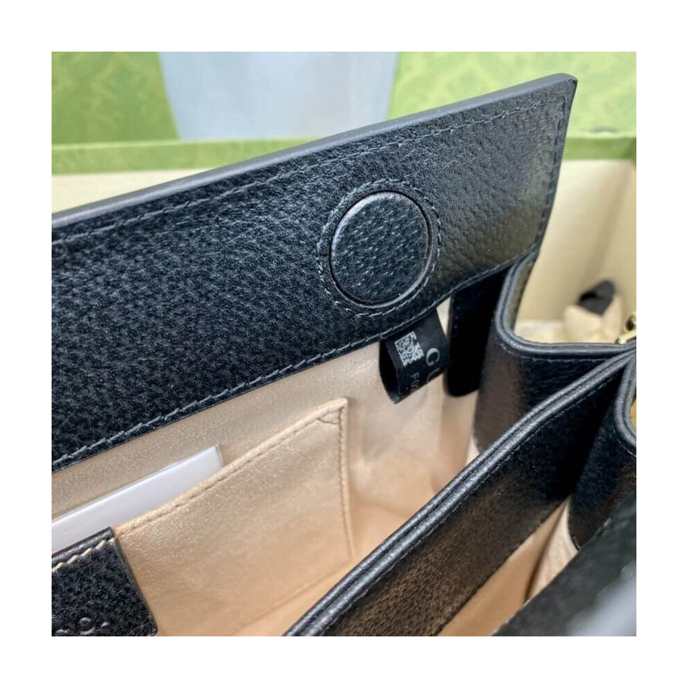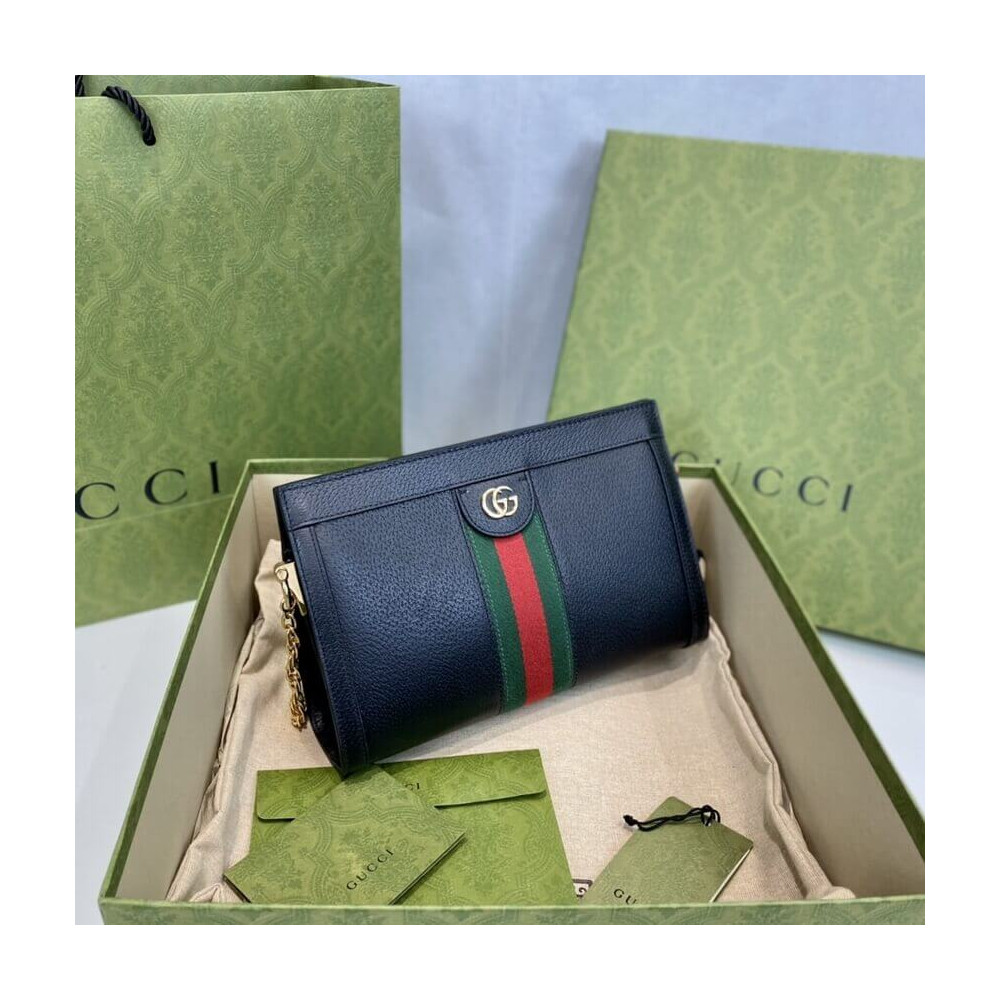 The small chain Ophidia shoulder bag is introduced in a new iteration for Pre-Fall 2019, crafted from black leather with inlaid green and red Web stripe. The coveted style is defined by small Double G details at the front tab—a contemporary take on a Gucci archival belt buckle from the ’70s, repurposed into a precious petite variation.