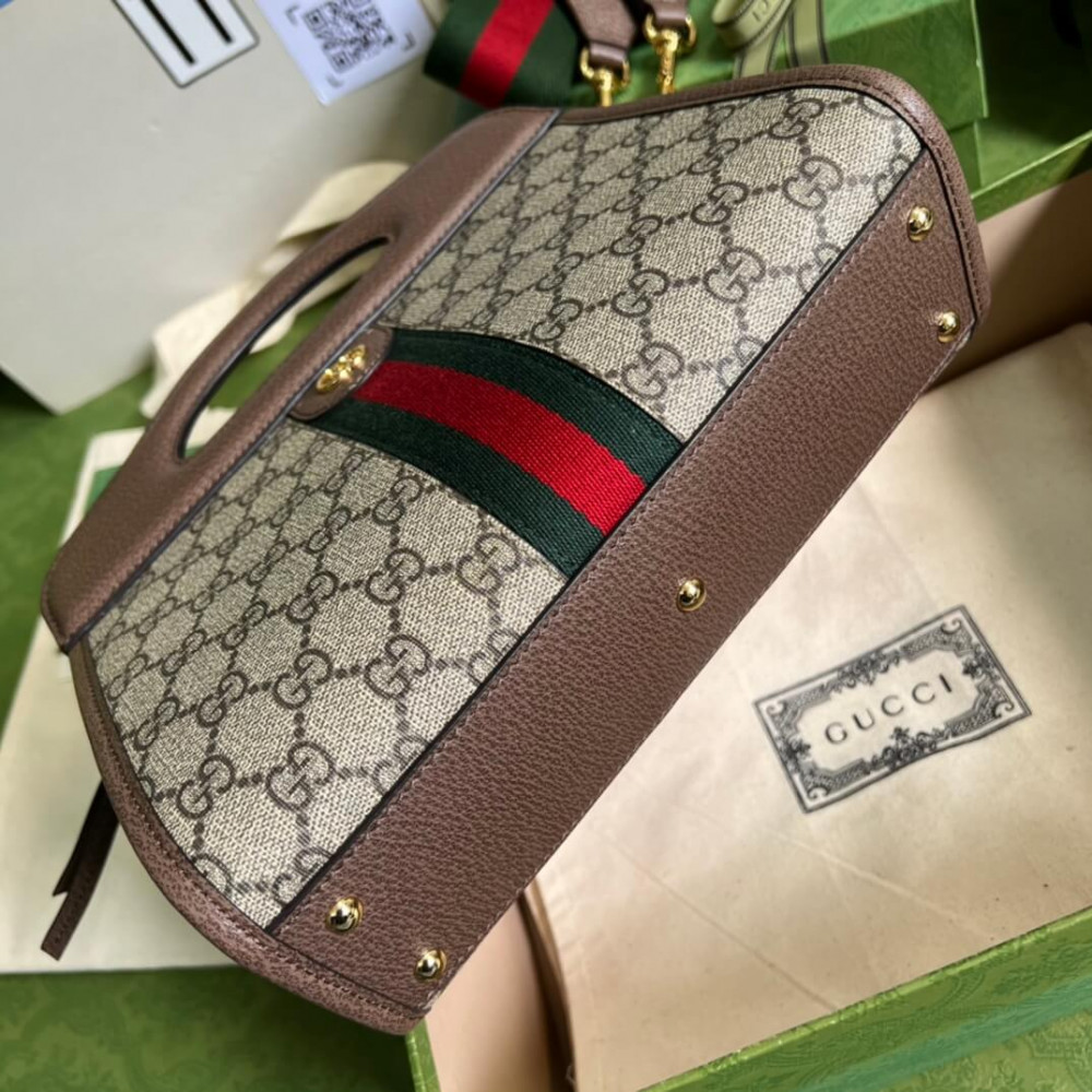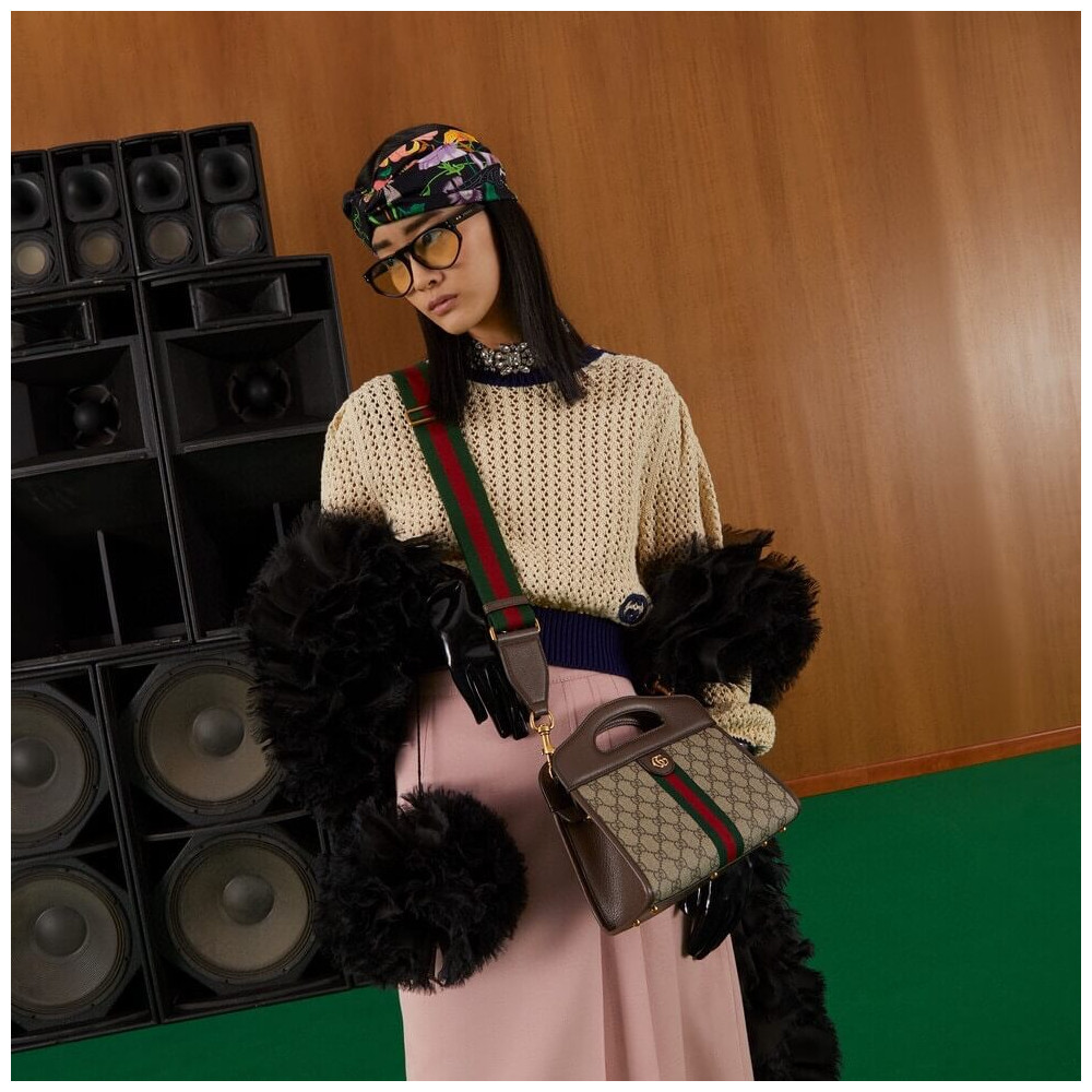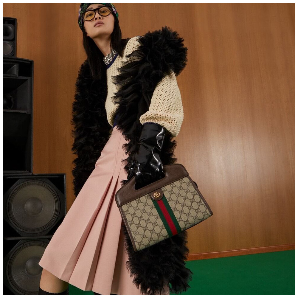 Mirroring the material’s historic origins, GG Supreme is introduced in a timeless mix of blue and beige for Gucci Love Parade. The canvas has come to the front of each collection decade after decade to become a hallmark of the House. Here, the classic palette defines this small Ophidia tote bag.