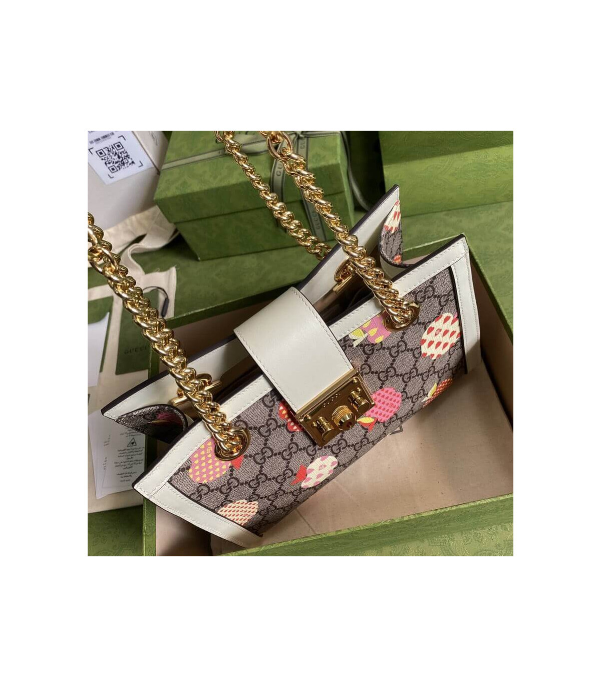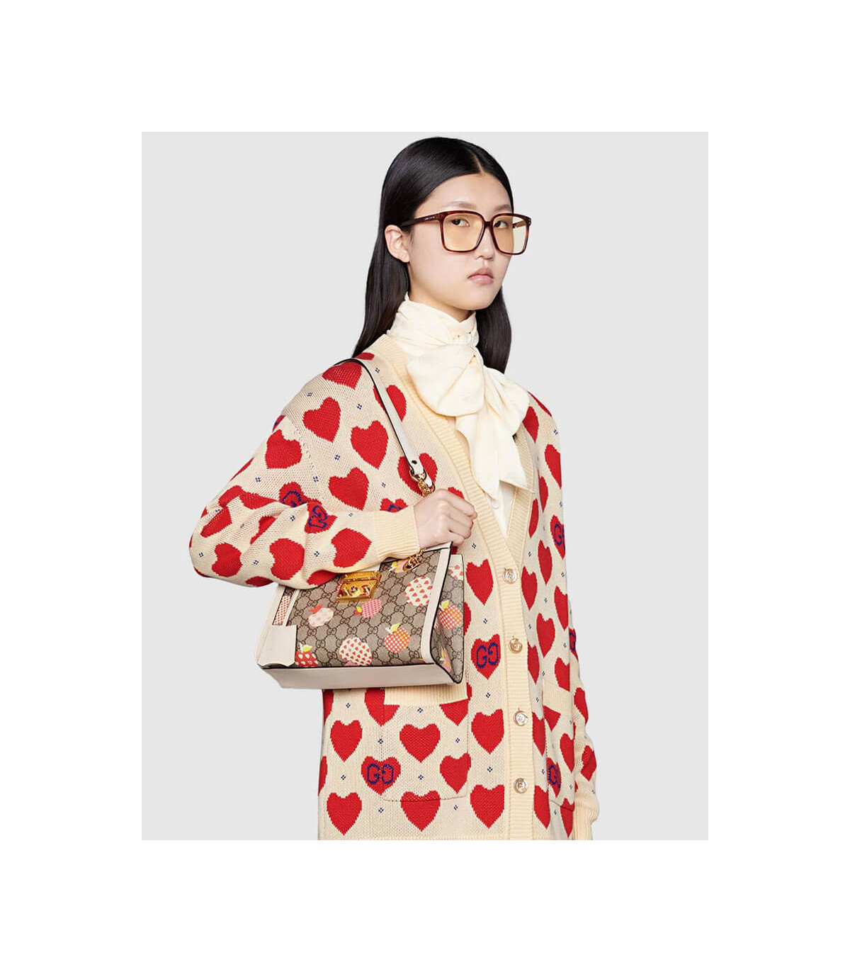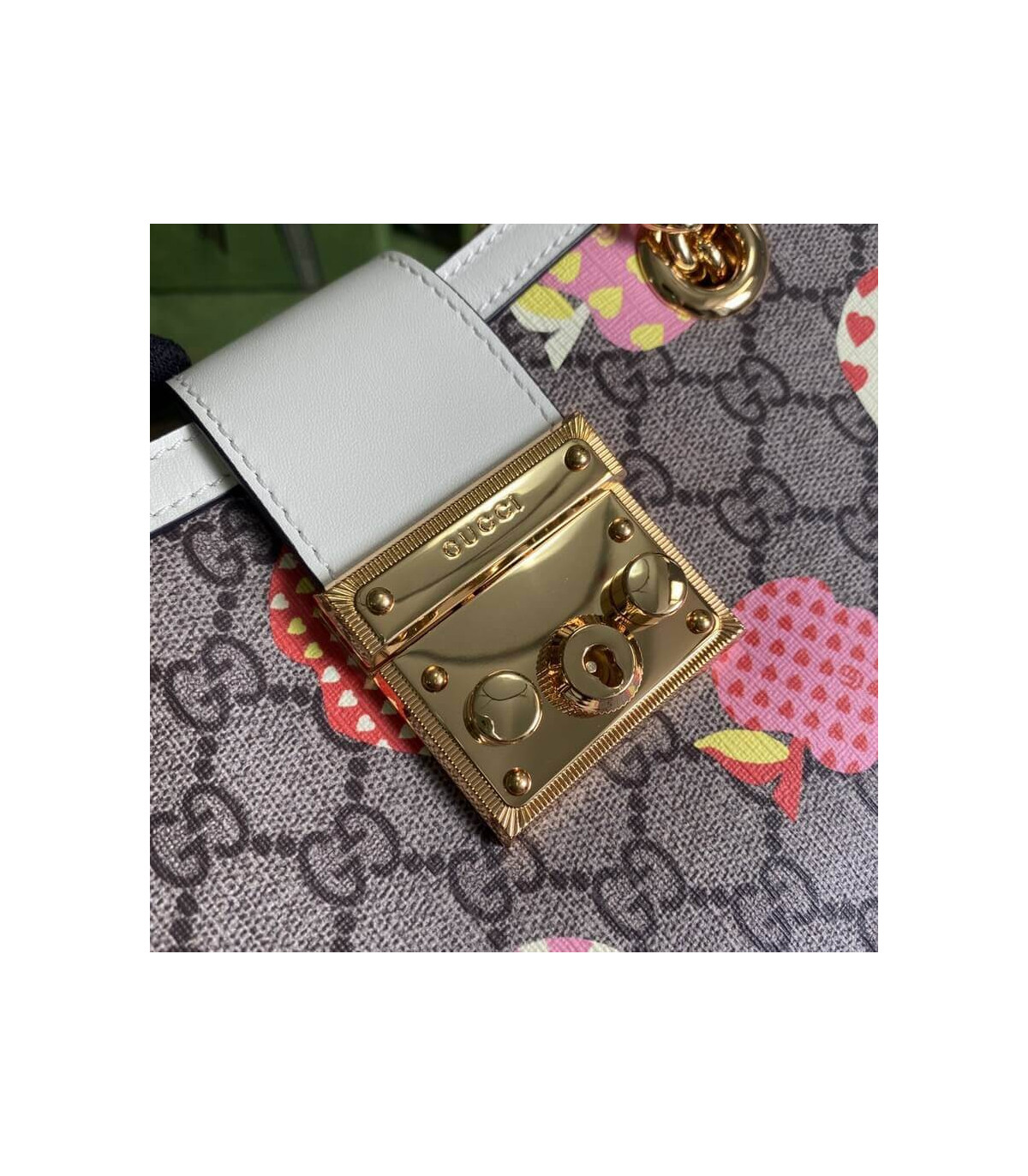 Fruits and vegetables have become the brand’s current fashion design elements, injecting full vitality into the new series, vividly interpreting the brand’s innocent and fun mood. This small Padlock series shoulder bag uses an interesting Gucci heart apple pattern to echo the theme.