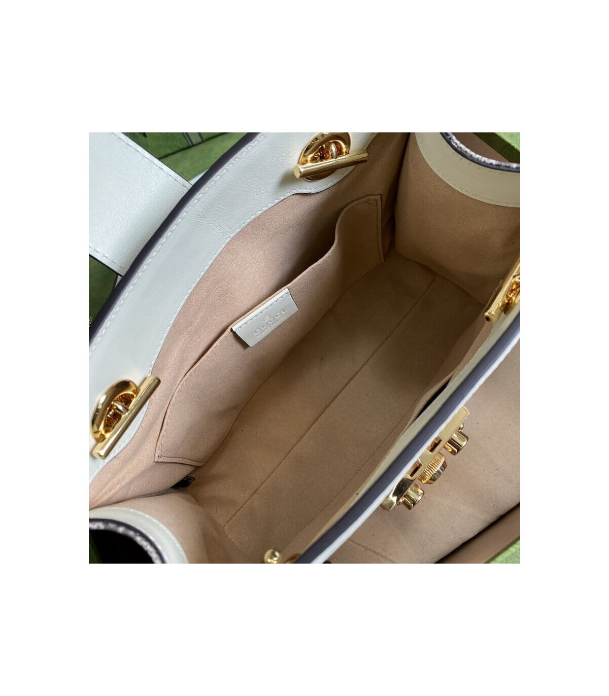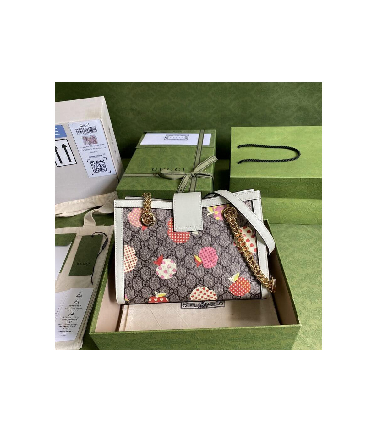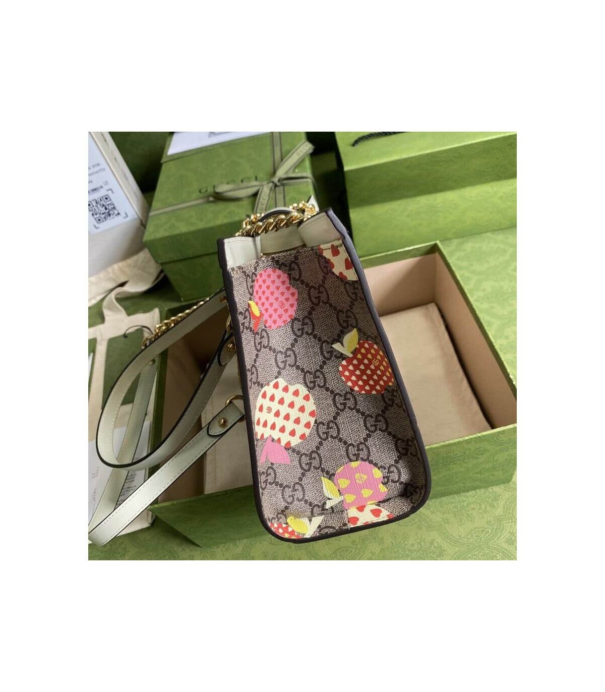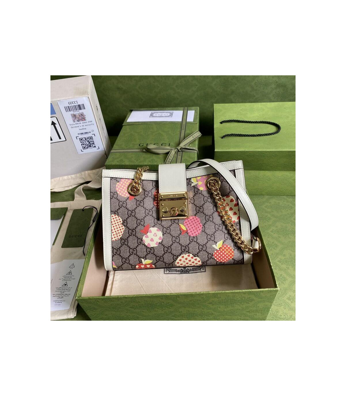 Fruits and vegetables have become the brand’s current fashion design elements, injecting full vitality into the new series, vividly interpreting the brand’s innocent and fun mood. This small Padlock series shoulder bag uses an interesting Gucci heart apple pattern to echo the theme.
