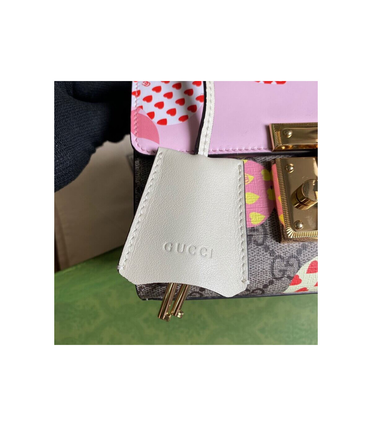 Fruits and vegetables become the brand’s current fashion design elements, injecting full vitality into the new series, vividly interpreting the brand’s innocent and fun mood. This small Padlock series shoulder bag uses an interesting Gucci heart apple pattern to echo the theme.