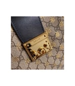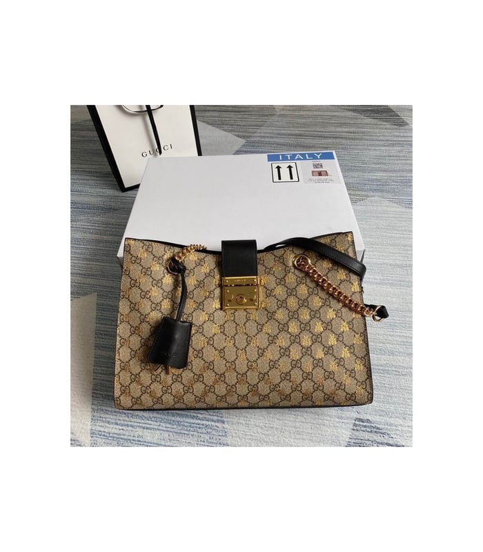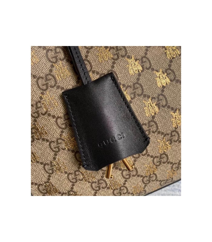 A structured shoulder bag in the GG motif, enriched with allover gold printed bees—a historical symbol from the House archives, first introduced in the 1970s. The strap secures with a key lock closure pulled straight from the archives with the key placed in a detachable leather key case.