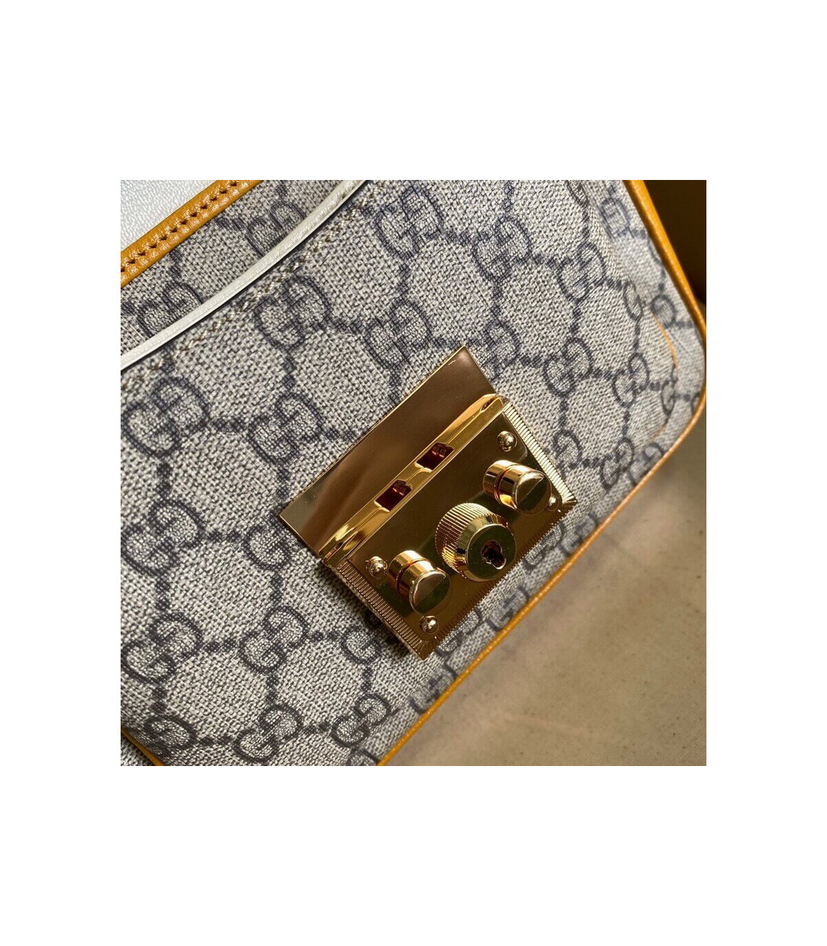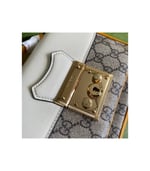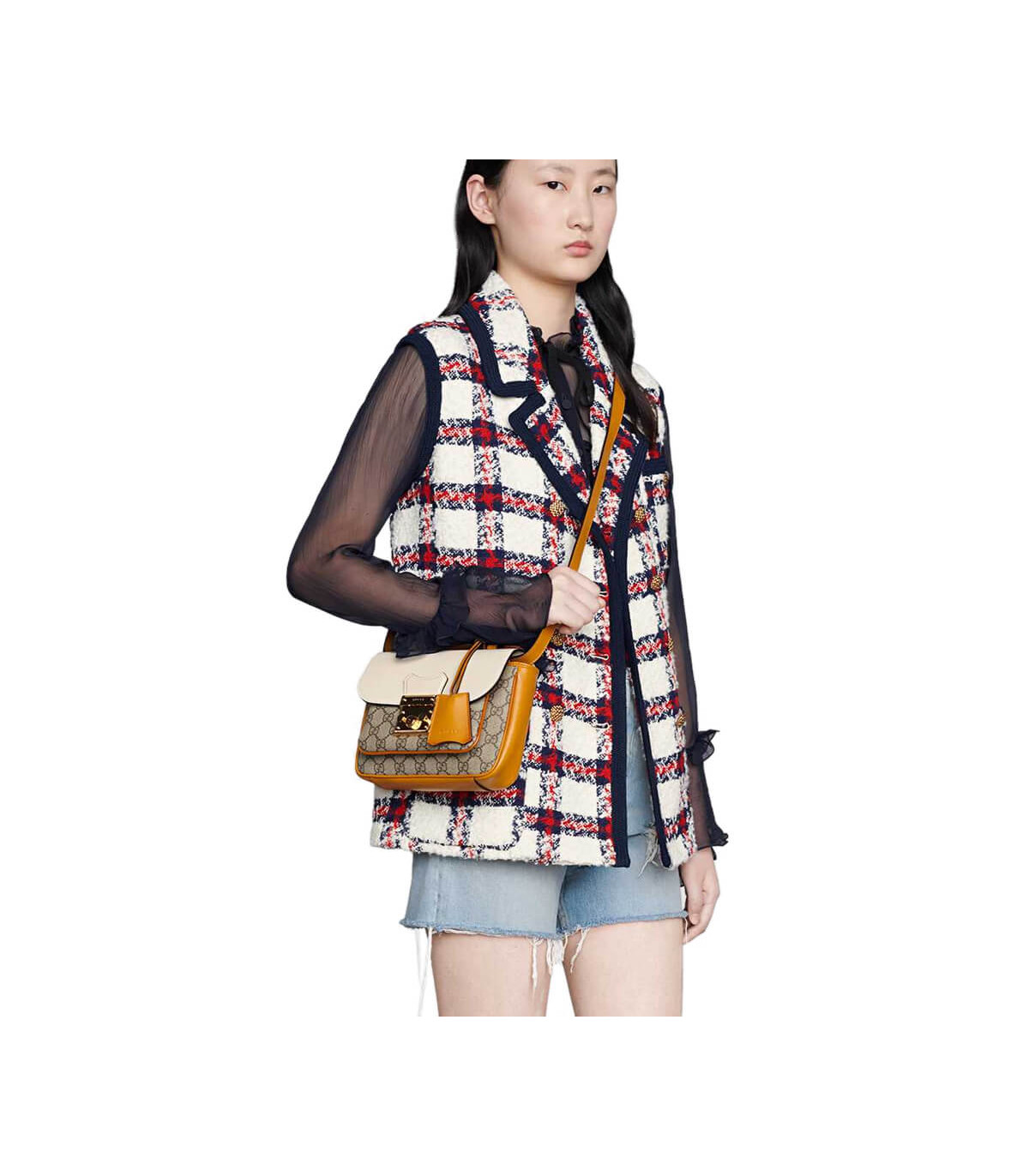 Inspired by a style from the archives, a mini version of the Padlock shoulder bag is introduced as a part of the Ouverture collection. Presented in a mix of white leather and GG Supreme canvas, the style is defined by the line’s signature key lock closure. A colourful orange leather trim completes the style.