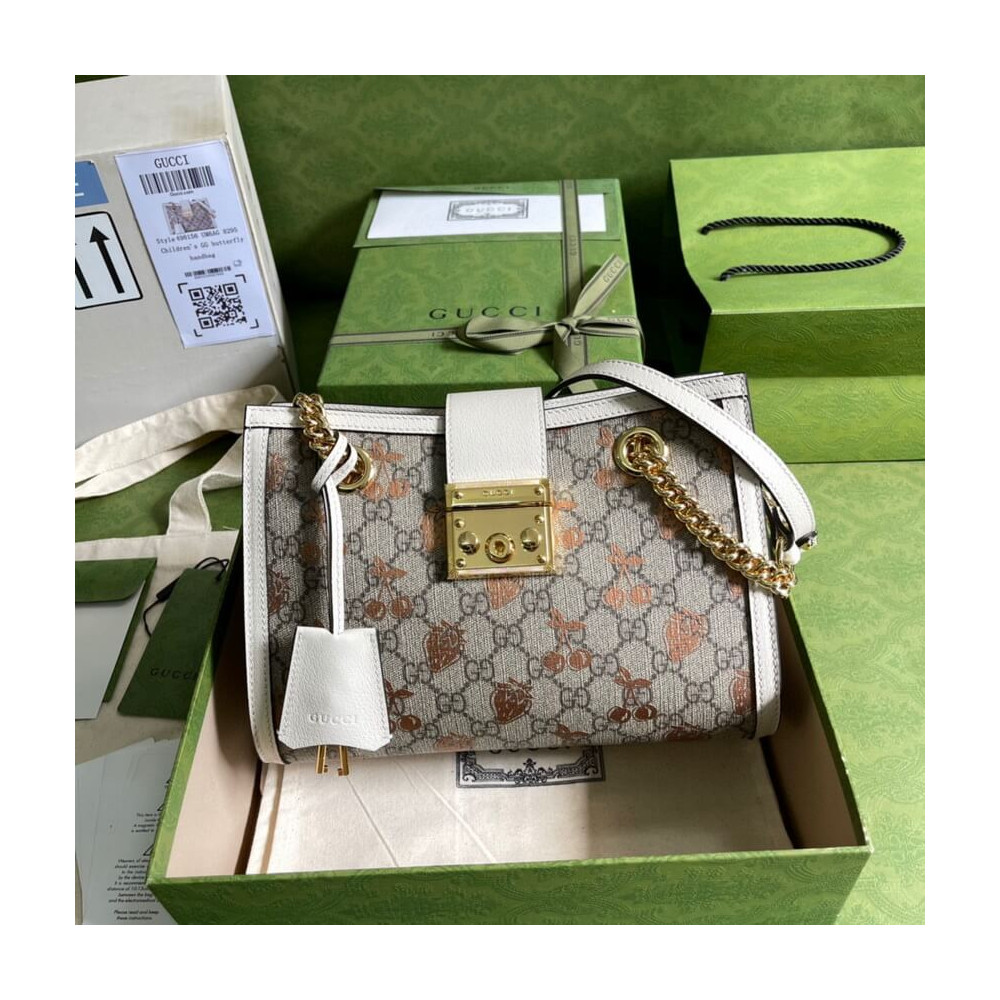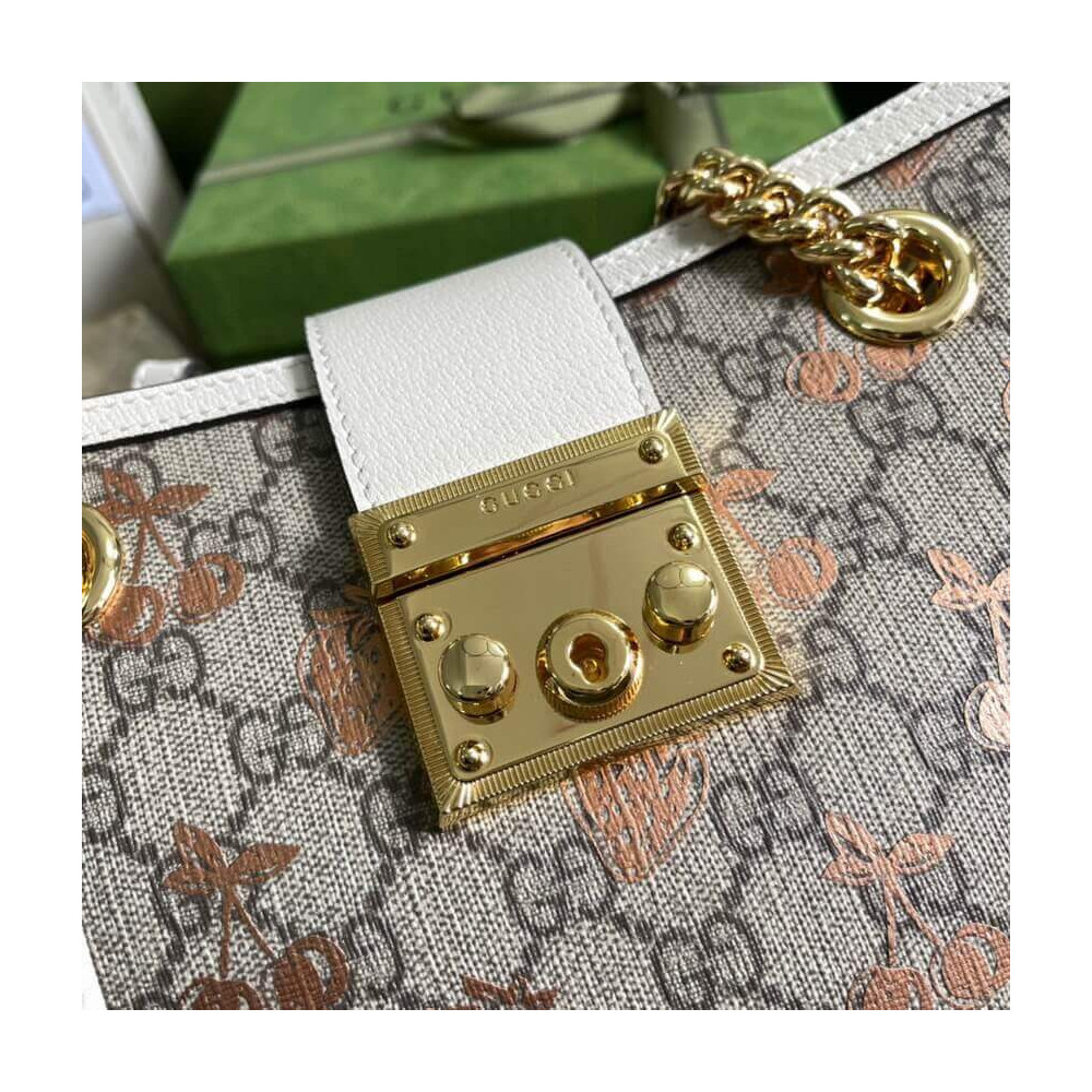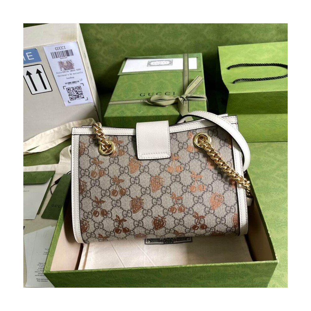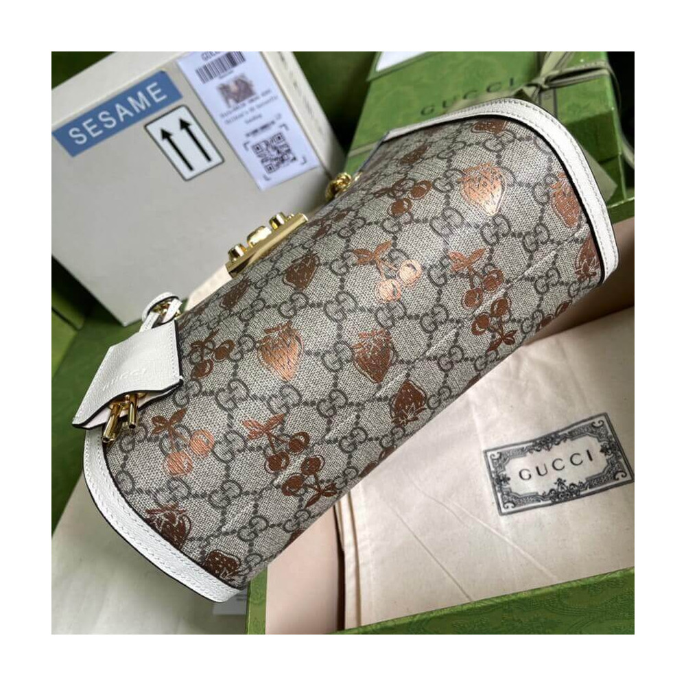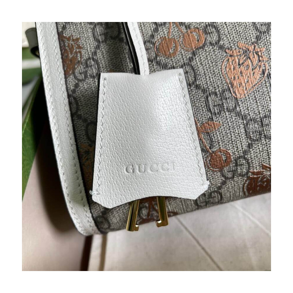 – Beige and ebony GG Supreme canvas with metallic cherry and strawberry print, a material with low environmental impact