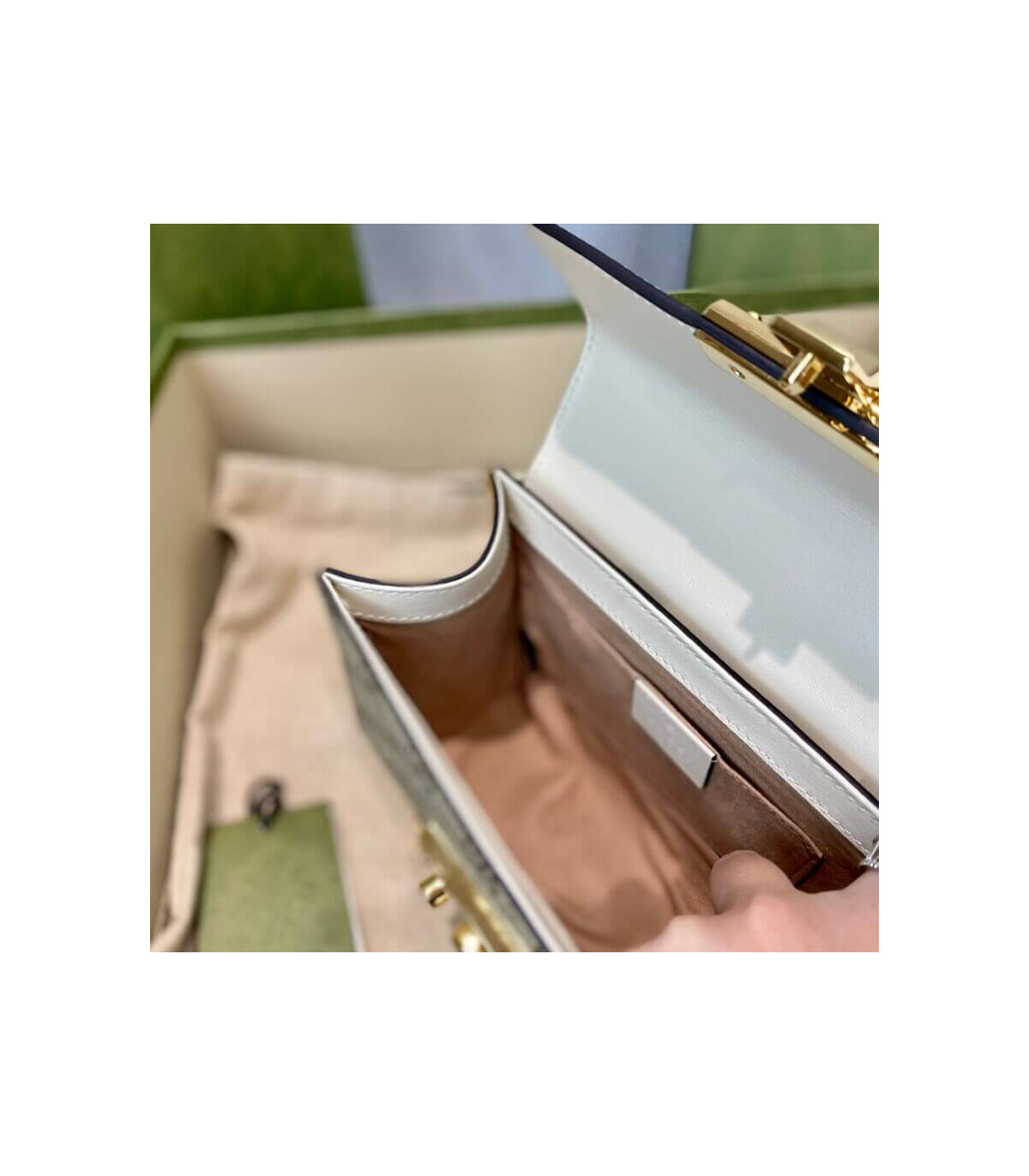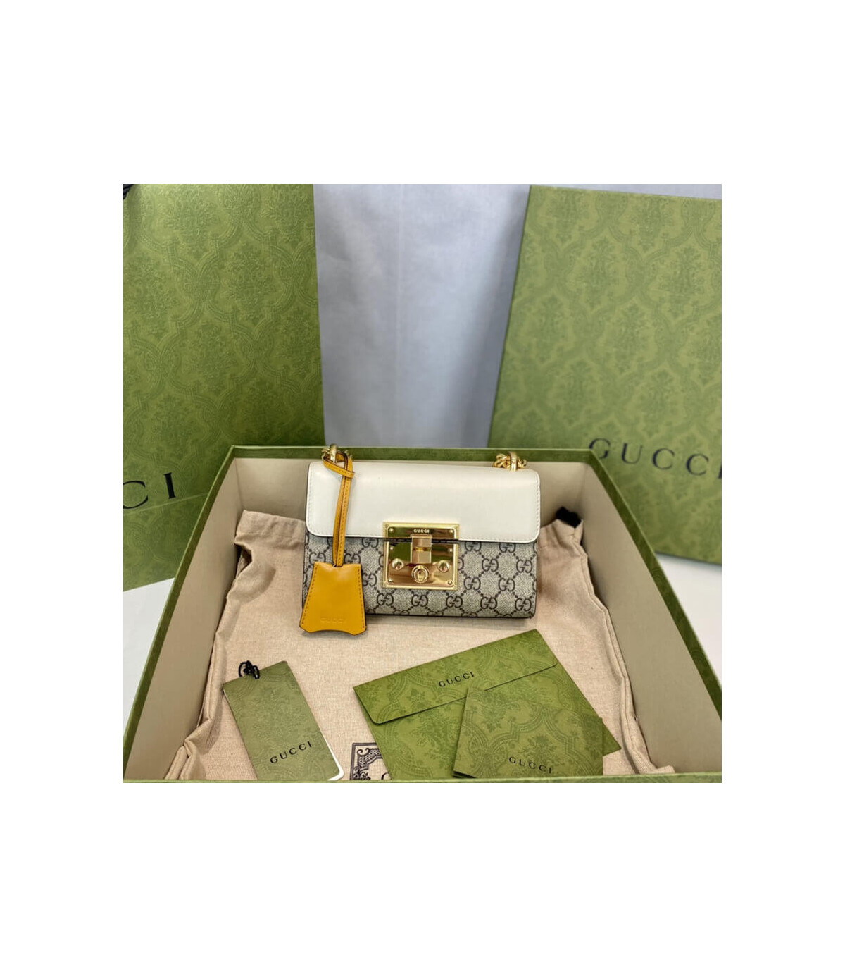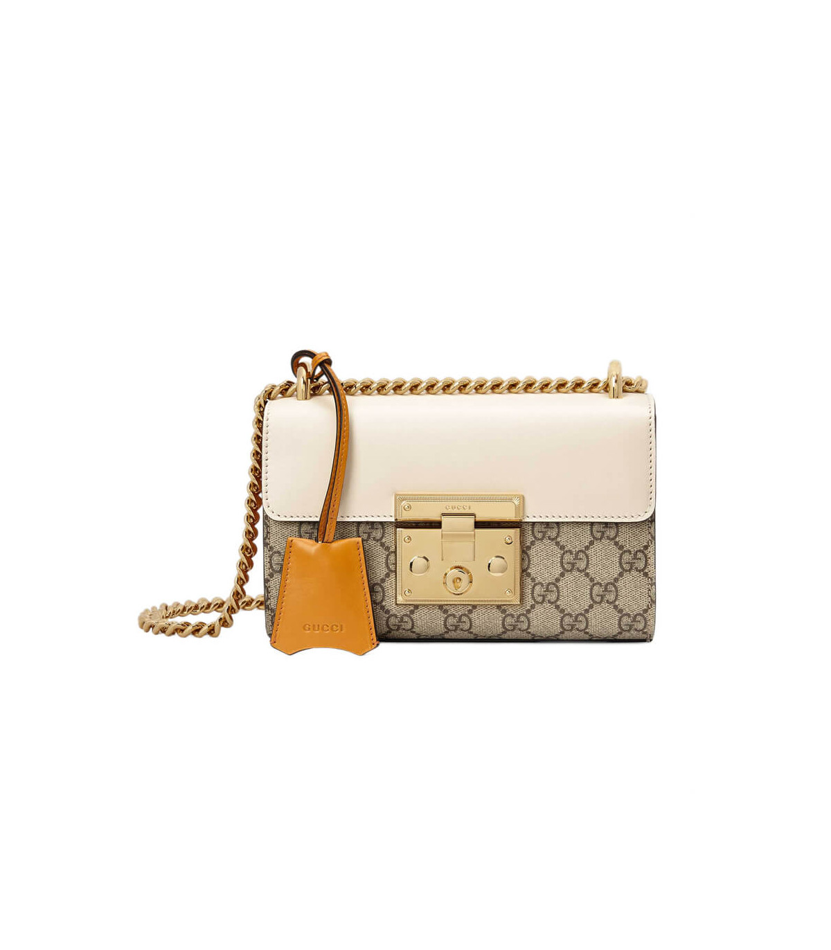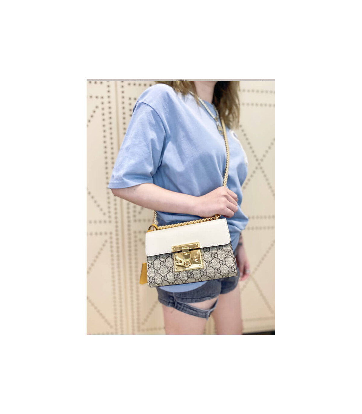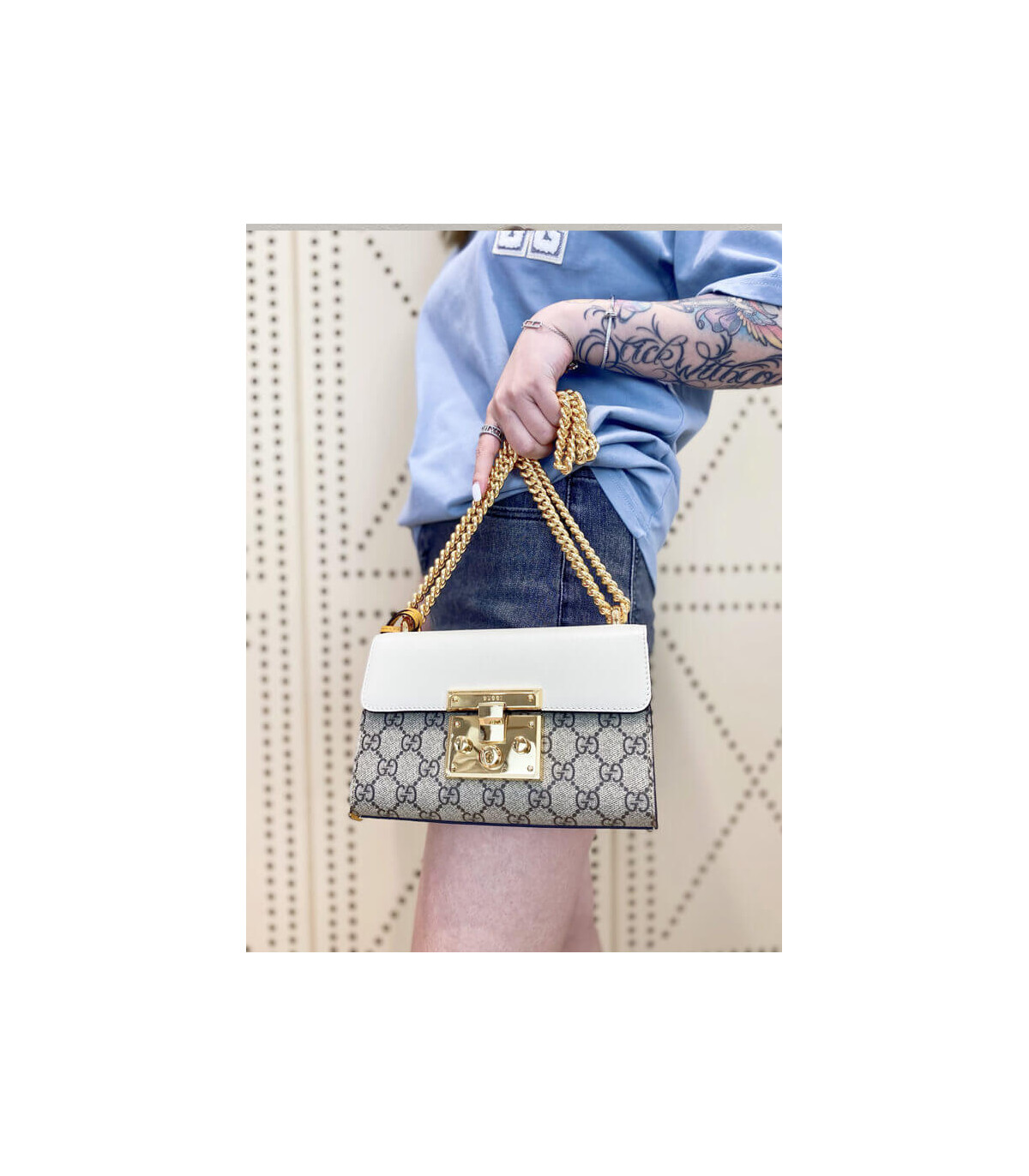 The Padlock’s structured shape is presented in GG Supreme canvas with a white leather upper. Recalling the brand’s origins in the world of leisure and luggage, the small shoulder bag is defined by its padlock closure.