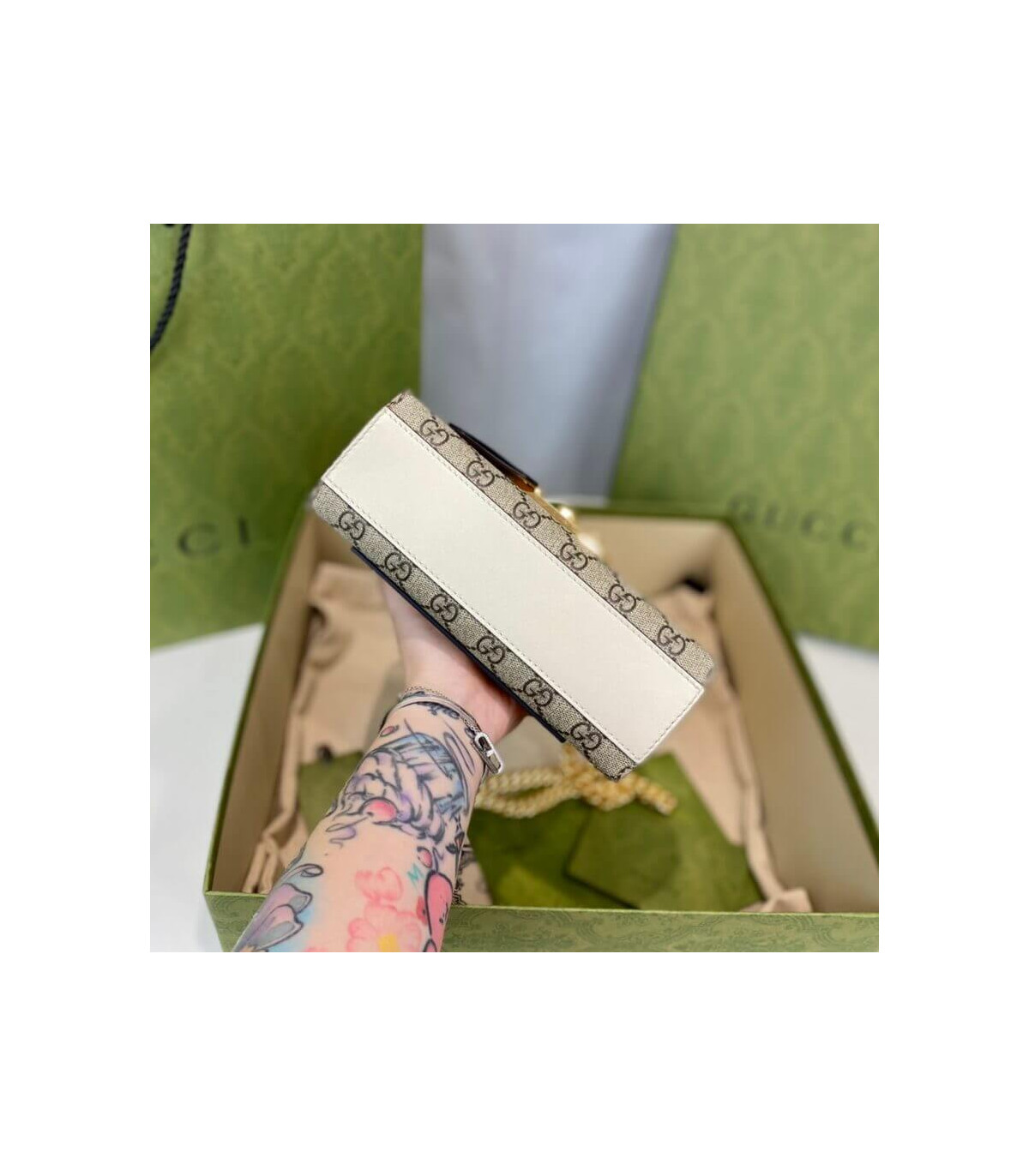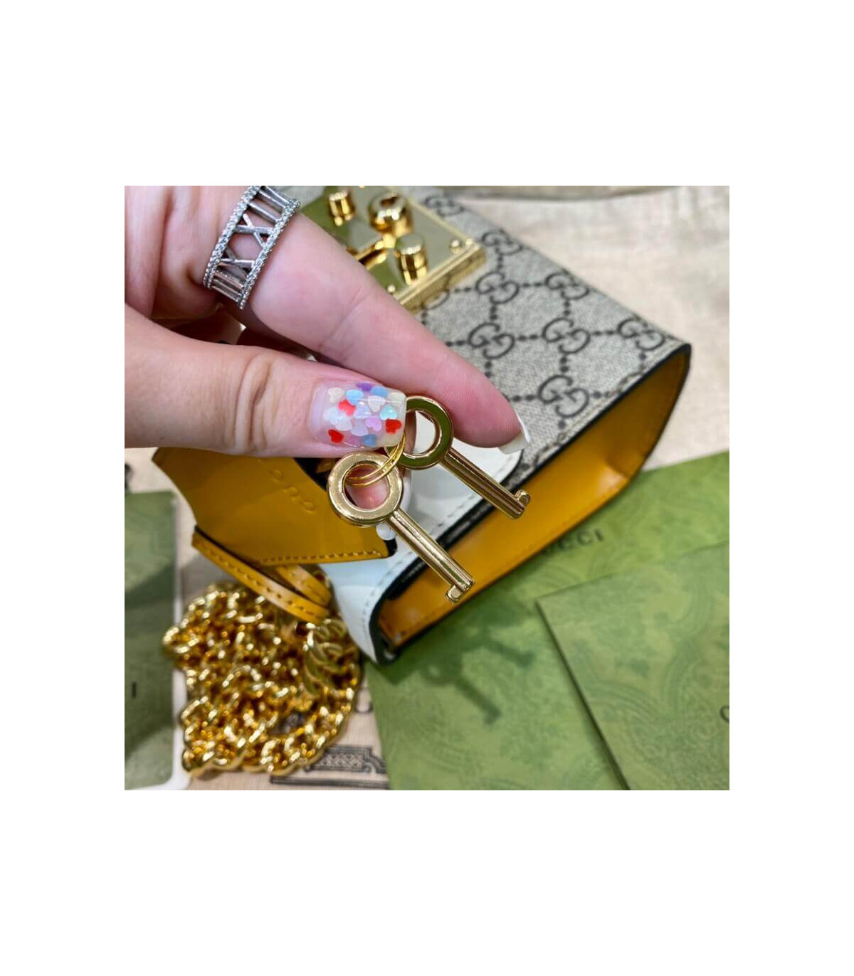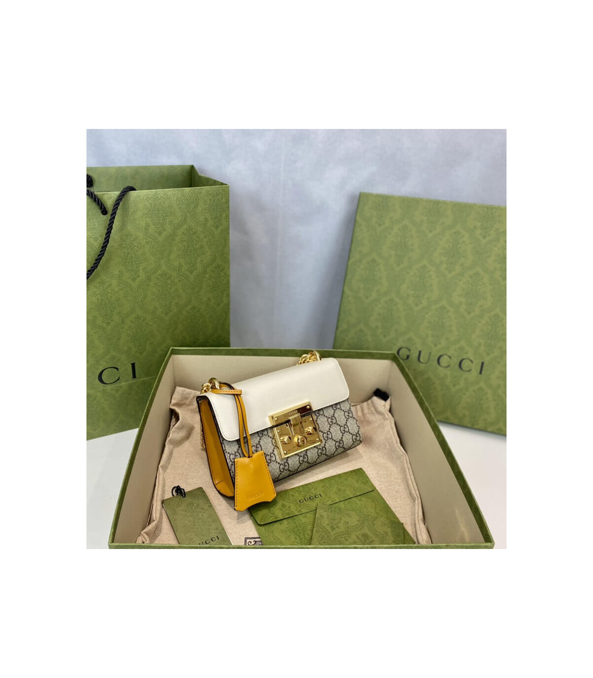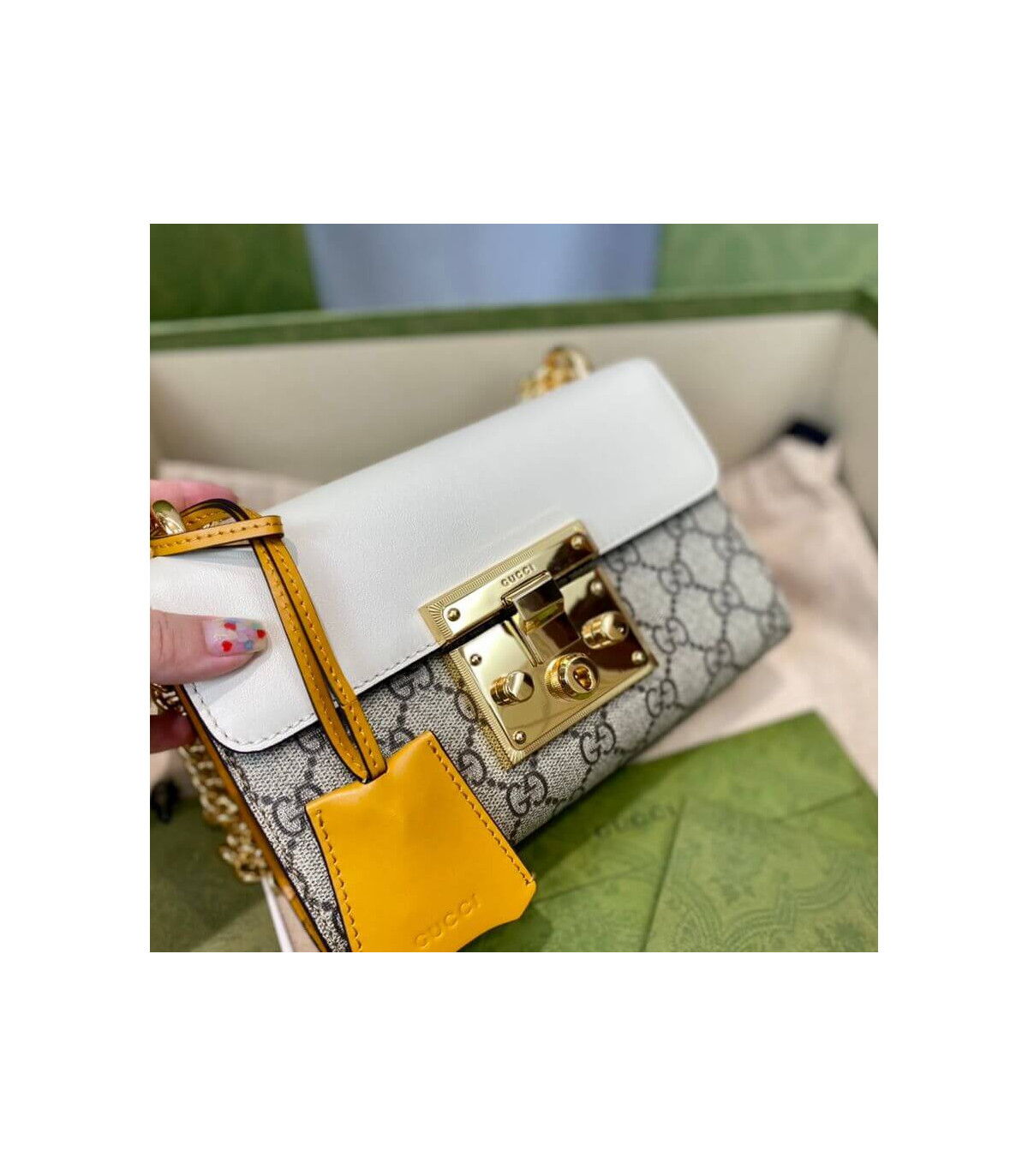 The Padlock’s structured shape is presented in GG Supreme canvas with a white leather upper. Recalling the brand’s origins in the world of leisure and luggage, the small shoulder bag is defined by its padlock closure.
