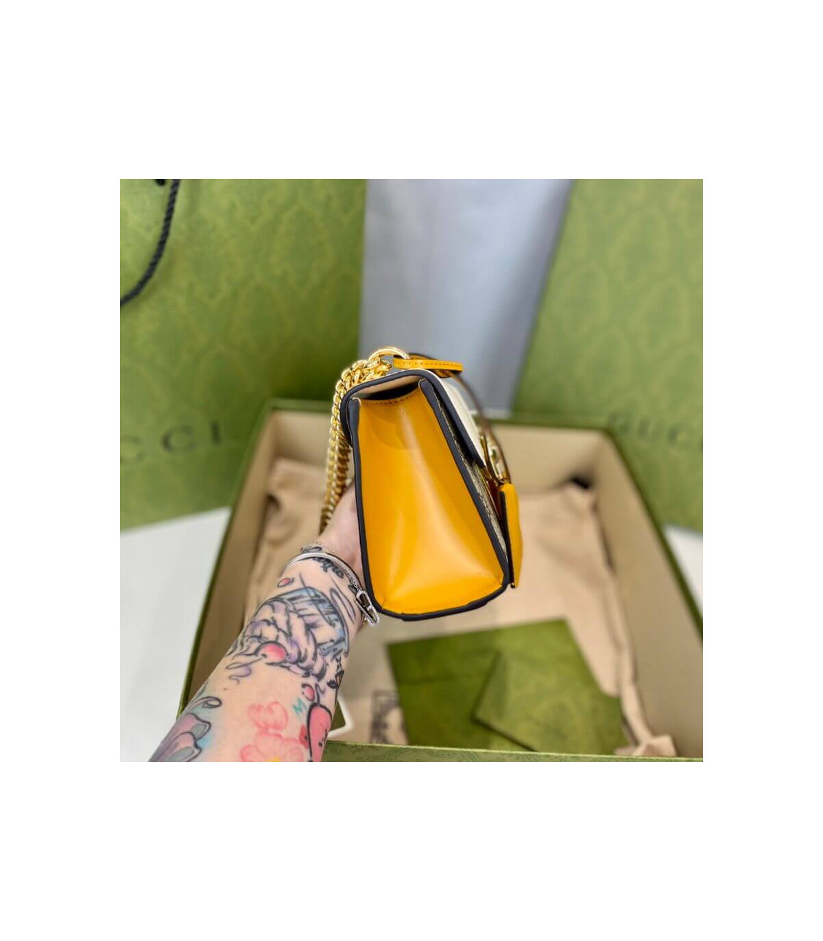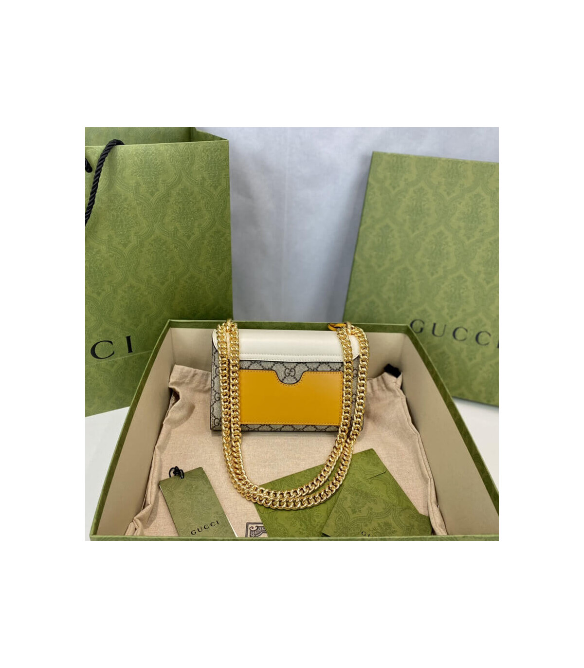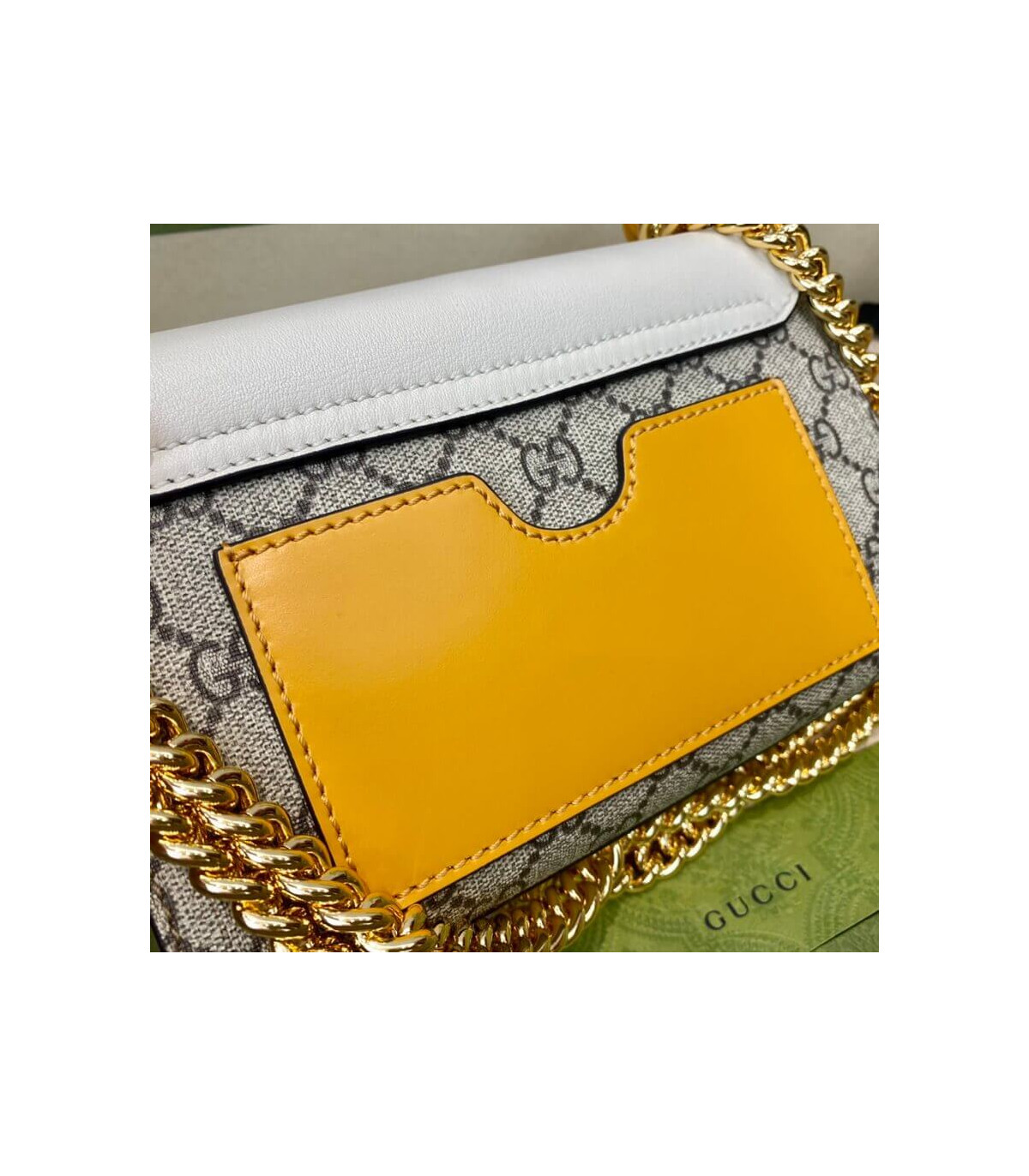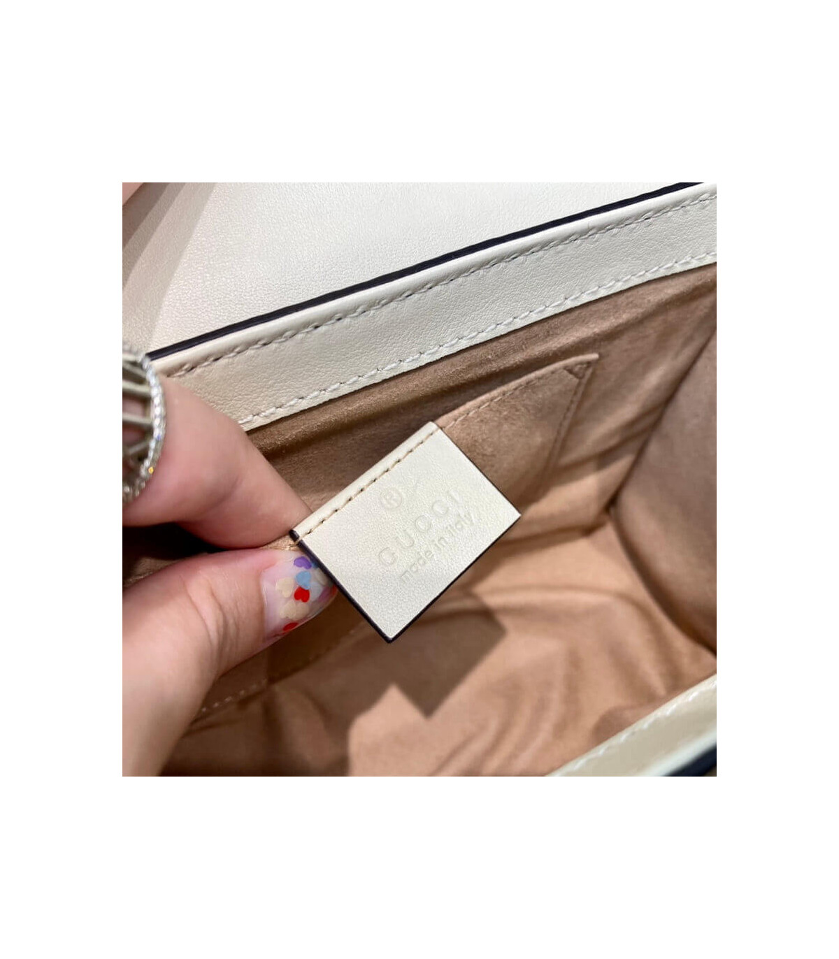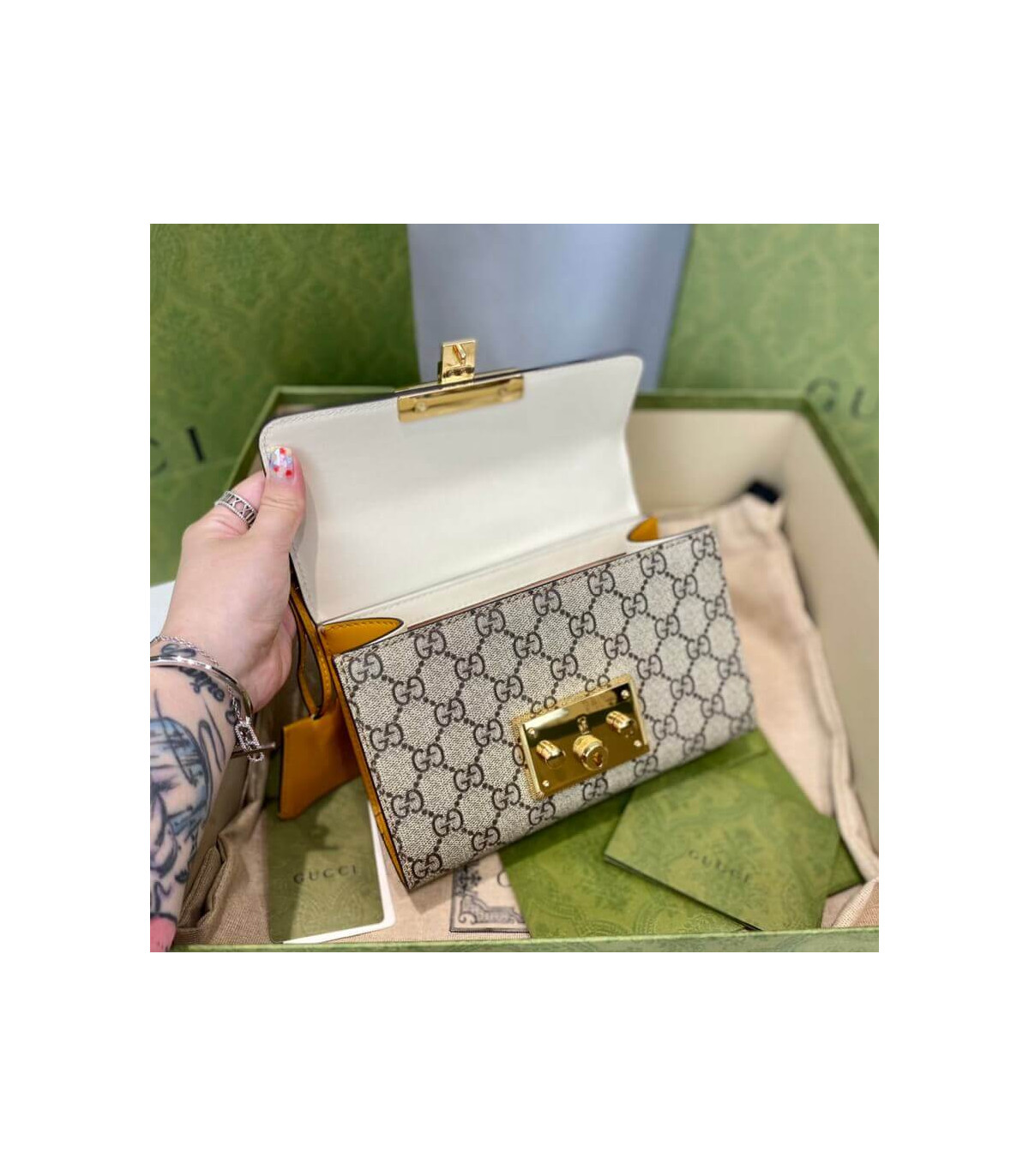 The Padlock’s structured shape is presented in GG Supreme canvas with a white leather upper. Recalling the brand’s origins in the world of leisure and luggage, the small shoulder bag is defined by its padlock closure.